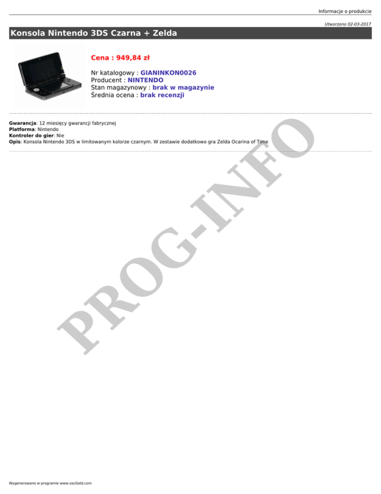 Informacje o produkcie Utworzono 02-03-2017 Konsola Nintendo 3DS Czarna + Zelda Cena : 949,84 zł Nr katalogowy : GIANINKON0026 Producent : NINTENDO Stan magazynowy : brak w magazynie Średnia ocena : brak recenzji PR O G -I N FO Gwarancja: 12 miesięcy gwarancji fabrycznej Platforma: Nintendo Kontroler do gier: Nie Opis: Konsola Nintendo 3DS w limitowanym kolorze czarnym. W zestawie dodatkowo gra Zelda Ocarina of Time Wygenerowano w programie www.oscGold.com