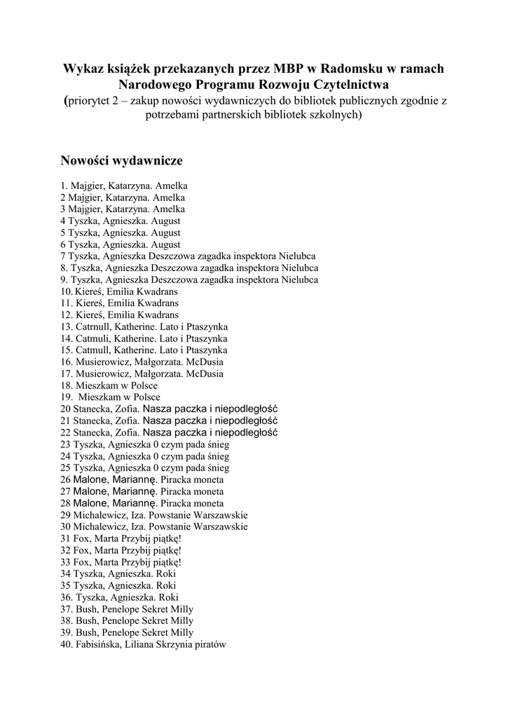 Wykaz książek przekazanych przez MBP w Radomsku w ramach Narodowego Programu Rozwoju Czytelnictwa (priorytet 2 – zakup nowości wydawniczych do bibliotek publicznych zgodnie z potrzebami partnerskich bibliotek szkolnych) Nowości wydawnicze 1. Majgier, Katarzyna. Amelka 2 Majgier, Katarzyna. Amelka 3 Majgier, Katarzyna. Amelka 4 Tyszka, Agnieszka. August 5 Tyszka, Agnieszka. August 6 Tyszka, Agnieszka. August 7 Tyszka, Agnieszka Deszczowa zagadka inspektora Nielubca 8. Tyszka, Agnieszka Deszczowa zagadka inspektora Nielubca 9. Tyszka, Agnieszka Deszczowa zagadka inspektora Nielubca 10. Kiereś, Emilia Kwadrans 11. Kiereś, Emilia Kwadrans 12. Kiereś, Emilia Kwadrans 13. Catrnull, Katherine. Lato i Ptaszynka 14. Catmuli, Katherine. Lato i Ptaszynka 15. Catmull, Katherine. Lato i Ptaszynka 16. Musierowicz, Małgorzata. McDusia 17. Musierowicz, Małgorzata. McDusia 18. Mieszkam w Polsce 19. Mieszkam w Polsce 20 Stanecka, Zofia. Nasza paczka i niepodległość 21 Stanecka, Zofia. Nasza paczka i niepodległość 22 Stanecka, Zofia. Nasza paczka i niepodległość 23 Tyszka, Agnieszka 0 czym pada śnieg 24 Tyszka, Agnieszka 0 czym pada śnieg 25 Tyszka, Agnieszka 0 czym pada śnieg 26 Malone, Mariannę. Piracka moneta 27 Malone, Mariannę. Piracka moneta 28 Malone, Mariannę. Piracka moneta 29 Michalewicz, Iza. Powstanie Warszawskie 30 Michalewicz, Iza. Powstanie Warszawskie 31 Fox, Marta Przybij piątkę! 32 Fox, Marta Przybij piątkę! 33 Fox, Marta Przybij piątkę! 34 Tyszka, Agnieszka. Roki 35 Tyszka, Agnieszka. Roki 36. Tyszka, Agnieszka. Roki 37. Bush, Penelope Sekret Milly 38. Bush, Penelope Sekret Milly 39. Bush, Penelope Sekret Milly 40. Fabisińska, Liliana Skrzynia piratów 41. Fabisińska, Liliana Skrzynia piratów 42. Fabisińska, Liliana Skrzynia piratów 43. Czerwińska-Rydel, Anna. Słońcem na papierze 44.Czerwińska-Rydel, Anna. Słońcem na papierze 45. Czerwińska-Rydel, Anna. Słońcem na papierze 46. McKain, Kelly. Truskawkowe lato 47. McKain, Kelly. Truskawkowe lato 48. McKain, Kelly. Truskawkowe lato 49. Szymborska, Wisława Wystarczy 50. Szymborska, Wisława Wystarczy 51. Fox, Marta. Zołzunie 52. Fox, Marta Zołzunie 53. Fox, Marta Zołzunie 54. Olech, Joanna. Dynastia Miziołków 55. Olech, Joanna. Dynastia Miziołków 56. Travers, Pamela Lyndon Mary Poppins 57. Travers, Pamela Lyndon. Mary Poppins 58. Travers, Pamela Lyndon. Mary Poppins 59. Travers, Pamela Lyndon. Mary Poppins 60. Gortat, Grzegorz Miasteczko ostatnich westchnień 61. Gortat, Grzegorz. Miasteczko ostatnich westchnień 62. Gortat, Grzegorz. Miasteczko ostatnich westchnień 63. Stamps, Caroline. Młody jeździec 64. Gortat, Grzegorz. Nie budź mnie jeszcze 65. Gortat, Grzegorz. Nie budź mnie jeszcze 66. Gortat, Grzegorz. Nie budź mnie jeszcze 67. Łoziński, Mikołaj. Prawdziwa bajka 68 Łoziński, Mikołaj. Prawdziwa bajka 69. Łoziński, Mikołaj. Prawdziwa bajka 70. Tuwimowo 71. Tuwimowo 72. Tuwimowo 73. Kosik, Rafał. Amelia i Kuba 74. Kosik, Rafał. Amelia i Kuba 75. Chotomska, Wanda. Bobry mówią dzień bobry! 76. Chotomska, Wanda. Bobry mówią dzień bobry! 77. Chotomska, Wanda. Bobry mówią dzień bobry! 78. Tuwim, Julian. Cztery ściany wiersza 79. Webb, Holly. Emilka Piórko i skrzynia czarów 80. Webb, Holly. Emilka Piórko i skrzynia czarów 81. Webb, Holly. Emilka Piórko i skrzynia czarów 82. Webb, Holly. Emilka Piórko i tajemnicze lustro 83. Webb, Holly. Emilka Piórko i tajemnicze lustro 84. Webb, Holly. Emilka Piórko i tajemnicze lustro 85. Webb, Holly. Emilka Piórko i zaczarowane drzwi 86. Webb, Holly. Emilka Piórko i zaczarowane drzwi 87. Webb, Holly. Emilka Piórko i zaczarowane drzwi 88. Kosik, Rafał. Felix, Net i Nika oraz nadprogramowe historie 89. Kosik, Rafał. Felix, Net i Nika oraz nadprogramowe historie 90. Kosik, Rafał. Felix, Net i Nika oraz sekret czerwonej 91. Kosik, Rafał. Felix, Net i Nika oraz sekret czerwonej 92. Masłowska, Dorota. Jak zostałam wiedźmą 93. Masłowska, Dorota. Jak zostałam wiedźmą 94. Masłowska, Dorota. Jak zostałam wiedźmą 95. Mortka, Marcin. Morza wszeteczne 96. Mortka, Marcin. Morza wszeteczne 97. Mortka, Marcin. Morza wszeteczne 98. Michałowska, Tamara. Piękne bajki dla kochanych dzieci 99. Michałowska, Tamara. Piękne bajki dla kochanych dzieci 100. Webb, Holly. Sekret Mai 101. Webb, Holly. Sekret Mai 102. Webb, Holly. Sekret Mai 103. Zusak, Markus. Złodziejka książek 104. Zusak, Markus. Złodziejka książek 105. Majgier, Katarzyna. Duch z Niewiadomic T. 1 106. Majgier, Katarzyna. Duch z Niewiadomic T. 1 107. Majgier, Katarzyna. Duch z Niewiadomic T. 1 108. Kinney, Jeff. Dziennik cwaniaczka. Trzeci do pary 109. Kinney, Jeff. Dziennik cwaniaczka. Trzeci do pary 110. Kinney, Jeff. Dziennik cwaniaczka. Trzeci do pary 111. Kinney, Jeff. Dziennik cwaniaczka. Zezowate szczęście 112. Kinney, Jeff. Dziennik cwaniaczka. Zezowate szczęście 113. Kinney, Jeff. Dziennik cwaniaczka. Zezowate szczęście 114. Kinney, Jeff. Dziennik cwaniaczka. Zrób to sam! 115. Kinney, Jeff. Dziennik cwaniaczka. Zrób to sam! 116. Kinney, Jeff. Dziennik cwaniaczka. Zrób to sam! 117. Ostrowska-Biernacka, Katarzyna. Luneta czasu i Konstytucja 3 maja 118. Rusinek, Michał. Rok 1989 119. Rusinek, Michał. Rok 1989 120. Szklarski, Alfred. Tomek w krainie kangurów 121. Szklarski, Alfred. Tomek w krainie kangurów 122. Szklarski, Alfred. Tomek w krainie kangurów 123. Szklarski, Alfred. Tomek w krainie kangurów 124. Szklarski, Alfred. Tomek w krainie kangurów 125. Szklarski, Alfred. Tomek w krainie kangurów 126. Suchorzewska, Irena. Wiersze dla dzieci grzecznych i niegrzecznych 127. Suchorzewska, Irena. Wiersze dla dzieci grzecznych i niegrzecznych 128. Chotomska, Wanda. Wiersze ulubione 129. Chotomska, Wanda. Wiersze ulubione 130. Ciwoniuk, Barbara. Własny pokój 131. Ciwoniuk, Barbara. Własny pokój 132. Ciwoniuk, Barbara. Własny pokój 133. Piątkowska, Renata. Wszystkie moje mamy 134. Piątkowska, Renata. Wszystkie moje mamy 135. 
