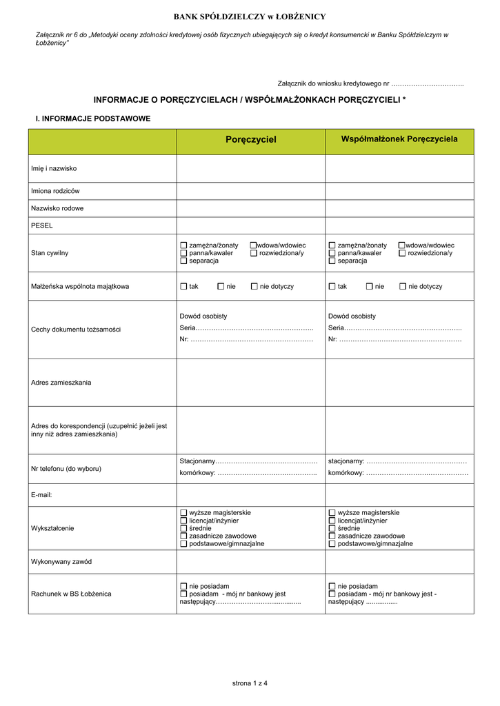 BANK SPÓŁDZIELCZY w ŁOBŻENICY Załącznik nr 6 do „Metodyki oceny zdolności kredytowej osób fizycznych ubiegających się o kredyt konsumencki w Banku Spółdzielczym w Łobżenicy” Załącznik do wniosku kredytowego nr ….……………………….. INFORMACJE O PORĘCZYCIELACH / WSPÓŁMAŁŻONKACH PORĘCZYCIELI * I. INFORMACJE PODSTAWOWE Poręczyciel Współmałżonek Poręczyciela Imię i nazwisko Imiona rodziców Nazwisko rodowe PESEL Stan cywilny zamężna/żonaty panna/kawaler separacja Małżeńska wspólnota majątkowa tak Cechy dokumentu tożsamości nie wdowa/wdowiec rozwiedziona/y nie dotyczy zamężna/żonaty panna/kawaler separacja tak nie wdowa/wdowiec rozwiedziona/y nie dotyczy Dowód osobisty Dowód osobisty Seria…………………………………………….. Seria…………………………………………….. Nr: ……………….……………………………… Nr: ……………….……………………………… Stacjonarny…………………………….………… stacjonarny: ……………………………………… komórkowy: ………………………….………….. komórkowy: ……………………….……………… Adres zamieszkania Adres do korespondencji (uzupełnić jeżeli jest inny niż adres zamieszkania) Nr telefonu (do wyboru) E-mail: Wykształcenie wyższe magisterskie licencjat/inżynier średnie zasadnicze zawodowe podstawowe/gimnazjalne wyższe magisterskie licencjat/inżynier średnie zasadnicze zawodowe podstawowe/gimnazjalne Wykonywany zawód Rachunek w BS Łobżenica nie posiadam posiadam - mój nr bankowy jest następujący……………………................. strona 1 z 4 nie posiadam posiadam - mój nr bankowy jest następujący ................. II. INFORMACJE O DOCHODACH I WYDATKACH Poręczyciel Współmałżonek Poręczyciela Całkowity staż pracy (w latach) właściciel firmy wyższa kadra zarządzająca średnia kadra zarządzająca urzędnik specjalista pracownik inne Stanowisko Miesięczny dochód netto : Źródła dochodu Ilość osób w gosp. (w tym dzieci) właściciel firmy wyższa kadra zarządzająca średnia kadra zarządzająca urzędnik specjalista pracownik inne ..................................... PLN, w tym: ..................................... PLN, w tym: umowa o pracę: .................................... umowa o pracę na czas określony do…….................: ............................... emerytura: ............................................ renta: .................................................... zasiłek przedemerytalny: ...................... wolne zawody: ...................................... działalność gospodarcza: ..................... działalność rolnicza: ............................. umowa cywilno-prawna: ....................... umowa najmu: ...................................... inne: ...................................................... …………………………………………………. liczba osób w gospodarstwie domowym:………………….. liczba dzieci: .................................... umowa o pracę: .................................... umowa o pracę na czas określony do…….................: ............................... emerytura: ............................................ renta: .................................................... zasiłek przedemerytalny: ...................... wolne zawody: ...................................... działalność gospodarcza: ..................... działalność rolnicza: ............................. umowa cywilno-prawna: ....................... umowa najmu: ...................................... inne: ...................................................... …………………………………………………. liczba osób w gospodarstwie domowym:………………….. liczba dzieci: .................................... czynsz: ............................................. czynsz: ............................................. energia elektryczna: ......................... energia elektryczna: ......................... woda: ............................................... woda: .................................................... żywność: ..................... żywność: ..................... utrzymanie samochodu: ................... utrzymanie samochodu: ..................... inne: ............................... inne: ...................................................... Wydatki stałe gosp. domowego Poręczyciel I i Współmałżonek Poręczyciela należą do tego samego gospodarstwa domowego III. INFORMACJE O ZOBOWIAZANIACH Zobowiązania z tytułu kredytów ogółem w tym: limit kredytu Kwota zobowiązania Kwota pozostała do spłaty Rata miesięczna Bank kredyt …………….. kredyt ………………… kredyt ………………… kredyt ………………… Ubiegam się o kredyt/pożyczkę w innym banku: NIE/TAK*: ..................................................................................................................................................................................................................................... ..................................................................................................................................................................................................................................... (nazwa i adres banku, cel kredytu, wnioskowana kwota kredytu i termin spłaty, proponowane zabezpieczenia spłaty kredytu) strona 2 z 4 IV. INFORMACJE O POSIADANYM MAJĄTKU Poręczyciel Status mieszkaniowy Status własności samochodu Oszczędności (kwota, waluta, okres lokaty) właściciel / współwłaściciel domu / mieszkania posiadacz spółdzielczego prawa do lokalu posiadacz spółdzielczego własnościowego prawa do lokalu/domu jednorodzinnego najemca: mieszkania komunalnego mieszkania zakładowego od osoby prywatnej (dom, mieszkanie) od osoby prywatnej (pokój) zami