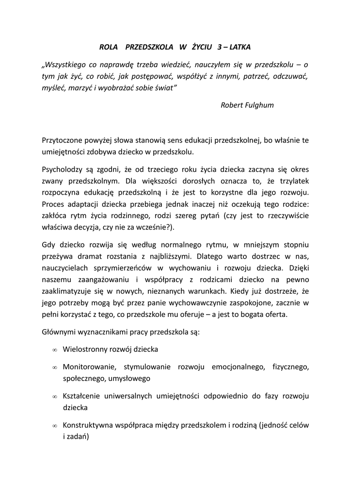 ROLA PRZEDSZKOLA W ŻYCIU 3 – LATKA „Wszystkiego co naprawdę trzeba wiedzieć, nauczyłem się w przedszkolu – o tym jak żyć, co robić, jak postępować, współżyć z innymi, patrzeć, odczuwać, myśleć, marzyć i wyobrażać sobie świat” Robert Fulghum Przytoczone powyżej słowa stanowią sens edukacji przedszkolnej, bo właśnie te umiejętności zdobywa dziecko w przedszkolu. Psycholodzy są zgodni, że od trzeciego roku życia dziecka zaczyna się okres zwany przedszkolnym. Dla większości dorosłych oznacza to, że trzylatek rozpoczyna edukację przedszkolną i że jest to korzystne dla jego rozwoju. Proces adaptacji dziecka przebiega jednak inaczej niż oczekują tego rodzice: zakłóca rytm życia rodzinnego, rodzi szereg pytań (czy jest to rzeczywiście właściwa decyzja, czy nie za wcześnie?). Gdy dziecko rozwija się według normalnego rytmu, w mniejszym stopniu przeżywa dramat rozstania z najbliższymi. Dlatego warto dostrzec w nas, nauczycielach sprzymierzeńców w wychowaniu i rozwoju dziecka. Dzięki naszemu zaangażowaniu i współpracy z rodzicami dziecko na pewno zaaklimatyzuje się w nowych, nieznanych warunkach. Kiedy już dostrzeże, że jego potrzeby mogą być przez panie wychowawczynie zaspokojone, zacznie w pełni korzystać z tego, co przedszkole mu oferuje – a jest to bogata oferta. Głównymi wyznacznikami pracy przedszkola są: • Wielostronny rozwój dziecka • Monitorowanie, stymulowanie rozwoju emocjonalnego, fizycznego, społecznego, umysłowego • Kształcenie uniwersalnych umiejętności odpowiednio do fazy rozwoju dziecka • Konstruktywna współpraca między przedszkolem i rodziną (jedność celów i zadań) • Spontaniczne i zorganizowane wychowanie dziecka realizowane przy współpracy z rówieśnikami i dorosłymi • Zabawa jako główna forma aktywności dziecka przedszkolnego – jej niezależny i twórczy charakter • Pomoc dzieciom w stworzeniu przez nie pozytywnego obrazu samego siebie oraz w zrozumieniu i szanowaniu tych, którzy różnią się rasą, kulturą, sytuacją ekonomiczną. Każda placówka przedszkolna ma na względzie te cele i w oparciu o nie pełni funkcje: opiekuńczą, wychowawczą, dydaktyczną i diagnostyczno – terapeutyczną. Przedszkole wprowadza trzylatka w świat dotąd dla niego obcy. Przede wszystkim uczy go tego, że istnieją inne dzieci i ich potrzeby – zaczyna odbywać się proces socjalizacji malucha. Ponadto dziecko nabywa wiele innych umiejętności i wiadomości o otaczającym go świecie bliższych i dalszych znajomych. Nabywa umiejętności funkcjonowania w grupie rówieśniczej, kształtuje swoją osobowość, próbuje rozumieć i akceptować uczucia innych. Profesjonalnie przygotowana kadra pedagogiczna czuwa nad rozwojem dziecka, jego indywidualizacją, uznaje jego podmiotowość, na którą składają się czynniki takie jak: akceptacja indywidualnych odczuć, pomaganie w realizacji pomysłów dziecka, unikanie sankcji prowadzących do lęku, stawianie zadań na miarę możliwości dziecka, wyrobienie poczucia odpowiedzialności, kształcenie poczucia więzi społecznej i współodpowiedzialności. Powyższe elementy przedszkolnej kultury pedagogicznej i jej oddziaływanie powinny być przenoszone na wychowanie w rodzinie poprzez współpracę rodziców z wychowawcami. Rodzice zawsze mogą zasięgnąć obiektywnej rady, opinii dotyczącej rozwoju ich dziecka. Nauczycielka dobrze zna swoich podopiecznych, to ona stwarza odpowiedni klimat wychowawczy i dydaktyczny. Czasami jako pierwsza odkrywa szczególne zdolności dziecka i dąży do ich rozwijania i doskonalenia. Dostrzega również deficyty w rozwoju dziecka, a wtedy wspólnie z rodzicami stara się pomóc dziecku w jak najlepszy sposób. Praca w grupie odbywa się w oparciu o program nauczania. Dzieci nabywają wiedzę z wielu dziedzin. Opiekunka na kilka godzin nie jest w stanie zaspokoić tych wszystkich potrzeb rozwojowych, gdyż nie posiada tak bogatej bazy dydaktycznej, jaką dysponuje placówka przedszkolna lub fachowego wykształcenia umożliwiającego rozwój wszystkich predyspozycji dziecka. W domu nie jesteśmy w stanie stworzyć grupy rówieśniczej, w której nasze dziecko będzie się realizowało, nawiązywało przyjaźnie, uczyło rozwiązywać konflikty i nabywało umiejętności współżycia z innymi. Wszystko to odbywa się pod życzliwym i wyrozumiałym okiem wychowawczyń, które swoją subtelną działalnością wspomagają rozwój dziecka. W przedszkolu dziecko nauczy się dobrych manier, rozwinie swoją osobowość i talenty. Wszystko to będzie możliwe dzięki współpracy obu środowisk: przedszkolnego i rodzinnego, a także dzięki traktowaniu przedszkola nie jako „przechowalni”, ale jako miejsca bliskiego dziecku i otwartego na jego potrzeby. Dlatego warto zapisać dziecko do przedszkola, spokojnie przetrwać okres adaptacji, nawiązać życzliwy, bezpośredni kontakt z wychowawczynią i obserwować postępy w rozwoju dziecka.
