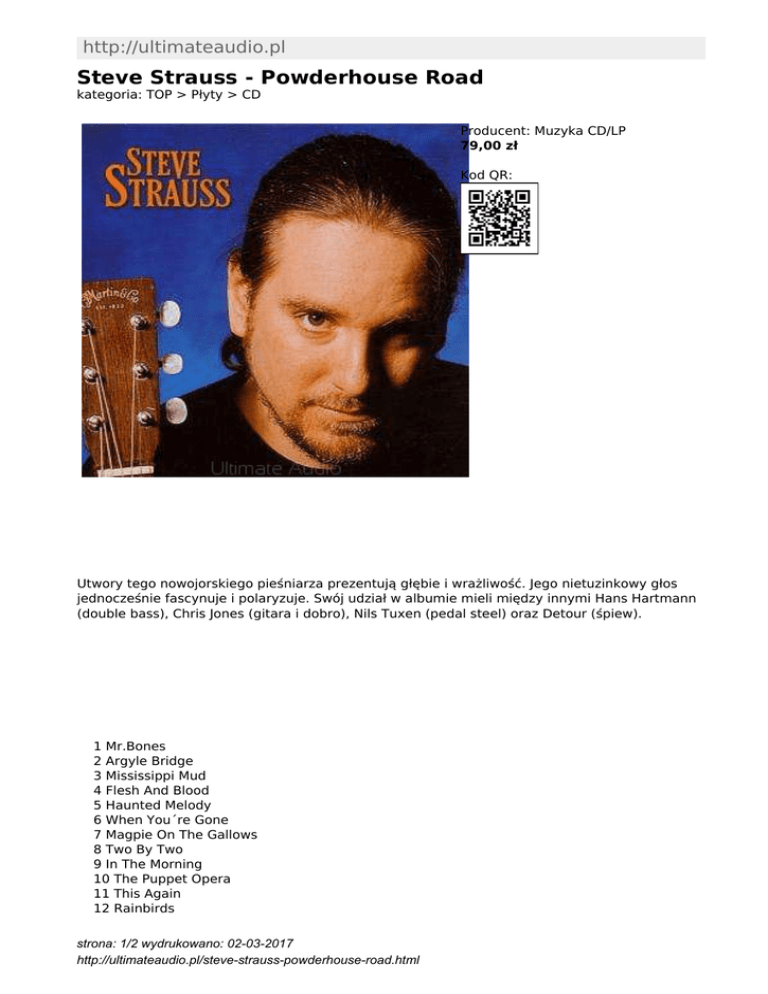 http://ultimateaudio.pl Steve Strauss - Powderhouse Road kategoria: TOP > Płyty > CD Producent: Muzyka CD/LP 79,00 zł Kod QR: Utwory tego nowojorskiego pieśniarza prezentują głębie i wrażliwość. Jego nietuzinkowy głos jednocześnie fascynuje i polaryzuje. Swój udział w albumie mieli między innymi Hans Hartmann (double bass), Chris Jones (gitara i dobro), Nils Tuxen (pedal steel) oraz Detour (śpiew). 1 Mr.Bones 2 Argyle Bridge 3 Mississippi Mud 4 Flesh And Blood 5 Haunted Melody 6 When You´re Gone 7 Magpie On The Gallows 8 Two By Two 9 In The Morning 10 The Puppet Opera 11 This Again 12 Rainbirds strona: 1/2 wydrukowano: 02-03-2017 http://ultimateaudio.pl/steve-strauss-powderhouse-road.html 13 Jerusalem strona: 2/2 wydrukowano: 02-03-2017 http://ultimateaudio.pl/steve-strauss-powderhouse-road.html