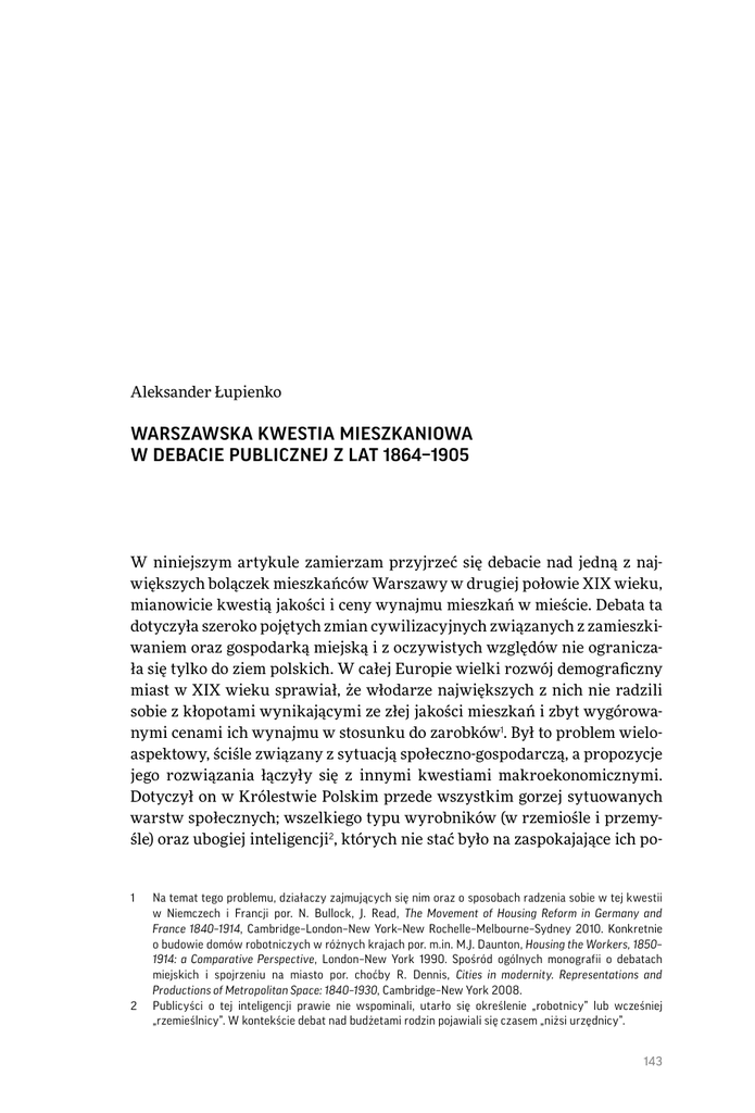 Aleksander Łupienko Warszawska kwestia mieszkaniowa w debacie publicznej z lat 1864–1905 W niniejszym artykule zamierzam przyjrzeć się debacie nad jedną z największych bolączek mieszkańców Warszawy w drugiej połowie XIX wieku, mianowicie kwestią jakości i ceny wynajmu mieszkań w mieście. Debata ta dotyczyła szeroko pojętych zmian cywilizacyjnych związanych z zamieszkiwaniem oraz gospodarką miejską i z oczywistych względów nie ograniczała się tylko do ziem polskich. W całej Europie wielki rozwój demograficzny miast w XIX wieku sprawiał, że włodarze największych z nich nie radzili sobie z kłopotami wynikającymi ze złej jakości mieszkań i zbyt wygórowanymi cenami ich wynajmu w stosunku do zarobków1. Był to problem wieloaspektowy, ściśle związany z sytuacją społeczno-gospodarczą, a propozycje jego rozwiązania łączyły się z innymi kwestiami makroekonomicznymi. Dotyczył on w Królestwie Polskim przede wszystkim gorzej sytuowanych warstw społecznych; wszelkiego typu wyrobników (w rzemiośle i przemyśle) oraz ubogiej inteligencji2, których nie stać było na zaspokajające ich po- 1 2 Na temat tego problemu, działaczy zajmujących się nim oraz o sposobach radzenia sobie w tej kwestii w Niemczech i Francji por. N. Bullock, J. Read, The Movement of Housing Reform in Germany and France 1840–1914, Cambridge–London–New York–New Rochelle–Melbourne–Sydney 2010. Konkretnie o budowie domów robotniczych w różnych krajach por. m.in. M.J. Daunton, Housing the Workers, 1850– 1914: a Comparative Perspective, London–New York 1990. Spośród ogólnych monografii o debatach miejskich i spojrzeniu na miasto por. choćby R. Dennis, Cities in modernity. Representations and Productions of Metropolitan Space: 1840–1930, Cambridge–New York 2008. Publicyści o tej inteligencji prawie nie wspominali, utarło się określenie „robotnicy” lub wcześniej „rzemieślnicy”. W kontekście debat nad budżetami rodzin pojawiali się czasem „niżsi urzędnicy”. 143 Aleksander Łupienko trzeby i zdrowe mieszkanie. Nie obejmował ludności lepiej sytuowanej, ale także żebraków, których w ogóle nie było stać na lokum i których dotyczyła kwestia budowy noclegowni i domów dla biedoty – nieujęta w ramach tego studium. Nie znaczy to, że problemy związane z mieszkaniem nie dotyczyły innych warstw mieszkańców Warszawy. Jak najbardziej dotyczył ich na przykład problem uciążliwego systemu wynajmu lokali, a raczej ich częstych zmian i przeprowadzek, okresów nadmiernej zwyżki komornego czy inne niedogodności mieszkania w wielkim mieście, takie jak hałas dochodzący z ulic i podwórzy do mieszkań3. Kwestia mieszkaniowa wiązała się także ze złym sposobem urządzania lokali, w których względy „reprezentacyjności” kłóciły się z wymogami higienicznymi, jakie pojawiły się w tym czasie. Skupię się tu na kilku aspektach, głównie na jakości budynków oraz cenach mieszkań, jedynie pobieżnie omówię wątki higieniczne, które zasługują na osobne ujęcie. Tematem artykułu będzie więc kwestia mieszkaniowa; taka, jak ją przedstawiali publicyści, głównie na łamach prasy. Kanwą niniejszego wywodu będą artykuły prasowe na ten temat, jakie pojawiały się w badanym okresie. W prasie Królestwa Polskiego, głównie warszawskiej, rzetelnie opisywano bieżący stan dyskusji, wskazywano na ważne artykuły, które ukazały się w innych czasopismach i w prasie codziennej (nieobjętej tu kwerendą), oraz relacjonowano treść odczytów i propozycji wysuwanych na forum publicznym, co często jest dziś jedynym po nich śladem źródłowym. Wybór tytułów prasowych z oczywistych względów musiał być ograniczony, a więc jest nieco subiektywny. Skupiłem się na kwerendzie w czasopismach najbardziej znanych i wpływowych, których publicyści mieli na względzie dobro mieszkańców miasta i miejskiej gospodarki, nie zaś wąsko rozumiane interesy polityczne. Wybrałem takie tytuły jak „Tygodnik Ilustrowany” i „Kłosy” (rubryki kroniki miejskiej oraz artykuły poświęcone w całości temu zagadnieniu). Oprócz tego sięgnąłem po tytuły prasy redagowanej w duchu konserwatywnym („Kronikę Rodzinną” i „Opiekuna Domowego”), pozytywistycznym (wybrałem „Przegląd Tygodniowy” oraz „Niwę” – ta ostatnia zmieniała redakcje, a przy tym i profil „ideologiczny”, niemniej objąłem kwerendą całość pisma) oraz najważniejsze pismo młodszej generacji, mocno zaangażowany społecznie „Głos”. Oprócz tego przejrzałem czasopisma fachowe, takie jak „Przegląd Techniczny”, „Inżenierję i Budownictwo”, „Zdrowie” oraz „Ekonomistę”. Kwerendą objąłem także monografie (zwykle broszury) poświęcone temu tematowi, których część omawiana była na łamach prasy. Autorami tych tekstów byli różnego rodzaju specjaliści i działacze zaangażowani w problemy społeczne miasta, lekarze, prawnicy, dziennikarze, socjologowie i architekci (m.in. Adolf Suligowski, Ludwik Krzywicki, Józef Polak, Józef Tchórznicki, Adam Wiślicki, Jan Heurich, Aleksander Makowiecki). Pominąłem tytuły prasy stricte partyjnej, głównie związanej z PPS oraz endecją, które zaczęły pojawiać się przed 1905 rokiem. 3 144 Zainteresowanych odsyłam do monografii mojego autorstwa: A. Łupienko, Kamienice czynszowe Warszawy 1864–1914, Warszawa 2015. Warszawska kwestia mieszkaniowa w debacie publicznej z lat 1864–1905 Pisząc o debacie na tematy mieszkalnictwa, nie chciałem abstrahować zupełnie od sytuacji, jaka panowała w mieście, choć nie miałem ambicji pełnego jej opisania. Włączenie elementów opisu realiów (a więc tego, co się działo na rynku mieszkaniowym Warszawy) w tekst poświęcony publicystyce (a więc temu, co ludzie pisali i myśleli) nie jest nieporozumieniem. Pozwala ono na częściową weryfikację sensowności przytaczanych w gazetach, broszurach i 
