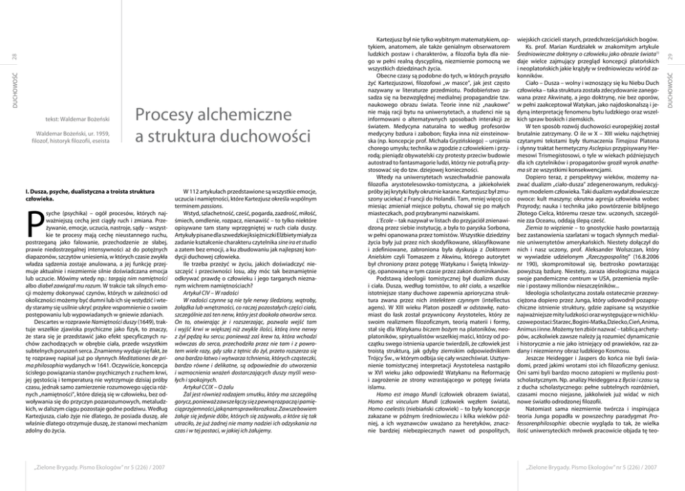 Waldemar Bożeński, ur. 1959, filozof, historyk filozofii, eseista Procesy alchemiczne a struktura duchowości I. Dusza, psyche, dualistyczna a troista struktura człowieka. P syche (psychika) – ogół procesów, których najważniejszą cechą jest ciągły ruch i zmiana. Przeżywanie, emocje, uczucia, nastroje, sądy – wszystkie te procesy mają cechę nieustannego ruchu, postrzeganą jako falowanie, przechodzenie ze słabej, prawie niedostrzegalnej intensywności aż do potężnych diapazonów, szczytów uniesienia, w których czasie zwykła władza sądzenia zostaje anulowana, a jej funkcję przejmuje aktualnie i niezmiernie silnie doświadczana emocja lub uczucie. Mówimy wtedy np.: targają nim namiętności albo diabeł zawiązał mu rozum. W trakcie tak silnych emocji możemy dokonywać czynów, których w zależności od okoliczności możemy być dumni lub ich się wstydzić i wtedy staramy się usilnie ukryć przykre wspomnienie o swoim postępowaniu lub wypowiadanych w gniewie zdaniach. Descartes w rozprawie Namiętności duszy (1649), traktuje wszelkie zjawiska psychiczne jako fizyk, to znaczy, że stara się je przedstawić jako efekt specyficznych ruchów zachodzących w obrębie ciała, przede wszystkim subtelnych poruszeń serca. Znamienny wydaje się fakt, że tę rozprawę napisał już po słynnych Meditationes de prima philosophia wydanych w 1641. Oczywiście, koncepcja ścisłego powiązania stanów psychicznych z ruchem krwi, jej gęstością i temperaturą nie wytrzymuje dzisiaj próby czasu, jednak samo zamierzenie rozumowego ujęcia różnych „namiętności”, które dzieją się w człowieku, bez odwoływania się do przyczyn pozarozumowych, metaludzkich, w dalszym ciągu pozostaje godne podziwu. Według Kartezjusza, ciało żyje nie dlatego, że posiada duszę, ale właśnie dlatego otrzymuje duszę, że stanowi mechanizm zdolny do życia. „Zielone Brygady. Pismo Ekologów” nr 5 (226) / 2007 W 112 artykułach przedstawione są wszystkie emocje, uczucia i namiętności, które Kartezjusz określa wspólnym terminem passions. Wstyd, szlachetność, cześć, pogarda, zazdrość, miłość, śmiech, omdlenie, rozpacz, nienawiść – to tylko niektóre opisywane tam stany wprzęgniętej w ruch ciała duszy. Artykuły pisane dla szwedzkiej księżniczki Elżbiety miały za zadanie kształcenie charakteru czytelnika sine ira et studio a zatem bez emocji, a ku zbudowaniu jak najlepszej kondycji duchowej człowieka. Ile trzeba przeżyć w życiu, jakich doświadczyć nieszczęść i przeciwności losu, aby móc tak beznamiętnie odkrywać prawdę o człowieku i jego targanych nieznanym wichrem namiętnościach? Artykuł CIV – W radości W radości czynne są nie tyle nerwy śledziony, wątroby, żołądka lub wnętrzności, co raczej pozostałych części ciała, szczególnie zaś ten nerw, który jest dookoła otworów serca. On to, otwierając je i rozszerzając, pozwala wejść tam i wyjść krwi w większej niż zwykle ilości, którą inne nerwy z żył pędzą ku sercu; ponieważ zaś krew ta, która wchodzi wówczas do serca, przechodziła przez nie tam i z powrotem wiele razy, gdy szła z tętnic do żył, przeto rozszerza się ona bardzo łatwo i wytwarza tchnienia, których cząsteczki, bardzo równe i delikatne, są odpowiednie do utworzenia i wzmocnienia wrażeń dostarczających duszy myśli wesołych i spokojnych. Artykuł CCIX – O żalu Żal jest również rodzajem smutku, który ma szczególną gorycz, ponieważ zawsze łączy się z pewną rozpaczą i pamięcią przyjemności, jaką nam sprawiła rozkosz. Zawsze bowiem żałuje się jedynie dóbr, których się zażywało, a które się tak utraciło, że już żadnej nie mamy nadziei ich odzyskania na czas i w tej postaci, w jakiej ich żałujemy. „Zielone Brygady. Pismo Ekologów” nr 5 (226) / 2007 29 wiejskich czcicieli starych, przedchrześcijańskich bogów. Ks. prof. Marian Kurdziałek w znakomitym artykule Średniowieczne doktryny o człowieku jako obrazie świata1) daje wielce zajmujący przegląd koncepcji platońskich i neoplatońskich jakie krążyły w średniowieczu wśród zakonników. Ciało – Dusza – wolny i wznoszący się ku Niebu Duch człowieka – taka struktura została zdecydowanie zanegowana przez Akwinatę, a jego doktrynę, nie bez oporów, w pełni zaakceptował Watykan, jako najdoskonalszą i jedyną interpretację fenomenu bytu ludzkiego oraz wszelkich spraw boskich i ziemskich. W ten sposób rozwój duchowości europejskiej został brutalnie zatrzymany. O ile w X – XIII wieku najchętniej czytanymi tekstami były tłumaczenia Timajosa Platona i słynny traktat hermetyczny Asclepius przypisywany Hermesowi Trismegistosowi, o tyle w wiekach późniejszych dla ich czytelników i propagatorów groził wyrok anathema sit ze wszystkimi konsekwencjami. Dopiero teraz, z perspektywy wieków, możemy nazwać dualizm „ciało-dusza” zdegenerowanym, redukcyjnym modelem człowieka. Taki dualizm wydał złowieszcze owoce: kult maszyny; okrutna agresja człowieka wobec Przyrody; nauka i technika jako powtórzenie biblijnego Złotego Cielca, któremu rzesze tzw. uczonych, szczególnie zza Oceanu, oddają ślepą cześć. Ziemia to więzienie – to gnostyckie hasło powtarzają bez zastanowienia szarlatani w togach słynnych medialnie uniwersytetów amerykańskich. Niestety dołączył do nich i nasz uczony, prof. Aleksander Wolszczan, który w wywiadzie udzielonym „Rzeczypospolitej” (16.8.2006 nr 190), skompromitował się, beztrosko powtarzając powyższą bzdurę. Niestety, zaraza ideologiczna mająca swoje pandemiczne centrum w USA, przemienia myślenie i postawy milionów nieszczęśników... Ideologia scholastyczna została ostatecznie przezwyciężona dopiero przez Junga, który udowodnił pozapsychiczne istnienie struktury, gdzie zapisane są wszystkie najważniejsze mity ludzkości oraz występujące w nich kluczowe postaci: Starzec, Bogini-Matka,