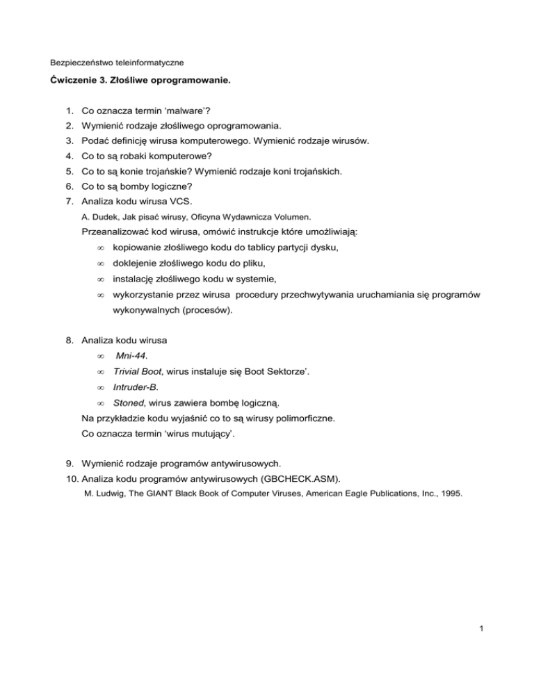 Ćwiczenie 3. Złośliwe oprogramowanie. 1. Co oznacza termin