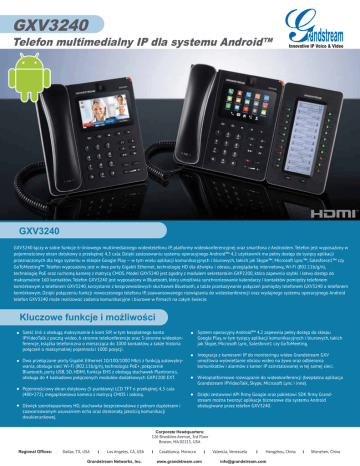 GXV3240 Telefon multimedialny IP dla systemu Android™ Innovative IP Voice & Video ® GXV3240 GXV3240 łączy w sobie funkcje 6-liniowego multimedialnego wideotelefonu IP, platformy wideokonferencyjnej oraz smartfona z Androidem. Telefon jest wyposażony w pojemnościowy ekran dotykowy o przekątnej 4,3 cala. Dzięki zastosowaniu systemu operacyjnego Android™ 4.2 użytkownik ma pełny dostęp do tysięcy aplikacji przeznaczonych dla tego systemu w sklepie Google Play — w tym wielu aplikacji komunikacyjnych i biurowych, takich jak Skype™, Microsoft Lync™, Salesforce1™ czy GoToMeeting™. Telefon wyposażony jest w dwa porty Gigabit Ethernet, technologię HD dla dźwięku i obrazu, przeglądarkę internetową, Wi-Fi (802.11b/g/n), technologię PoE oraz ruchomą kamerę z matrycą CMOS. Model GXV3240 jest zgodny z modułem sekretarskim GXP2200, która zapewnia szybki i łatwy dostęp do maksymalnie 160 kontaktów. Telefon GXV3240 jest wyposażony w Bluetooth, który umożliwia synchronizowanie kalendarzy i kontaktów pomiędzy telefonem komórkowym a telefonem GXV3240, korzystanie z bezprzewodowych słuchawek Bluetooth, a także przekazywanie połączeń pomiędzy telefonem GXV3240 a telefonem komórkowym. Dzięki połączeniu funkcji nowoczesnego telefonu IP, zaawansowanego rozwiązania do wideokonferencji oraz wydajnego systemu operacyjnego Android telefon GXV3240 może realizować zadania komunikacyjne i biurowe w firmach na całym świecie. Kluczowe funkcje i możliwości • Sześć linii z obsługą maksymalnie 6 kont SIP, w tym bezpłatnego konta IPVideoTalk z pocztą wideo, 6-stronne telekonferencje oraz 3-stronne wideokonferencje, książka telefoniczna o mieszcząca do 1000 kontaktów, a także historia połączeń o maksymalnej pojemności 1000 pozycji. • Dwa przełączane porty Gigabit Ethernet 10/100/1000 Mb/s z funkcją autowykrywania, obsługa sieci Wi-Fi (802.11b/g/n), technologia PoE+, połączenie Bluetooth, porty USB, SD, HDMI, funkcja EHS z obsługą słuchawek Plantronics, obsługa do 4 kaskadowo połączonych modułów dodatkowych GXP2200 EXT. • Pojemnościowy ekran dotykowy (5-punktowy) LCD TFT o przekątnej 4,3 cala (480×272), megapikselowa kamera z matrycą CMOS i osłoną. • Dźwięk szerokopasmowy HD, słuchawka bezprzewodowa z pełnym dupleksem i zaawansowanym usuwaniem echa oraz doskonałą jakością komunikacji dwukierunkowej. • System operacyjny Android™ 4.2 zapewnia pełny dostęp do sklepu Google Play, w tym tysięcy aplikacji komunikacyjnych i biurowych, takich jak Skype, Microsoft Lync, Salesforce1 czy GoToMeeting. • Integracja z kamerami IP do monitoringu wideo Grandstream GXV umożliwia wyświetlanie obrazu wideo na żywo oraz odbierania komunikatów i alarmów z kamer IP zainstalowanej w tej samej sieci. • Wieloplatformowe rozwiązanie do wideokonferencji (bezpłatna aplikacja Grandstream IPVideoTalk, Skype, Microsoft Lync i inne). • Dzięki zestawowi API firmy Google oraz pakietowi SDK firmy Grandstream można tworzyć aplikacje biznesowe dla systemu Android obsługiwane przez telefon GXV3240. Corporate Headquarters: 126 Brookline Avenue, 3rd Floor Boston, MA 02215, USA Regional Offices: Dallas, TX, USA I Los Angeles, CA, USA Grandstream Networks, Inc. I Casablanca, Morocco www.grandstream.com I Valencia, Venezuela I Hangzhou, China [email protected] I Shenzhen, China GXV3240 Innovative IP Voice & Video dane techniczne Protokoły i standardy SIP RFC3261, TCP/IP/UDP, RTP/RTCP, HTTP/HTTPS, ARP, ICMP, DNS (rekord A, SRV, NAPTR), DHCP, PPPoE, SSH, Interfejsy sieciowe Dwa przełączane porty 10/100/1000 Mb/s ze zintegrowaną technologią PoE. Ekran graficzny Pojemnościowy ekran dotykowy (5-punktowy) LCD TFT o przekątnej 4,3 cala (480×272). Kamera Ruchoma megapikselowa kamera z matrycą CMOS i osłoną. Komunikacja Bluetooth Tak, zintegrowana. Komunikacja Bluetooth 4.0 + EDR. Wi-Fi Tak, zintegrowana. Obsługa sieci 802.11 b/g/n. Porty urządzeń dodatkowych TFTP, NTP, STUN, SIMPLE, LLDP-MED, LDAP, TR-069, 802.1x, TLS, SRTP. Gniazdo słuchawki RJ9 (zapewnia obsługę funkcji EHS w słuchawkach Plantronics), USB, SD, Mini-HDMI, port modułu dodatkowego. Jedenaście klawiszy funkcyjnych: książka telefoniczna, wstecz, słuchawka, wyciszenie, wstrzymanie, wiadomość, Klawisze funkcyjne Kodery/dekodery głosu przekazanie, konferencja, głośnik, wysłanie/ponowne wybranie numeru, głośność. Trzy klawisze specjalne do obsługi systemu Android strona główna, wstecz. Obsługa protokołów G.711µ/a, G.722 (szerokopasmowy), G.726-32, G.729 (w trakcie opracowywania), iLBC, Opus (w trakcie opracowywania), wybieranie DTMF w paśmie i poza pasmem (audio, RFC2833 oraz SIP INFO). H.264 BP/MP/HP, rozdzielczość obrazu wideo do 480p, do 30 klatek na sekundę, szybkość transmisji do 2 Mb/s, Kodery/dekodery wideo i funkcje wideokonferencja 3-stronna, usuwanie migotania, autofokus i automatyczna ekspozycja, PIP (obraz w obrazie), wyświetlanie komunikatów na ekranie, blokada ustawień kamery, rejestrowanie i zapisywanie zdjęć, rejestracja obrazu wideo, wskaźnik wiadomości głosowej. Wstrzymanie, przekazywanie, przekierowanie (bezwarunkowe/nieodebrane/zajęte), parkowanie/odbieranie połączenia, 6-stronne połączenie konferencyjne, symulacja połączenia współdzielonego (SCA) / symulacja połączenia mostkowego Funkcje telefoniczne (BLA), wirtualny tryb MPK, pobieranie książki telefonicznej (XML, LDAP), połączenie oczekujące, historia połączeń, przycisk wirtualny szef-sekretariat, elastyczny plan wybierania numerów, współdzielenie telefonu (hot desking), personalizowane dzwonki muzyczne, redundancja i przełączanie awaryjne serwera. Skype, Google Hangouts, Microsoft Lync, przeglądarka internetowa, Adobe Flash, Facebook, Twitter, YouTube, Przykładowe aplikacje aktualności, pogoda, giełda, radio internetowe, Pandora, Last.fm, Yahoo Flickr, Photobucket, budzik, Kalendarz Google, import/eksport danych w telefonie kom