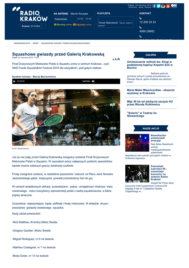 Piątek, 24 czerwca 2016 Imieniny: Jana, Danuty NA ANTENIE Marcin Koczyba Radiostrada Kraków 101.6 MHz Słuchaj online 14:05 - 16:00 Oglądaj online PLAYLISTA KONTAKT Tomek Makowiecki "Szum wiatru i 12 200 33 33 stereo" 4080 (SMS) 500 202 323 (SMS i MMS) RADIOKRAKOW.PL > SPORT > SQUASHOWE GWIAZDY PRZED GALERIĄ KRAKOWSKĄ [email protected] Squashowe gwiazdy przed Galerią Krakowską WIADOMOŚCI KULTURA SPORT PATRONATY WSZYSTKO O DAB+ ▪ ▪ ▪ AAA Piątek, 24 czerwca 2016, 13:52 0 Finał Drużynowych Mistrzostw Polski w Squashu znów w centrum Krakowa , czyli SNS Foods Squash&Art Festival 2016 dla wszystkich i pod gołym niebem Dyrektor tutnieju - Maciej Maciantowicz 00:00:00 NaN:NaN GALERIA Umieszczenie relikwii św. Kingi w podziemnej kaplicy Kopalni Soli w Bochni Relikwie patronki górników solnych zostały przywiezione ze Starego Sącza, gdzie znajduje się założony przez... Maria Mater Misericordiae - otwarcie wystawy w Krakowie Mija 30 lat od zdobycia szczytu K2 przez Wandę Rutkiewicz "Solaris" w Teatrze im. Słowackiego NASZE AKCJE Nowohuckie potańcówki wracają! fot M. Maciantowicz Już po raz piąty przed Galerią Krakowską rozegrany zostanie Finał Drużynowych Mistrzostw Polski w Squashu. W zawodach prócz najlepszych polskich zawodników będzie można zobaczyć graczy światowej czołówki. Finały rozegrane zostaną w niedzielne popoludnie i wieczór na Placu Jana Nowaka Jeziorańskiego gdzie tradycyjnie powstał przeszkolony kort do gry. W ramach dodatkowych atrkacji przewidziano : pokaz umiejętnosci mistrzow trialu rowerowego , mecz koszykarzy reprezentacji polski z kadrą squashowców, a także popisy taneczne. Oczywiście najwazniejsze będą pólfinały i finały mistrzostw. W składzie druzyn prawdziwe gwiazdy światowego squasha. Swój udział potwierdzili: -Nick Matthew, III-krotny Mistrz Świata -Gregory Gaultier, Mistrz Świata -Miguel Rodriguez, nr 6 na świecie -Mathieu Castagnet, nr 7 na świecie -Borja Golan, nr 13 na świecie Nad Zalew Nowohucki wróciły międzypokoleniowe potańcówki. Największy letni parkiet pod gołym niebem w Krakowie zaprasza... Poznański Czerwiec'56 transmisja koncertu na antenie Radia Kraków! Zespół De Press złoży muzyczny hołd uczestnikom Czerwca’56. Zagrają w hali nr 7 Zakładów Hipolita Cegielskiego w... -Emily Whitlock, nr 16 na świecie Najlepsi polscy zawodnicy: -Wojciech Nowisz, III-krotny Mistrz Polski -Marcin Karwowski, III-krotny Mistrz Polski -Mateusz Kotra, Mistrz Polski 2015 i 2016 -Dominika Witkowska, VII-krotna Mistrzyni Polski -Magdalena Kamińska, III-krotna Mistrzyni Polski GB/RK 0% 0% Liczba komentarzy: 0 Napisz swój komentarz KOMENTUJ Twój podpis Słuchaj online Oglądaj online AUDYCJE RAMÓWKA REKLAMA O NAS BLOGI A - Z Wg prowadzących Kraków Tarnów Nowy Sącz Reklamuj się u nas Oferta reklamowa antena Oferta reklamowastrona internetowa Słuchalność i zasięg Zasady zawierania umów na produkcję i/lub emisję reklam obowiązujące w Radio Kraków S.A. Kontakt Cennik Studia nagrań. Jak zarezerwować? Zwiedzanie Radia Kraków Reklamuj się u nas Zarząd Historia Radia Kraków Wydawnictwa Radia Kraków Częstotliwości Fonoteka Koncertowe studio nagrań Radia Kraków z nowym sprzętem i nowymi możliwościami ABC Abonamentu Katarzyna Maciejczyk Jacek Bańka Przemysław Bolechowski Marcin Koczyba Andrzej Kukuczka Krzysztof Orski Małgorzata Nieciecka Mac Wojciech Musiał Beata Penderecka Maciej Skowronek Kraków 101.6 MHz | Tarnów 101,0 MHz | Nowy Sącz 90,0 MHz | Zakopane 100,0 MHz | Andrychów 98,8 MHz | Gorlice 97,4 MHz | Krynica-Zdrój 102,1 MHz | Rabka-Zdrój 87,6 MHz | Szczawnica 90,0 MHz Polityka Prywatnosci | Copyright 2016 Radio Kraków | Projekt i Wykonanie Hoqs