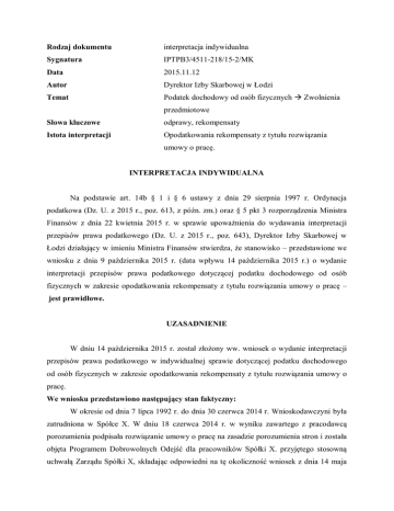 Rodzaj dokumentu interpretacja indywidualna Sygnatura IPTPB3/4511-218/15-2/MK Data 2015.11.12 Autor Dyrektor Izby Skarbowej w Łodzi Temat Podatek dochodowy od osób fizycznych à Zwolnienia przedmiotowe Słowa kluczowe odprawy, rekompensaty Istota interpretacji Opodatkowania rekompensaty z tytułu rozwiązania umowy o pracę. INTERPRETACJA INDYWIDUALNA Na podstawie art. 14b § 1 i § 6 ustawy z dnia 29 sierpnia 1997 r. Ordynacja podatkowa (Dz. U. z 2015 r., poz. 613, z późn. zm.) oraz § 5 pkt 3 rozporządzenia Ministra Finansów z dnia 22 kwietnia 2015 r. w sprawie upoważnienia do wydawania interpretacji przepisów prawa podatkowego (Dz. U. z 2015 r., poz. 643), Dyrektor Izby Skarbowej w Łodzi działający w imieniu Ministra Finansów stwierdza, że stanowisko – przedstawione we wniosku z dnia 9 października 2015 r. (data wpływu 14 października 2015 r.) o wydanie interpretacji przepisów prawa podatkowego dotyczącej podatku dochodowego od osób fizycznych w zakresie opodatkowania rekompensaty z tytułu rozwiązania umowy o pracę – jest prawidłowe. UZASADNIENIE W dniu 14 października 2015 r. został złożony ww. wniosek o wydanie interpretacji przepisów prawa podatkowego w indywidualnej sprawie dotyczącej podatku dochodowego od osób fizycznych w zakresie opodatkowania rekompensaty z tytułu rozwiązania umowy o pracę. We wniosku przedstawiono następujący stan faktyczny: W okresie od dnia 7 lipca 1992 r. do dnia 30 czerwca 2014 r. Wnioskodawczyni była zatrudniona w Spółce X. W dniu 18 czerwca 2014 r. w wyniku zawartego z pracodawcą porozumienia podpisała rozwiązanie umowy o pracę na zasadzie porozumienia stron i została objęta Programem Dobrowolnych Odejść dla pracowników Spółki X. przyjętego stosowną uchwałą Zarządu Spółki X, składając odpowiedni na tę okoliczność wniosek z dnia 14 maja 2014 r. Wpływ na decyzję Wnioskodawczyni o przystąpieniu do Programu miał przede wszystkim pogarszający się stan zdrowia spowodowany wielością przyczyn chorobowych. Umowa o pracę została rozwiązana ze skutkiem na dzień 30 czerwca 2014 r. za porozumieniem stron, na zasadach zapisanych we wspomnianym wyżej Programie Dobrowolnych Odejść dla pracowników Spółki X. Jako podstawę prawną rozwiązania umowy zastosowano art. 30 § 1 pkt 1 Kodeksu pracy w związku z § l ust. 6 Programu Dobrowolnych Odejść dla pracowników Spółki X (zapis § 2 Porozumienia). Na podstawie § 3 ww. Porozumienia i zgodnie z zapisami zawartymi w „Regulaminie w sprawie określenia zasad Programu Dobrowolnych Odejść dla pracowników zatrudnionych w Spółce X” została wypłacona Wnioskodawczyni rekompensata pieniężna z tytułu rozwiązania umowy o pracę, wyliczona zgodnie i na zasadach określonych ww. Regulaminie. Wypłata rekompensaty miała na celu zadośćuczynienie pracownikowi straty w związku z utratą tytułu do zarobkowania, a w następstwie brakiem możliwości dalszego osiągania wynagrodzenia u dotychczasowego pracodawcy. Wnioskodawczyni dodaje, że regulamin w sprawie określenia zasad Programu Dobrowolnych Odejść pracowników zatrudnionych w Spółce X jest regulaminem w rozumieniu art. 9 § 1 ustawy z dnia 26 czerwca 1974 r. Kodeks pracy (Dz. U. z 2014 r., poz. 1502), ponieważ reguluje prawa i obowiązki obydwu stron stosunku pracy, tj. pracodawcy oraz pracowników. Wysokość i zasady ustalenia otrzymanej rekompensaty wynikają bezpośrednio z faktu objęcia Programem Dobrowolnych Odejść Pracowników Spółki X i postanowień w nim zawartych. Rekompensata owa została wypłacona zgodnie z terminami ustalonymi w Programie, w dwóch ratach, tj. w dniu 11 lipca 2014 r. i w dniu 22 grudnia 2014 r. Od wypłaconych kwot rekompensaty pracodawca odprowadził zaliczki na podatek dochodowy od osób fizycznych, które pracodawca ujął w informacji rocznej PIT-11, w pozycji inne źródła (przychód = dochód i zaliczka). Nadto, w związku z doliczeniem przez pracodawcę kwoty wypłaconej rekompensaty do łącznego dochodu jako podlegającego opodatkowaniu, nastąpiło przekroczenie pierwszego progu dochodowego skutkujące koniecznością odpowiedniej dopłaty podatku na rzecz urzędu skarbowego. I takowa dopłata została dokonana. W związku z powyższym opisem zadano następujące pytanie: Czy kwoty wypłacone Wnioskodawczyni tytułem rekompensaty w 2014 r. z tytułu rozwiązania umowy o pracę na podstawie i zasadach Programu Dobrowolnych Odejść dla Pracowników Spółki X korzystają ze zwolnienia przedmiotowego wymienionego w przywołanym wyżej art. 21 ust. 1 pkt 3 ustawy o podatku dochodowym od osób fizycznych, w związku z czym czy przysługuje prawo do wystąpienia z wnioskiem o stwierdzenie nadpłaty do właściwego naczelnika urzędu skarbowego i zwrot podatku. Zdaniem Wnioskodawczyni, w świetle stanu faktycznego sprawy, wypłacona rekompensata wynikająca z zawartego porozumienia ze związkami zawodowymi będąca w istocie odszkodowaniem wypłaconym w związku z ustaniem zatrudnienia i utratą źródła zarobkowania mieści się w wykazie zwolnień zawartych w art. 21 ust. 1 pkt 3 ustawy o podatku dochodowym od osób fizycznych, powołanej we wniosku jako, że odszkodowanie to wynikające wprost z porozumienia zbiorowego oraz z uwagi na brak w katalogu wyjątków go wykluczających korzysta ze zwolnienia od opodatkowania podatkiem dochodowym od osób fizycznych. Od odszkodowania nazwanego rekompensatą wypłaconego w 2014 r. pobrana została zaliczka na podatek dochodowy, a wartość pobranej zaliczki została wykazana w PIT11. Zdaniem Wnioskodawczyni, biorąc pod uwagę meritum sprawy i w świetle obowiązującego w dacie zdarzenia stanu prawnego w przedmiotowym zakresie, wypłacona Wnioskodawczyni rekompensata w związku z rozwiązaniem umowy o pracę, wynikająca wprost z porozumienia zbiorowego jest wolna od podatku dochodowego od osób fizycznych, mieszcząc się w katalogu wyłączeń, o których mowa w przywołanym wyżej 