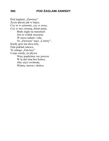 590. POD ŻAGLAMI ZAWISZY Pod żaglami „Zawiszy” Życie płynie jak w bajce, Czy to w sztormie, czy w ciszy, Czy w noc ciemną, dzień jasny. Białe żagle na masztach Jest to widok mocarny. W sercu radość i siła, To „Zawisza” nasz „Czarny”. Kiedy grot ma dwa refy, Fala pokład zalewa, To załoga „Zawiszy” Czuje wtedy, że pływa. Więc popłyńmy raz jeszcze W tę dal siną bez końca, Aby użyć swobody, Wiatru, morza i słońca.