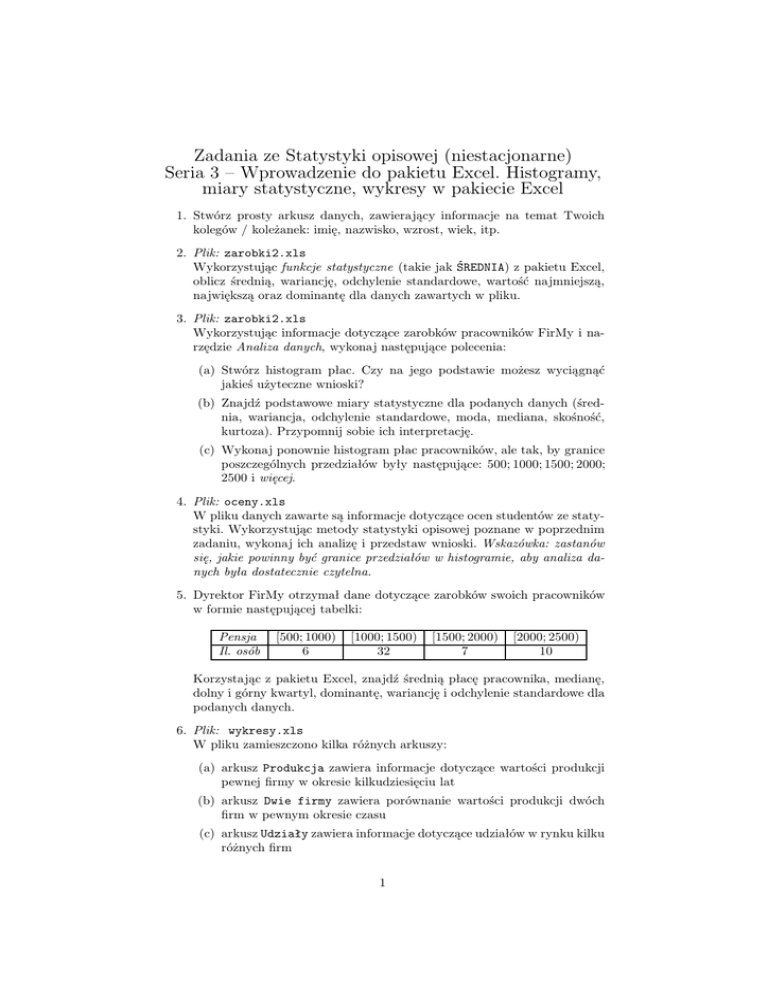 Zadania ze Statystyki opisowej (niestacjonarne) Seria 3 – Wprowadzenie do pakietu Excel. Histogramy, miary statystyczne, wykresy w pakiecie Excel 1. Stwórz prosty arkusz danych, zawierający informacje na temat Twoich kolegów / koleżanek: imię, nazwisko, wzrost, wiek, itp. 2. Plik: zarobki2.xls Wykorzystując funkcje statystyczne (takie jak ŚREDNIA) z pakietu Excel, oblicz średnią, wariancję, odchylenie standardowe, wartość najmniejszą, największą oraz dominantę dla danych zawartych w pliku. 3. Plik: zarobki2.xls Wykorzystując informacje dotyczące zarobków pracowników FirMy i narzędzie Analiza danych, wykonaj następujące polecenia: (a) Stwórz histogram płac. Czy na jego podstawie możesz wyciągnąć jakieś użyteczne wnioski? (b) Znajdź podstawowe miary statystyczne dla podanych danych (średnia, wariancja, odchylenie standardowe, moda, mediana, skośność, kurtoza). Przypomnij sobie ich interpretację. (c) Wykonaj ponownie histogram płac pracowników, ale tak, by granice poszczególnych przedziałów były następujące: 500; 1000; 1500; 2000; 2500 i więcej. 4. Plik: oceny.xls W pliku danych zawarte są informacje dotyczące ocen studentów ze statystyki. Wykorzystując metody statystyki opisowej poznane w poprzednim zadaniu, wykonaj ich analizę i przedstaw wnioski. Wskazówka: zastanów się, jakie powinny być granice przedziałów w histogramie, aby analiza danych była dostatecznie czytelna. 5. Dyrektor FirMy otrzymał dane dotyczące zarobków swoich pracowników w formie następującej tabelki: Pensja Il. osób [500; 1000) 6 [1000; 1500) 32 [1500; 2000) 7 [2000; 2500) 10 Korzystając z pakietu Excel, znajdź średnią płacę pracownika, medianę, dolny i górny kwartyl, dominantę, wariancję i odchylenie standardowe dla podanych danych. 6. Plik: wykresy.xls W pliku zamieszczono kilka różnych arkuszy: (a) arkusz Produkcja zawiera informacje dotyczące wartości produkcji pewnej firmy w okresie kilkudziesięciu lat (b) arkusz Dwie firmy zawiera porównanie wartości produkcji dwóch firm w pewnym okresie czasu (c) arkusz Udziały zawiera informacje dotyczące udziałów w rynku kilku różnych firm 1 (d) arkusz Dochód Australii zawiera dane dotyczące źródeł dochodu Australii w roku 1997 Za pomocą narzędzia Wstaw / Wykres postaraj się zilustrować podane dane. Dobierz odpowiednie typy wykresów, zwracając uwagę na stopień przejrzystości dla osoby oglądającej wyniki. Postaraj się przedstawić dane z każdego arkusza na kilka różnych sposobów. 10 lutego 2009 2