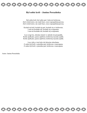 Był sobie król – Janina Porazińska Był sobie król, był sobie paź i była też królewna. Żyli wśród mórz, nie znali burz, rzecz najzupełniej pewna. Żyli wśród mórz, nie znali burz, rzecz najzupełniej pewna. Kochał się król, kochał się paź, kochali się w królewnie. I ona też kochała ich, kochali się wzajemnie. I ona też kochała ich, kochali się wzajemnie. Lecz srogi los, okrutna śmierć w udziale im przypadła, Króla zjadł pies, pazia zjadł kot, królewnę myszka zjadła. Króla zjadł pies, pazia zjadł kot, królewnę myszka zjadła. Lecz żeby ci nie było żal dziecino ukochana, Z cukru był król, z piernika paź, królewna z marcepana, Z cukru był król, z piernika paź, królewna z marcepana. Autor: Janina Porazińska
