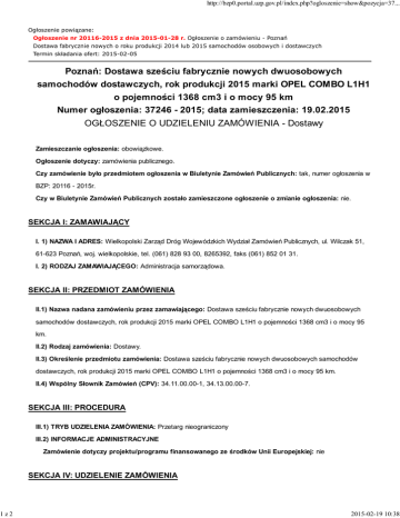 1z2 http://bzp0.portal.uzp.gov.pl/index.php?ogloszenie=show&pozycja=37... Ogłoszenie powiązane: Ogłoszenie nr 20116-2015 z dnia 2015-01-28 r. Ogłoszenie o zamówieniu - Poznań Dostawa fabrycznie nowych o roku produkcji 2014 lub 2015 samochodów osobowych i dostawczych Termin składania ofert: 2015-02-05 Poznań: Dostawa sześciu fabrycznie nowych dwuosobowych samochodów dostawczych, rok produkcji 2015 marki OPEL COMBO L1H1 o pojemności 1368 cm3 i o mocy 95 km Numer ogłoszenia: 37246 - 2015; data zamieszczenia: 19.02.2015 OGŁOSZENIE O UDZIELENIU ZAMÓWIENIA - Dostawy Zamieszczanie ogłoszenia: obowiązkowe. Ogłoszenie dotyczy: zamówienia publicznego. Czy zamówienie było przedmiotem ogłoszenia w Biuletynie Zamówień Publicznych: tak, numer ogłoszenia w BZP: 20116 - 2015r. Czy w Biuletynie Zamówień Publicznych zostało zamieszczone ogłoszenie o zmianie ogłoszenia: nie. SEKCJA I: ZAMAWIAJĄCY I. 1) NAZWA I ADRES: Wielkopolski Zarząd Dróg Wojewódzkich Wydział Zamówień Publicznych, ul. Wilczak 51, 61-623 Poznań, woj. wielkopolskie, tel. (061) 828 93 00, 8265392, faks (061) 852 01 31. I. 2) RODZAJ ZAMAWIAJĄCEGO: Administracja samorządowa. SEKCJA II: PRZEDMIOT ZAMÓWIENIA II.1) Nazwa nadana zamówieniu przez zamawiającego: Dostawa sześciu fabrycznie nowych dwuosobowych samochodów dostawczych, rok produkcji 2015 marki OPEL COMBO L1H1 o pojemności 1368 cm3 i o mocy 95 km. II.2) Rodzaj zamówienia: Dostawy. II.3) Określenie przedmiotu zamówienia: Dostawa sześciu fabrycznie nowych dwuosobowych samochodów dostawczych, rok produkcji 2015 marki OPEL COMBO L1H1 o pojemności 1368 cm3 i o mocy 95 km. II.4) Wspólny Słownik Zamówień (CPV): 34.11.00.00-1, 34.13.00.00-7. SEKCJA III: PROCEDURA III.1) TRYB UDZIELENIA ZAMÓWIENIA: Przetarg nieograniczony III.2) INFORMACJE ADMINISTRACYJNE Zamówienie dotyczy projektu/programu finansowanego ze środków Unii Europejskiej: nie SEKCJA IV: UDZIELENIE ZAMÓWIENIA 2015-02-19 10:38 2z2 http://bzp0.portal.uzp.gov.pl/index.php?ogloszenie=show&pozycja=37... IV.1) DATA UDZIELENIA ZAMÓWIENIA: 19.02.2015. IV.2) LICZBA OTRZYMANYCH OFERT: 3. IV.3) LICZBA ODRZUCONYCH OFERT: . IV.4) NAZWA I ADRES WYKONAWCY, KTÓREMU UDZIELONO ZAMÓWIENIA: DOMCAR Sp. z o.o., ul. Spółdzielnia 9a, 62-510 Konin, kraj/woj. wielkopolskie. IV.5) Szacunkowa wartość zamówienia (bez VAT): 519024,39 PLN. IV.6) INFORMACJA O CENIE WYBRANEJ OFERTY ORAZ O OFERTACH Z NAJNIŻSZĄ I NAJWYŻSZĄ CENĄ Cena wybranej oferty: 342666,00 Oferta z najniższą ceną: 342666,00 / Oferta z najwyższą ceną: 383391,00 Waluta: PLN. 2015-02-19 10:38