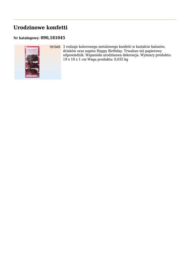 Urodzinowe konfetti Nr katalogowy: 090,181045 3 rodzaje kolorowego metalowego konfetti w kształcie balonów, drinków oraz napisu Happy Birthday. Trwalsze niż papierowy odpowiednik. Wspaniała urodzinowa dekoracja. Wymiary produktu: 19 x 10 x 1 cm Waga produktu: 0,035 kg