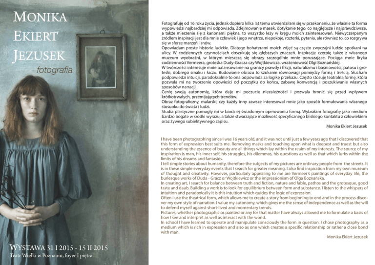 MONIKA EKIERT JEZUSEK fotografia Fotografuję od 16 roku życia, jednak dopiero kilka lat temu utwierdziłam się w przekonaniu, że właśnie ta forma wypowiedzi najbardziej mi odpowiada. Zdejmowanie masek, dotykanie tego, co najgłębsze i najprawdziwsze, a także mierzenie się z kanonami piękna, to wszystko leży w kręgu moich zainteresowań. Niewyczerpanym źródłem inspiracji jest dla mnie człowiek i jego wnętrze, niepokoje, rozterki, pytania, ale również to, co rozgrywa się w sferze marzeń i snów. Opowiadam proste historie ludzkie. Dlatego bohaterami moich zdjęć są często zwyczajni ludzie spotkani na ulicy. W codziennych czynnościach doszukuję się głębszych znaczeń. Inspiracje czerpię także z własnego muzeum wyobraźni, w którym mieszczą się obrazy szczególnie mnie poruszające. Pociąga mnie liryka codzienności Vermeera, groteska Dudy-Gracza czy Wojtkiewicza, wrażeniowość Olgi Boznańskiej. W twórczości interesuje mnie balansowanie na granicy prawdy i fikcji, naturalizmu i baśniowości, patosu i groteski, dobrego smaku i kiczu. Budowanie obrazu to szukanie równowagi pomiędzy formą i treścią. Słucham podpowiedzi intuicji, paradoksalnie to ona odpowiada za logikę przekazu. Często stosuję teatralną formę, która pozwala mi na tworzenie opowieści od początku do końca, zabawę konwencją i poszukiwanie własnych sposobów narracji. Cenię swoją autonomię, która daje mi poczucie niezależności i pozwala bronić się przed wpływem krótkotrwałych, przemijających trendów. Obraz fotograficzny, malarski, czy każdy inny zawsze interesował mnie jako sposób formułowania własnego stosunku do świata i ludzi. Studia plastyczne pomogły mi w bardziej świadomym operowaniu formą. Wybrałam fotografię jako medium bardzo bogate w środki wyrazu, a także stwarzające możliwość specyficznego bliskiego kontaktu z człowiekiem oraz żywego subiektywnego zapisu. Monika Ekiert Jezusek I have been photographing since I was 16 years old, and it was not until just a few years ago that I discovered that this form of expression best suits me. Removing masks and touching upon what is deepest and truest but also understanding the essence of beauty are all things which lay within the realm of my interests. The source of my inspiration is man, his inner self, his struggles, his dilemmas, his questions as well as that which lurks within the limits of his dreams and fantasies. I tell simple stories about humanity, therefore the subjects of my pictures are ordinary people from the streets. It is in these simple everyday events that I search for greater meaning. I also find inspiration from my own museum of thought and creativity. However, particularly appealing to me are Vermeer’s paintings of everyday life, the burlesque works of Duda - Gracz or Wojtkiewicz or the impressionism of Olga Boznańska. In creating art, I search for balance between truth and fiction, nature and fable, pathos and the grotesque, good taste and daub. Building a work is to look for equilibrium between form and substance. I listen to the whispers of intuition and paradoxically it is this intuition which guides the logic of expression. Often I use the theatrical form, which allows me to create a story from beginning to end and in the process discover my own style of narration. I value my autonomy, which gives me the sense of independence as well as the will to defend myself against short-lived and momentary trends. Pictures, whether photographic or painted or any for that matter have always allowed me to formulate a basis of how I see and interpret as well as interact with the world. In school I have learned to operate and manipulate consciously the form in question. I chose photography as a medium which is rich in expression and also as one which creates a specific relationship or rather a close bond with man. Monika Ekiert Jezusek WYSTAWA 31 I 2015 - 15 II 2015 Teatr Wielki w Poznaniu, foyer I piętra Maja Wolniewska IMPRESJE MONIKI EKIERT JEZUSEK Subtelność, delikatność chwili. Piękno wrażenia, które zwykle ignorujemy, pogrążając się w codziennej pogoni za tym, co niby – ważne, niby – konieczne. Zapominamy o małych radościach, jak odgłos bębniących w szyby kropli deszczu, jak uśmiech staruszki, handlującej purpurowymi śliwkami. O głębi spojrzenia drugiego człowieka, o własnych, głęboko skrywanych tęsknotach i pragnieniach. Prace Moniki Ekiert Jezusek przypominają o utraconych radościach, o cieple, które emanuje z głębi ludzkiego serca. Bohaterkami prac artystki są przede wszystkim kobiety. Młode, stare, zmęczone, przytłoczone przez życie. Patrzą głęboko w oczy widza, szukając niezaznanego dotąd zrozumienia. Mimo to ciężko nazwać prace Ekiert Jezusek sztuką feministyczną. Artystka koncentruje się na głównie na analizie kobiecej psychiki i przeżyć, robi to jednak w sposób subtelny i niezwykle poetycki. Nie znaczy to, że impresje artystki tratują jedynie o rzeczach błahych – delikatne, snute niczym pajęczyna historie, poruszają widza, skłaniają ku refleksji nad pewnym rodzajem tabu, jakim jest miejsce kobiety we współczesnym świecie. Z fotografii patrzą więc matka dwójki szczęśliwych chłopców, oplątana podczas zabawy motkiem wełny. Nitki krepują bohaterkę, ograniczają jej ruchy – przedmiot dotycz as kojarzony z ciepłem domowego ogniska, z wełnianym szalikiem, staje się więc narzędziem tortur, ograniczającym normalne życie. Pozbawiona wolności, przywiązana przez dzieci do krzesła; centrum domowego ogniska staje się tym samym więzieniem, dusznym, ciasnym, obezwładniającym. Kobieta odwraca wzrok, nie patrzy na widza i chłopców, jest zdezorientowana i niepewna. Nikt nie przychodzi jednak na ratunek. Prace Ekiert Jezusek to swoiste pocztówki życia, przejmujące, wnikające w duszę widza. Nie brak im także optymizmu – pośród licznych historii znaleźć można drogocenne okruch