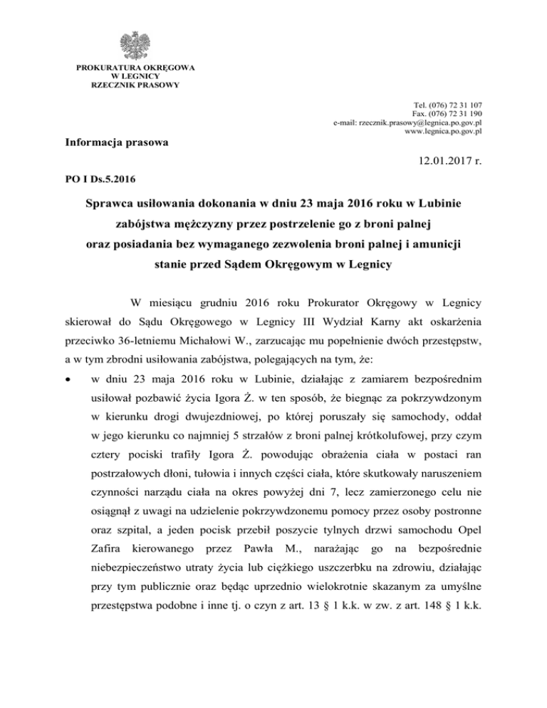 PROKURATURA OKRĘGOWA W LEGNICY RZECZNIK PRASOWY Tel. (076) 72 31 107 Fax. (076) 72 31 190 e-mail: [email protected] www.legnica.po.gov.pl Informacja prasowa 12.01.2017 r. PO I Ds.5.2016 Sprawca usiłowania dokonania w dniu 23 maja 2016 roku w Lubinie zabójstwa mężczyzny przez postrzelenie go z broni palnej oraz posiadania bez wymaganego zezwolenia broni palnej i amunicji stanie przed Sądem Okręgowym w Legnicy W miesiącu grudniu 2016 roku Prokurator Okręgowy w Legnicy skierował do Sądu Okręgowego w Legnicy III Wydział Karny akt oskarżenia przeciwko 36-letniemu Michałowi W., zarzucając mu popełnienie dwóch przestępstw, a w tym zbrodni usiłowania zabójstwa, polegających na tym, że: w dniu 23 maja 2016 roku w Lubinie, działając z zamiarem bezpośrednim usiłował pozbawić życia Igora Ż. w ten sposób, że biegnąc za pokrzywdzonym w kierunku drogi dwujezdniowej, po której poruszały się samochody, oddał w jego kierunku co najmniej 5 strzałów z broni palnej krótkolufowej, przy czym cztery pociski trafiły Igora Ż. powodując obrażenia ciała w postaci ran postrzałowych dłoni, tułowia i innych części ciała, które skutkowały naruszeniem czynności narządu ciała na okres powyżej dni 7, lecz zamierzonego celu nie osiągnął z uwagi na udzielenie pokrzywdzonemu pomocy przez osoby postronne oraz szpital, a jeden pocisk przebił poszycie tylnych drzwi samochodu Opel Zafira kierowanego przez Pawła M., narażając go na bezpośrednie niebezpieczeństwo utraty życia lub ciężkiego uszczerbku na zdrowiu, działając przy tym publicznie oraz będąc uprzednio wielokrotnie skazanym za umyślne przestępstwa podobne i inne tj. o czyn z art. 13 § 1 k.k. w zw. z art. 148 § 1 k.k. i art. 157 § 1 k.k i art. 160 § 1 k.k. w zw. z art. 11 § 2 k.k. w zw. z art. 57a § 1 k.k. k.k. w zw. z art. 64 § 2 k.k. w dniu 23 maja 2016 roku w Lubinie posiadał bez wymaganego zezwolenia broń palną fabryczną typu Luger, kaliber 9 mm oraz amunicję w postaci co najmniej 6 naboi kaliber 9 mm, tj. o czyn z art. 263 § 2 k.k. W świetle licznych zgromadzonych w toku śledztwa dowodów przebieg zdarzenia był następujący. W dniu 23 maja 2016 roku około godz.15.30 w Lubinie przed budynek jednego z zakładów pogrzebowych podjechał samochód marki BMW koloru czarnego, a za nim samochód marki Mercedes koloru srebrnego. Z samochodów tych wysiedli mężczyźni, po czym kierowca samochodu BMW, Igor Ż., zaczął pieszo uciekać w kierunku drogi dwujezdniowej, natomiast kierowca Mercedesa, Michał W. , zaczął do niego strzelać z posiadanej broni palnej, oddając co najmniej 5 strzałów, z których cztery trafiły uciekającego. Jeden pocisk trafił w przejeżdżający przypadkiem w tym miejscu samochód marki Opel Zafira kierowany przez Pawła M. W trakcie ucieczki Igor Ż. zatrzymał samochód Volkswagen Transporter, którego kierowca zawiózł go z ranami postrzałowymi do szpitala w Lubinie, gdzie udzielono temu pokrzywdzonemu pomocy medycznej. W tym czasie Michał W. uciekł z miejsca zdarzenia samochodem marki Mercedes, którym wcześniej przyjechał na to miejsce Samochód ten Policja ujawniła po zdarzeniu w miejscu zamieszkania oskarżonego. W następstwie oddanych strzałów z broni palnej pokrzywdzony Igor Ż. doznał ran postrzałowych różnych części ciała, które zgodnie z opinią powołanego biegłego lekarza z zakresu medycyny sądowej spowodowały naruszenie czynności narządu ciała na okres powyżej dni 7. Na miejscu zdarzenia przeprowadzono oględziny, w czasie których ujawniono i zabezpieczono pięć łusek oraz jeden pocisk. W toku śledztwa nie znaleziono użytej w czasie przestępstwa broni palnej. Z uzyskanej opinii balistycznej wykonanej w Centralnym Laboratorium Kryminalistycznym Policji w Warszawie wynika, że wszystkie łuski pochodzą od odstrzelonego naboju pistoletowego kal.9 mm Luger jednego egzemplarza broni palnej. Ustalenie, że strzelającym był oskarżony Michał W. oparto na wielu dowodach, a w tym na ustalonym bezpośrednio po zdarzeniu numerze rejestracyjnym samochodu, którym poruszał się oskarżony oraz na licznych uzyskanych w śledztwie opiniach biegłych: z zakresu badań chemicznych, z zakresu badania broni i balistyki, opiniach genetycznych, opinii daktyloskopijnej i innych wydanych na podstawie ujawnionych i zabezpieczonych w śledztwie śladach i dowodach oraz materiale porównawczym pobranym od oskarżonego. Michał W. w toku całego śledztwa odmówił składania wyjaśnień. Nie ujawnił więc motywów swojego działania. Także zeznania pokrzywdzonego Igora Ż. nie przybliżyły motywu, którym kierował się oskarżony usiłując dokonać jego zabójstwa. Oskarżony był w przeszłości wielokrotnie karany za różne przestępstwa, a w tym w okresie od 14 września 2006 roku do 14 września 2014 roku odbył karę 8 lat pozbawienia wolności, między innymi za dokonanie rozboju przy posłużeniu się niebezpiecznym narzędziem i uszkodzenie ciała w warunkach recydywy z art. 64 § 1 k.k. oraz inne przestępstwa. Wcześniej oskarżony odbył karę 3 lat pozbawienia wolności orzeczoną innym wyrokiem między innymi za przestępstwo posiadania bez wymaganego zezwolenia broni palnej Michał W. od początku śledztwa w niniejszej sprawie jest tymczasowo aresztowany. Za zbrodnię usiłowania zabójstwa grozi oskarżonemu kara pozbawienia wolności na czas nie krótszy od lat 8, kara 25 lat pozbawienia wolności albo kara dożywotniego pozbawienia wolności. Sąd wymierza bowiem karę za usiłowanie w granicach zagrożenia przewidzianego dla danego przestępstwa, a zatem w tej sprawie w granicach zagrożenia przewidzianego dla zbrodni zabójstwa . Przestępstwo posiadania broni palnej i amunicji bez wymaganego zezwolenia zagrożone jest karą od 6 miesięcy do 8 lat pozbawienia wolności.