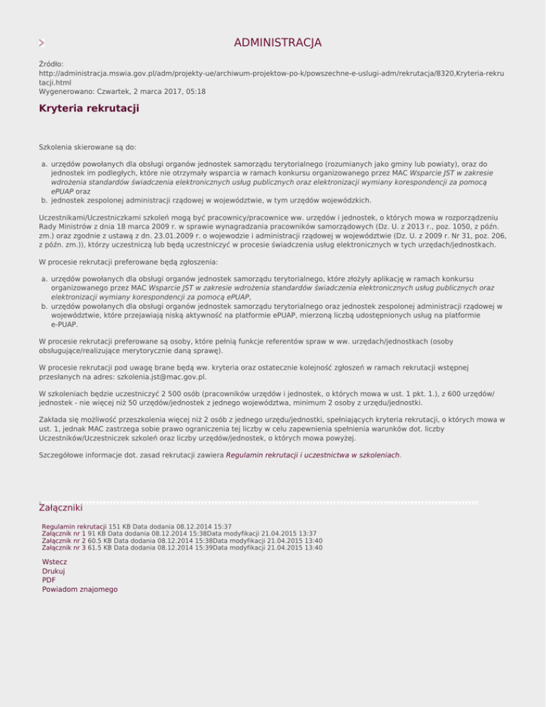 ADMINISTRACJA Źródło: http://administracja.mswia.gov.pl/adm/projekty-ue/archiwum-projektow-po-k/powszechne-e-uslugi-adm/rekrutacja/8320,Kryteria-rekru tacji.html Wygenerowano: Czwartek, 2 marca 2017, 05:18 Kryteria rekrutacji Szkolenia skierowane są do: a. urzędów powołanych dla obsługi organów jednostek samorządu terytorialnego (rozumianych jako gminy lub powiaty), oraz do jednostek im podległych, które nie otrzymały wsparcia w ramach konkursu organizowanego przez MAC Wsparcie JST w zakresie wdrożenia standardów świadczenia elektronicznych usług publicznych oraz elektronizacji wymiany korespondencji za pomocą ePUAP oraz b. jednostek zespolonej administracji rządowej w województwie, w tym urzędów wojewódzkich. Uczestnikami/Uczestniczkami szkoleń mogą być pracownicy/pracownice ww. urzędów i jednostek, o których mowa w rozporządzeniu Rady Ministrów z dnia 18 marca 2009 r. w sprawie wynagradzania pracowników samorządowych (Dz. U. z 2013 r., poz. 1050, z późn. zm.) oraz zgodnie z ustawą z dn. 23.01.2009 r. o wojewodzie i administracji rządowej w województwie (Dz. U. z 2009 r. Nr 31, poz. 206, z późn. zm.)), którzy uczestniczą lub będą uczestniczyć w procesie świadczenia usług elektronicznych w tych urzędach/jednostkach. W procesie rekrutacji preferowane będą zgłoszenia: a. urzędów powołanych dla obsługi organów jednostek samorządu terytorialnego, które złożyły aplikację w ramach konkursu organizowanego przez MAC Wsparcie JST w zakresie wdrożenia standardów świadczenia elektronicznych usług publicznych oraz elektronizacji wymiany korespondencji za pomocą ePUAP, b. urzędów powołanych dla obsługi organów jednostek samorządu terytorialnego oraz jednostek zespolonej administracji rządowej w województwie, które przejawiają niską aktywność na platformie ePUAP, mierzoną liczbą udostępnionych usług na platformie e-PUAP. W procesie rekrutacji preferowane są osoby, które pełnią funkcje referentów spraw w ww. urzędach/jednostkach (osoby obsługujące/realizujące merytorycznie daną sprawę). W procesie rekrutacji pod uwagę brane będą ww. kryteria oraz ostatecznie kolejność zgłoszeń w ramach rekrutacji wstępnej przesłanych na adres: [email protected]. W szkoleniach będzie uczestniczyć 2 500 osób (pracowników urzędów i jednostek, o których mowa w ust. 1 pkt. 1.), z 600 urzędów/ jednostek - nie więcej niż 50 urzędów/jednostek z jednego województwa, minimum 2 osoby z urzędu/jednostki. Zakłada się możliwość przeszkolenia więcej niż 2 osób z jednego urzędu/jednostki, spełniających kryteria rekrutacji, o których mowa w ust. 1, jednak MAC zastrzega sobie prawo ograniczenia tej liczby w celu zapewnienia spełnienia warunków dot. liczby Uczestników/Uczestniczek szkoleń oraz liczby urzędów/jednostek, o których mowa powyżej. Szczegółowe informacje dot. zasad rekrutacji zawiera Regulamin rekrutacji i uczestnictwa w szkoleniach. Załączniki Regulamin rekrutacji 151 KB Data dodania 08.12.2014 15:37 Załącznik nr 1 91 KB Data dodania 08.12.2014 15:38Data modyfikacji 21.04.2015 13:37 Załącznik nr 2 60.5 KB Data dodania 08.12.2014 15:38Data modyfikacji 21.04.2015 13:40 Załącznik nr 3 61.5 KB Data dodania 08.12.2014 15:39Data modyfikacji 21.04.2015 13:40 Wstecz Drukuj PDF Powiadom znajomego