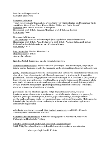Imię i nazwisko pracownika Elżbieta Sierosławska Rozprawa doktorska Temat rozprawy: „Zur Eigenart des Übersetzens von Theaterstücken am Beispiel der Texte von Günter Grass, Franz Xaver Kroetz, Heiner Müller und Botho Strauß“ Promotor: prof. dr hab. Zdzisław Wawrzyniak Recenzenci: prof. dr hab. Krzysztof Lipiński, prof. dr hab. Jan Koźbiał Rok obrony: 2002 Rozprawa habilitacyjna Tytuł rozprawy: Przekład arii operowych jako zagadnienie przekładoznawstwa Recenzenci: prof. dr hab. Anna Bednarczyk, prof. dr hab. Andrzej Kątny, prof. dr hab. Elżbieta Muskat-Tabakowska, dr hab. Czesława Schatte Rok obrony: 2013 imię i nazwisko: Elżbieta Sierosławska stopień naukowy: dr hab. stanowisko: adiunkt Katedra, Zakład, Pracownia: katedra przekładoznawstwa zainteresowania naukowe: przekład tekstów śpiewanych i multimedialnych, lingwistyka tekstu, analiza dyskursu, dydaktyka nauczania języka niemieckiego, lingwistyka kognitywna granty i prace badawcze: Specyfika tłumaczenia sztuk teatralnych; Przekładoznawcza analiza zjawisk językowych w niemieckich librettach operowych w konfrontacji z ich polskimi przekładami; Badania nad językiem w utworach wokalnych W.A. Mozarta; Aspekty analizy lingwistyczno-muzykologicznej oraz klasyfikacja utworów śpiewanych; Organizacja tekstu oraz środki tekstotwórcze w niemieckojęzycznych barokowych tekstach śpiewanych i ich związki z tekstem muzycznym a problem przekładu; Badania nad leksyką i semantyką utworów wokalnych w kontekście przekładu; prowadzone zajęcia z krótkim opisem: wstęp do przekładoznawstwa, wstęp do językoznawstwa, tłumaczenie konsekutywne, przekład tekstów użytkowych, gramatyka opisowa, gramatyka kontrastywna, historia języka niemieckiego, redakcja tekstów użytkowych, praktyczna nauka języka niemieckiego, praktische Grammatik, Mediensprache, leksykologia, lingwistyka tekstu, technologia informacyjna, seminarium dyplomowe, seminarium magisterskie członkostwo w stowarzyszeniach i instytucjach naukowych: - od 2005 – Członek Stowarzyszenia Germanistów Polskich współpraca międzynarodowa: Kirchliche Pädagogische Hochschule Krems/Wien, Pädagogische Hochschule Freiburg udział w konferencjach naukowych krajowych i zagranicznych: 2003: X Ogólnopolska Konferencja Przekładowa Między tekstem a przekładem, Uniwersytet Jagielloński, Kraków, 2004: a) XI Ogólnopolska Konferencja Przekładowa Nieznane w Przekładzie, Uniwersytet Jagielloński, Kraków, b) Międzynarodowe Sympozjum Grenzerfahrungen literarischer Übersetzung w Collegium Polonicum w Słubicach, 2005: a) XII Ogólnopolska Konferencja Przekładowa Głos i dźwięk w przekładzie, Uniwersytet Jagielloński, Kraków, b) Międzynarodowa Konferencja Internationale Woche, Pädagogische Akademie der Diözese St. Pölten w Krems, Austria, 2006: a) XIII Ogólnopolska Konferencja Przekładowa Poczucie humoru a przekład, Uniwersytet Jagielloński, Kraków, b) Konferencja Sprache und Literatur im Dialog, Akademia Pedagogiczna im. KEN Kraków oraz Pädagogische Hochschule Freiburg, Kraków, 2007: Międzynarodowa Konferencja Naukowa Stowarzyszenia Germanistów Polskich, Opole. 2008: a) Międzynarodowa Konferencja Naukowa Stowarzyszenia Germanistów Polskich, Bronisławów / k. Łodzi oraz b) Bałtyckie Spotkania Filologiczne, Osieki /k. Koszalina 2009: XVI Ogólnopolska Konferencja Przekładowa Strategie wydawców. Strategie tłumaczy, Uniwersytet Jagielloński, Kraków 2011: a) 1. Germanistentagung Text und Sprache unter neuen Perspektiven, Kraków b) VIII International Conference Translation, Text and Interference, Sevilla/Cordoba/Kraków 2012: a) Internationale wissenschaftliche Jahrestagung des Verbandes Polnischer Germanisten Mensch, Sprachen, Kulturen, Warszawa b) V. Internationale Germanistentagung Krisen als Wendepunkte in der Germanistik; Oradea (Rumunia) 2013: a) 2. Interdisziplinäre Tagung des Fachbereiches Germanistik Über das Schweigen, Uniwersytet Pedagogiczny, Kraków b) Centrum Badań nad Teatrem Muzycznym UAM; Komisja Muzykologiczna PTPN: LIBRETTO I PRZEKŁAD (III SEMINARIUM LIBRETTOLOGICZNE) kontakt: 12-662-67-53; [email protected]; pok. 301 Publikacje : - monografie: 1. Zur Eigenart des Übersetzens von Theaterstücken, Kraków : Wydawnictwo Naukowe Akademii Pedagogicznej, 2005 2. Fraza muzyczna a fraza tekstowa. Prozodia w przekładzie arii operowych, Kraków: Wydawnictwo Naukowe Akademii Pedagogicznej, 2008 3. Przekład arii operowych jako specyficzne zagadnienie przekładoznawstwa, Kraków: Wydawnictwo Naukowe Uniwersytetu Pedagogicznego, 2012 - artykuły: 1. Wesen und Funktion der Modalitätsverben; Zeszyty Naukowe Wyższej Szkoły Pedagogicznej w Rzeszowie, seria filologiczna, Językoznawstwo 3, 1996, zeszyt 20/1996, s. 183 – 189 2. Jak odnieść sukces w nauczaniu języka obcego; w: Biuletyn Informacyjny Małopolskiego Kuratorium Oświaty. 2004, Nr. 7, s. 24 3. Deutschlehrerausbildung an der Pädagogischen Akademie Kraków, w: Lehre durch Forschung / hrsg. von der Pädagogischen Akademie der Diözese St. Pölten in Krems; Krems ; Donau : Pädagog. Akad. d. Diözese St. Pölten in Krems, 2005, Forschungs- und Entwicklungsarbeit an der Pädagogischen Akademie Krems und Partnerinstitutionen, 5; s. 603-606 4. Tłumacz w operze, w: Między tekstem a obrazem : przekład a telewizja, reklama, teatr, film, komiks, internet / pod red. Urszuli Kropiwiec, Marii Filipowicz-Rudek, Jadwigi Koniecznej-Twardzikowej; Kraków : Księgarnia Akademicka, 2005, Między Oryginałem a Przekładem, 10; s. 13-23 5. Przewodniki po sanktuariach maryjnych a problem translatorski; w: Nieznane w przekładzie / pod red. Marii Filipowicz-Rudek, Jadwigi Koniecznej-Twardzikowej; Kraków : Księgarnia Akademicka, 2006, Między Oryginałem a Przekładem, 11; s. 13-18 6. Muzyczność Króla olch Goethego; w: Głos i dźwięk w przekładzie / pod red. Jerzego Brzozowskiego, Jadwigi Koniecznej-Twardzik, Marii Filipowicz-Rudek; Kraków : Księgarnia Akademi