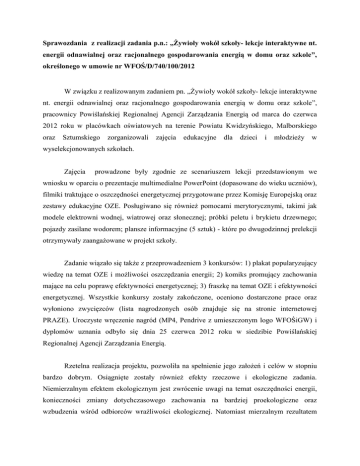 Sprawozdania z realizacji zadania p.n.: „Żywioły wokół szkoły- lekcje interaktywne nt. energii odnawialnej oraz racjonalnego gospodarowania energią w domu oraz szkole”, określonego w umowie nr WFOŚ/D/740/100/2012 W związku z realizowanym zadaniem pn. „Żywioły wokół szkoły- lekcje interaktywne nt. energii odnawialnej oraz racjonalnego gospodarowania energią w domu oraz szkole”, pracownicy Powiślańskiej Regionalnej Agencji Zarządzania Energią od marca do czerwca 2012 roku w placówkach oświatowych na terenie Powiatu Kwidzyńskiego, Malborskiego oraz Sztumskiego zorganizowali zajęcia edukacyjne dla dzieci i młodzieży w wyselekcjonowanych szkołach. Zajęcia prowadzone były zgodnie ze scenariuszem lekcji przedstawionym we wniosku w oparciu o prezentacje multimedialne PowerPoint (dopasowane do wieku uczniów), filmiki traktujące o oszczędności energetycznej przygotowane przez Komisję Europejską oraz zestawy edukacyjne OZE. Posługiwano się również pomocami merytorycznymi, takimi jak modele elektrowni wodnej, wiatrowej oraz słonecznej; próbki peletu i brykietu drzewnego; pojazdy zasilane wodorem; plansze informacyjne (5 sztuk) - które po dwugodzinnej prelekcji otrzymywały zaangażowane w projekt szkoły. Zadanie wiązało się także z przeprowadzeniem 3 konkursów: 1) plakat popularyzujący wiedzę na temat OZE i możliwości oszczędzania energii; 2) komiks promujący zachowania mające na celu poprawę efektywności energetycznej; 3) fraszkę na temat OZE i efektywności energetycznej. Wszystkie konkursy zostały zakończone, oceniono dostarczone prace oraz wyłoniono zwycięzców (lista nagrodzonych osób znajduje się na stronie internetowej PRAZE). Uroczyste wręczenie nagród (MP4, Pendrive z umieszczonym logo WFOŚiGW) i dyplomów uznania odbyło się dnia 25 czerwca 2012 roku w siedzibie Powiślańskiej Regionalnej Agencji Zarządzania Energią. Rzetelna realizacja projektu, pozwoliła na spełnienie jego założeń i celów w stopniu bardzo dobrym. Osiągnięte zostały również efekty rzeczowe i ekologiczne zadania. Niemierzalnym efektem ekologicznym jest zwrócenie uwagi na temat oszczędności energii, konieczności zmiany dotychczasowego zachowania na bardziej proekologiczne oraz wzbudzenia wśród odbiorców wrażliwości ekologicznej. Natomiast mierzalnym rezultatem przedsięwzięcia jest liczba dzieci i młodzieży, korzystających z przedmiotowych zajęć edukacyjnych. We wniosku zakładano, że udział w lekcjach weźmie około 550 osób. Ostatecznie objęto działaniem aż 559 uczniów z 12 szkół podstawowych i gimnazjalnych z terenu powiatów: Kwidzyńskiego, Sztumskiego oraz Malborskiego. Przeprowadzono w sumie 24 godziny lekcyjne zajęć, po 2 godziny lekcyjne w każdej ze szkół wskazanych poniżej: 11.05.12 – Zespół Szkół w Nebrowie Wielkim, ul. Szkolna 6, 82-522 Sadlinki, Powiat Kwidzyński , godzina 12:30 (2 klasy/2h); 23.05.12 – Szkoła Podstawowa nr 2 w Prabutach, ul. Obrońców Westerplatte 11, 82550 Prabuty, Powiat Kwidzyński, godzina 9:50 (2 klasy/2h); 24.05.12 – Gimnazjum w Nowym Stawie, ul. Bankowa 2, 82-230 Nowy Staw, Powiat Malborski, godzina 9:00 (2 klasy/2h); 25.05.12 - Młodzieżowy Ośrodek Wychowawczy nr 1 im. Tadeusza Kościuszki, ul. Jagiellońska 94, 82-200 Malbork, godzina 10:00 (2 klasy/2h); 28.05.12 – Szkoła Podstawowa Nowa Wieś, Nowa Wieś, 82-200 Malbork, Powiat Malborski, godzina 8:55 (2 klasy/2h); Zespół Szkół nr 2 w Malborku: SP nr 2, Gim. Nr 2, Al. Wojska Polskiego 479, 82-200 Malbork, Powiat Malborski, godzina 10:50 (2 klasy/2h;) 29.05.12 – Zespół Szkół w Mikołajkach Pomorskich, ul. Szreibera 10, 82-433 Mikołajki Pom., Powiat Sztumski, godzina 10:00 (2 klasy/ 2h); Szkoła Podstawowa nr 2 w Sztumie, ul. Reja 15, 82-400 Sztum, Powiat Sztumski, godzina 8:00 (2 klasy/2h); 30.05.12 – Zespół Szkół w Lichnowach, ul. Zwycięstwa 15, 82-224 Lichnowy, Powiat Malborski, godzina 8:50 (2 klasy/2h;) 31.05.12 – Zespół Szkół Ryjewo, ul. Grunwaldzka 63, 82-420 Ryjewo, Powiat Kwidzyński, godzina 9:25 (2 klasy/2h); 4.06.12 – ZS Sadlinki, ul. Grudziądzka 14A, 82-522 Sadlinki, Powiat Kwidzyński, godzina 8:00 (2 klasy/2h); 6.06.12 – Gimnazjum Przezmark, Przezmark 41A, 82-450 Stary Dzierzgoń, Powiat Sztumski, godzina 9:50 (2 klasy/2h). Podczas trwania programu osiągnięto takie efekty ekologiczne jak: wzrost świadomości dotyczącej form przeciwdziałania zmianom i anomaliom klimatu (poprzez zmniejszenie emisji CO2), efektywności energetycznej oraz zaszczepienie innowacyjnego podejścia do odnawialnych źródeł energii wśród uczniów szkół podstawowych oraz gimnazjów; nabycie przez uczniów wiedzy z zakresu rodzajów i możliwości wykorzystywania odnawialnych źródeł energii; przekazywanie zdobytej wiedzy do większego grona odbiorców, między innymi przeniesienie jej do domu (dzieci otrzymywały zadania i krzyżówki, które w znacznej części z pewnością trafiły również do rodziców); wytworzenie świadomości na temat powiązań codziennych działań i czynności ze skutkami lokalnymi i globalnymi zmian klimatu; wyrobienie nawyku zachowań energooszczędnych oraz właściwego zarządzania energią wśród uczniów, nauczycieli oraz rodziców (udostępniano uczniom ulotki na temat oszczędzania energii oraz ekonomicznej jazdy samochodem); podniesienie świadomości społecznej w zakresie wartości i zasadności jaką ma pozyskiwanie energii z OZE (widoczne większe zainteresowanie kolektorami słonecznymi chociażby u nauczycieli klas, w których odbywały się zajęcia). Zdobyta przez poszczególne grupy dzieci wiedza, była widoczna chociażby podczas trwania zajęć i przebiegającej wówczas ożywionej dyskusji o OZE lub oszczędzaniu energii. Młodzież bardzo chętnie oraz poprawnie rozwiązywała krzyżówkę podsumowującą, rzeczowo wypowiadała się na temat sposobów minimalizowania zużycia energii przedstawionych w krótkim filmiku. Wś