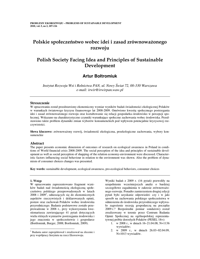 PROBLEMY EKOROZWOJU – PROBLEMS OF SUSTAINABLE DEVELOPMENT 2010, vol. 5, no 2, 107-116 Polskie społeczeństwo wobec idei i zasad zrównowaŜonego rozwoju Polish Society Facing Idea and Principles of Sustainable Development Artur Bołtromiuk Instytut Rozwoju Wsi i Rolnictwa PAN, ul. Nowy Świat 72, 00-330 Warszawa e-mail: [email protected] Streszczenie W opracowaniu został przedstawiony ekonomiczny wymiar wyników badań świadomości ekologicznej Polaków w warunkach światowego kryzysu finansowego lat 2008-2009. Omówiono kwestię społecznego postrzegania idei i zasad zrównowaŜonego rozwoju oraz kształtowanie się relacji gospodarka–środowisko w percepcji społecznej. Wskazano na charakterystyczne czynniki warunkujące społeczne zachowania wobec środowiska. Przedstawiono takŜe problem dynamiki zmian wyborów konsumenckich pod wpływem potencjalnie kryzysowej rzeczywistości. Słowa kluczowe: zrównowaŜony rozwój, świadomość ekologiczna, proekologiczne zachowania, wybory konsumenckie Abstract The paper presents economic dimension of outcomes of research on ecological awareness in Poland in conditions of World financial crisis 2008-2009. The social perception of the idea and principles of sustainable development as well as social perception of shapping of the relation economy-environment were discussed. Characteristic factors influencing social behaviour in relation to the environment was shown. Also the problem of dynamism of consumer choices changes was presented. Key words: sustainable development, ecological awareness, pro-ecological behaviors, consumer choices 1. Wstęp W opracowaniu zaprezentowano fragment wyników badań nad świadomością ekologiczną społeczeństwa polskiego przeprowadzonych w latach 2008 i 20091, odnoszących się do ekonomicznych aspektów rzeczywistych i deklarowanych opinii, postaw oraz zachowań Polaków wobec środowiska przyrodniczego. Badanie podstawowe zostało przeprowadzone w 2008 r., przy wykorzystaniu kwestionariusza zawierającego 41 pytań dotyczących wielu róŜnych wymiarów postrzegania środowiska i jego znaczenia w społeczeństwie i gospodarce (Bortłomiuk, Burger, 2008; Bortłomiuk, 2009). 1 Badania autor zaprojektował i zrealizował na zlecenie i przy współpracy Instytutu na rzecz Ekorozwoju. Wyniki badań z 2009 r. (16 pytań) pozwoliły na uzupełnienie wcześniejszych analiz o bardziej szczegółowe zagadnienia w zakresie zrównowaŜonego rozwoju. Ponadto zamierzeniem drugiej edycji pytań było uzyskanie odpowiedzi: czy i w jaki sposób na zachowania polskiego społeczeństwa w odniesieniu do środowiska przyrodniczego wpływało zagroŜenie recesją gospodarczą na początku 2009 r.? Bezpośredni pomiar sondaŜowy został zrealizowany w terenie przez Centrum Badania Opinii Społecznej na ogólnopolskiej reprezentatywnej próbie dorosłych Polaków (PESEL 18+): 1. w 2008 r., w dniach 16–21.04.08, N=1136 wywiadów; 2. w 2009 r., w dniach 26.03–02.04.09, N=1013 wywiadów. 108 Bołtromiuk/Problemy Ekorozwoju/Problems of Sustainable Development 2/2010, 107-116 2. ZrównowaŜony rozwój w percepcji społecznej Pojęcie „zrównowaŜony rozwój” juŜ dość długo funkcjonuje w przestrzeni publicznej (Gawor, 2006; Skowroński, 2006; Sztumski, 2006; Piątek, 2007; Jaśkiewicz, 2008; Pawłowski, 2009; Borys, 2010). Na ile rozpoznawalne jest ono przez polskie społeczeństwo i jakie treści są pod nie podkładane, miały pokazać odpowiedzi na pytanie z czym respondenci kojarzą ten termin. W rozkładach odpowiedzi w obu edycjach badania nie stwierdzono większych rozbieŜności. Otrzymane wyniki nie napawają optymizmem, gdyŜ na prawidłową definicję wskazała zaledwie trzecia część respondentów (33%), przyporządkowując termin „zrównowaŜony rozwój” równoprawnemu traktowaniu rozwoju gospodarczego, rozwoju społecznego i ochrony środowiska, podczas gdy co piąty badany identyfikuje go z równomiernym rozwojem róŜnych dziedzin gospodarki (20%). Inne niepoprawne skojarzenia to: równowaga psychiczna człowieka (11%) czy równomierny rozwój wszystkich regionów kraju (8%). MoŜna tu równieŜ zaobserwować ścisły związek między znajomością pojęcia zrównowaŜonego rozwoju a poziomem wykształcenia – respondenci z po studiach wyŜszych prawie dwuipółkrotnie częściej byli w stanie podać poprawną odpowiedź niŜ ci z wykształceniem podstawowym (54% wobec 20%). Najlepiej zorientowani w badanym temacie okazali się: − przedstawiciele kadry kierowniczej, specjaliści – 57% (2008); 62% (2009); − mieszkańcy największych miast – 51% (2008); 51% (2009). Pogłębieniu badań nad problematyką zrównowaŜonego rozwoju w 2009 r. posłuŜył zestaw 5 pytań, z których dwa miały na celu zbadanie czy i w jakim stopniu Polacy podzielają tę ideę, natomiast trzy posłuŜyły ocenie poziomu akceptacji społecznej podstawowych zasad zrównowaŜonego rozwoju. Na pytanie o skutki podejmowanych decyzji o kierunkach rozwoju kraju respondenci odpowiedzieli, Ŝe naleŜy brać pod uwagę wpływ takich rozstrzygnięć: − w równej mierze na gospodarkę, społeczeństwo i środowisko: 72%; − przede wszystkim na społeczeństwo (ludzi): 10%; − przede wszystkim na gospodarkę: 9%; − przede wszystkim na środowisko: 4%; − brak opinii: 6%. Najwięcej zwolenników równoprawnego traktowania gospodarczego, społecznego i środowiskowego czynnika rozwoju moŜna znaleźć wśród mieszkańców duŜych (101–500 tys.) miast (84%), osób z wykształceniem wyŜszym (82%) w przedziale wiekowym 35–44 lata (81%). Na priorytety gospodarcze wskazują najczęściej rolnicy (17%), na priorytety społeczne natomiast: uczniowie i studenci (20%), w wieku 18–24 lata (18%). Trudno jest jednoznacznie określić grupę społeczną, która wyraźnie preferuje środowiskowe kryteria decyzji, gdyŜ ogólnie niewielka liczba respondentów wyraziła takie właśnie opinie. MoŜna jedynie wspomnieć, Ŝe na kwes