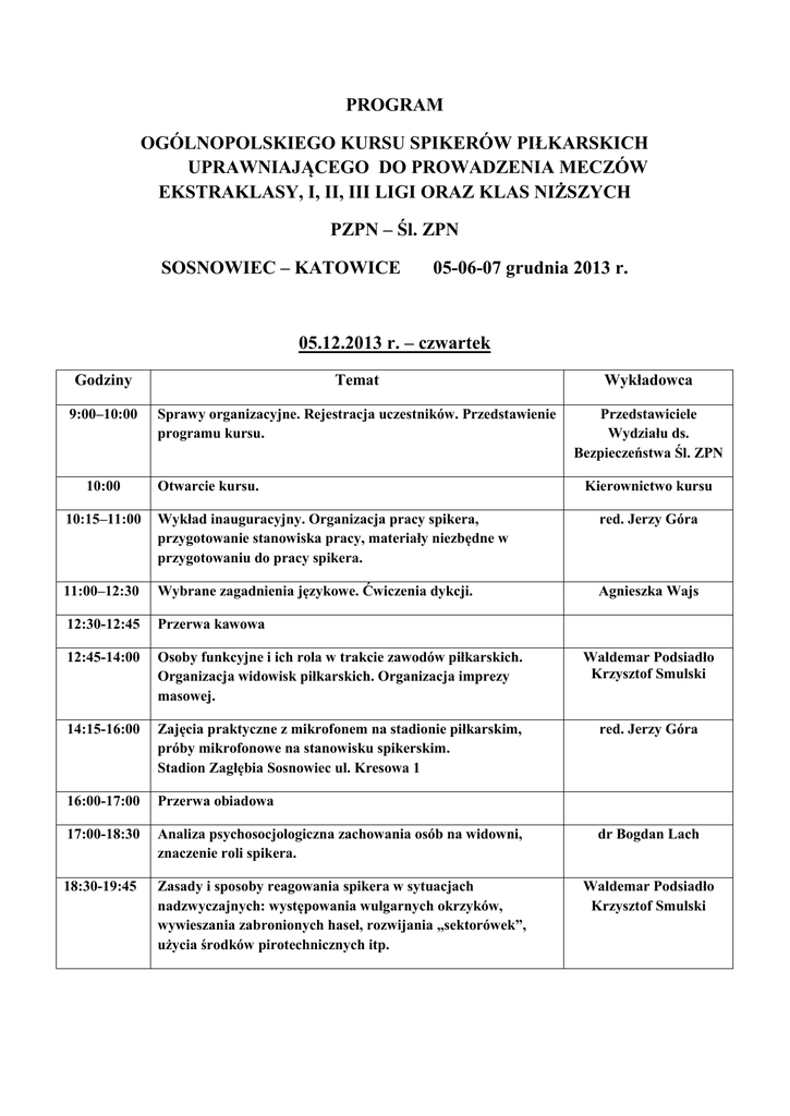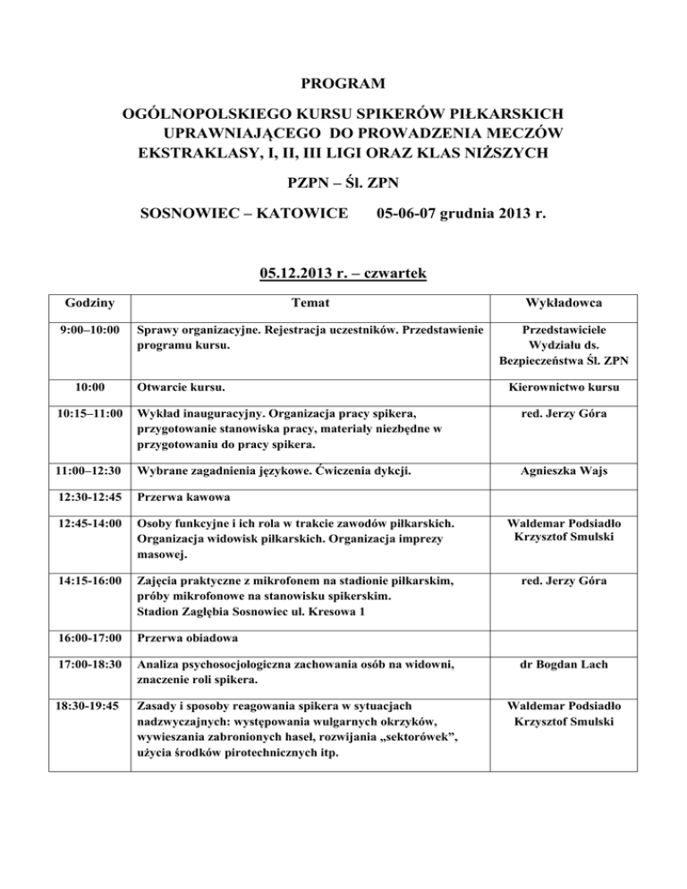 PROGRAM OGÓLNOPOLSKIEGO KURSU SPIKERÓW PIŁKARSKICH UPRAWNIAJĄCEGO DO PROWADZENIA MECZÓW EKSTRAKLASY, I, II, III LIGI ORAZ KLAS NIŻSZYCH PZPN – Śl. ZPN SOSNOWIEC – KATOWICE 05-06-07 grudnia 2013 r. 05.12.2013 r. – czwartek Godziny Temat Wykładowca 9:00–10:00 Sprawy organizacyjne. Rejestracja uczestników. Przedstawienie programu kursu. Przedstawiciele Wydziału ds. Bezpieczeństwa Śl. ZPN 10:00 Otwarcie kursu. Kierownictwo kursu 10:15–11:00 Wykład inauguracyjny. Organizacja pracy spikera, przygotowanie stanowiska pracy, materiały niezbędne w przygotowaniu do pracy spikera. red. Jerzy Góra 11:00–12:30 Wybrane zagadnienia językowe. Ćwiczenia dykcji. Agnieszka Wajs 12:30-12:45 Przerwa kawowa 12:45-14:00 Osoby funkcyjne i ich rola w trakcie zawodów piłkarskich. Organizacja widowisk piłkarskich. Organizacja imprezy masowej. Waldemar Podsiadło Krzysztof Smulski 14:15-16:00 Zajęcia praktyczne z mikrofonem na stadionie piłkarskim, próby mikrofonowe na stanowisku spikerskim. Stadion Zagłębia Sosnowiec ul. Kresowa 1 red. Jerzy Góra 16:00-17:00 Przerwa obiadowa 17:00-18:30 Analiza psychosocjologiczna zachowania osób na widowni, znaczenie roli spikera. dr Bogdan Lach 18:30-19:45 Zasady i sposoby reagowania spikera w sytuacjach nadzwyczajnych: występowania wulgarnych okrzyków, wywieszania zabronionych haseł, rozwijania „sektorówek”, użycia środków pirotechnicznych itp. Waldemar Podsiadło Krzysztof Smulski 06.12.2013 r. - piątek Godziny Temat Wykładowca 9:30–10:45 Organizacja pracy spikera, eliminowanie błędów językowych podczas prowadzenia zawodów piłkarskich. red. Henryk Grzonka 11:00-13:30 Wybrane zagadnienia językoznawcze, zasady eliminowania błędów językowych i składniowych. Kultura języka polskiego. red. Barbara Czaykowska 13:30–14:30 Przerwa obiadowa 15:00 Wyjazd do rozgłośni Polskiego Radia w Katowicach. 15:45-18:45 Zajęcia praktyczne w studiu radiowym: ćwiczenia w tzw. „obyciu” z mikrofonem, próby mikrofonowe, nagrania studyjne dla celów porównawczych. 19:00 red. Krzysztof Klepczyński red. Jerzy Góra Powrót do Sosnowca. 07.12.2013 r. - sobota Godziny Temat 9:30–10:30 Omówienie przepisów ustawowych i wewnętrznych Polskiego Związku Piłki Nożnej, dotyczących bezpieczeństwa na obiektach piłkarskich. 10:30-11:15 Test sprawdzający wiedzę uczestników kursu. 11:15–12:00 Zajęcia w formie konsultacji i dyskusji nad rolą i problemami spikerów stadionowych w oparciu o dotychczasowe doświadczenia. 12:30-13:30 Wydanie świadectw ukończenia kursu. Obiad dla wszystkich uczestników. Zakończenie szkolenia. Wykładowca Waldemar Podsiadło Krzysztof Smulski Spodziewane wystąpienie przedstawicieli Departamentu Organizacji Imprez, Bezpieczeństwa i Infrastruktury PZPN red. Jerzy Góra Wykładowcy Ogólnopolskiego Kursu Spikerów Piłkarskich