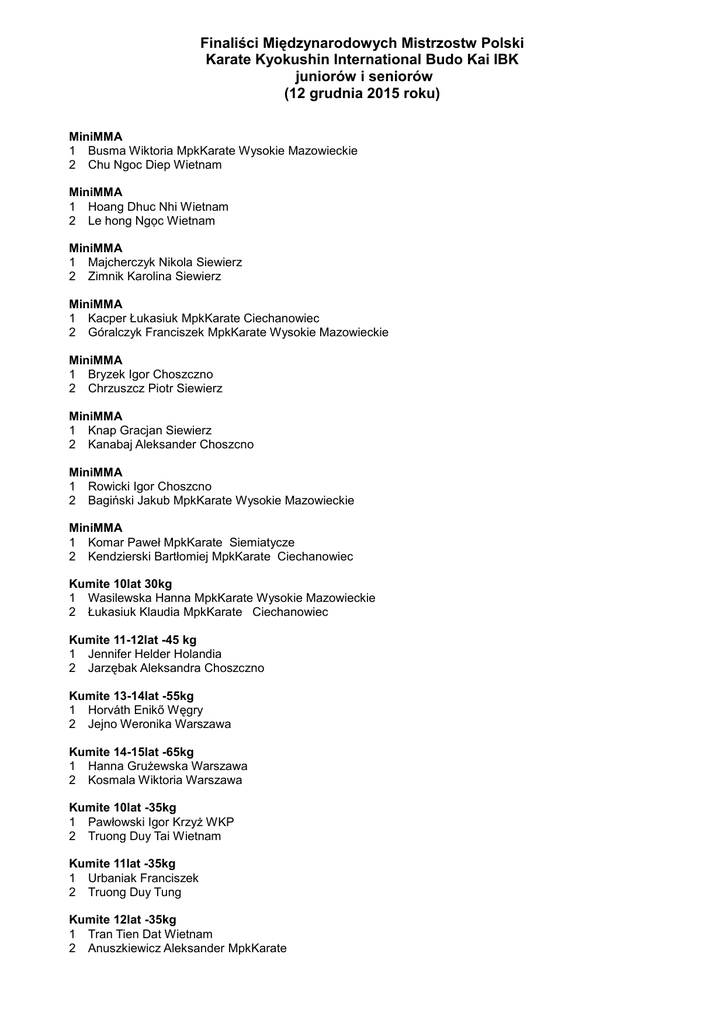 Finaliści Międzynarodowych Mistrzostw Polski Karate Kyokushin International Budo Kai IBK juniorów i seniorów (12 grudnia 2015 roku) MiniMMA 1 Busma Wiktoria MpkKarate Wysokie Mazowieckie 2 Chu Ngoc Diep Wietnam MiniMMA 1 Hoang Dhuc Nhi Wietnam 2 Le hong Ngọc Wietnam MiniMMA 1 Majcherczyk Nikola Siewierz 2 Zimnik Karolina Siewierz MiniMMA 1 Kacper Łukasiuk MpkKarate Ciechanowiec 2 Góralczyk Franciszek MpkKarate Wysokie Mazowieckie MiniMMA 1 Bryzek Igor Choszczno 2 Chrzuszcz Piotr Siewierz MiniMMA 1 Knap Gracjan Siewierz 2 Kanabaj Aleksander Choszcno MiniMMA 1 Rowicki Igor Choszcno 2 Bagiński Jakub MpkKarate Wysokie Mazowieckie MiniMMA 1 Komar Paweł MpkKarate Siemiatycze 2 Kendzierski Bartłomiej MpkKarate Ciechanowiec Kumite 10lat 30kg 1 Wasilewska Hanna MpkKarate Wysokie Mazowieckie 2 Łukasiuk Klaudia MpkKarate Ciechanowiec Kumite 11-12lat -45 kg 1 Jennifer Helder Holandia 2 Jarzębak Aleksandra Choszczno Kumite 13-14lat -55kg 1 Horváth Enikő Węgry 2 Jejno Weronika Warszawa Kumite 14-15lat -65kg 1 Hanna Grużewska Warszawa 2 Kosmala Wiktoria Warszawa Kumite 10lat -35kg 1 Pawłowski Igor Krzyż WKP 2 Truong Duy Tai Wietnam Kumite 11lat -35kg 1 Urbaniak Franciszek 2 Truong Duy Tung Kumite 12lat -35kg 1 Tran Tien Dat Wietnam 2 Anuszkiewicz Aleksander MpkKarate Kumite 10-11lat -40kg 1 Wypych Kacper Warszawa 2 Miłosz Woźniak Warszawa Kumite 10-11lat -45kg 1 Jakub Godun MpkKarate Siemiatycze 2 Hoang Vo Nghe Wietnam Kumite -50kg 1 Wojtek Saliński Warszawa 2 Jakub Grabowski MpkKarate Ciechanowiec Kumite 12lat -40kg 1 Jordan van Poelgeest Holandia 2 Rustam Prohvatilo MpkKarate Kumite 12lat -50kg 1 György Gábor Węgry 2 Czechowicz Olaf Warszawa Kumite 11-12lat -55kg 1 Bíró Tamás Węgry 2 Zalewski Adam Warszawa Kumite 12-13lat -65kg 1 Rydzowski Kacper Siewierz 2 Nguyen Quang Hung Wietnam Kumite 13-14lat -50kg 1 Tóth Márk Węgry 2 Liashenka Mikita Białoruś Kumite 13lat -55kg 1 Rabets Uladzislau Białoruś 2 Jarzębak Daniel Choszczno Kumite 14-15lat -55kg 1 Dely Dominik Węgry 2 Smoczyk Jakub Warszawa Kumite 15lat -70kg 1 Patryk Białek Warszawa 2 Knap Krystian Siewierz Kumitek 14-15lat -75kg 1 Rydzowski Oskar Siewierz 2 Gryziak Bartek Warszawa Kumite senior -65kg 1 Edyta Smolińska Warszawa 2 Dominika Ziółek Ząbki Kumite senior -80kg 1 Skupień Dawid Siewierz 2 Marcin lam Son Nguyen Tien Wietnam Kumite senior -90kg 1 Karol Goliński Warszawa 2 Michał Santorski Warszawa II K1 junior -60kg 1 Filip Cierpisz Lewin Brzeski 2 Kacper Łopuski MpkKarate Ciechanowiec K1 junior -75kg 1 Sebastian Buba Ząbki 2 Jacek Misiewicz MpkKarate K1 senior -65kg 1 Paweł Sargsjan MpkKarate 2 Maliszewski Michał MpkKarate K1 senior -80kg 1 Merdas Talebian Yazdi Holandia 2 Dawid Lutostański MpkKarate K1 senior open 1 Damian Laszuk Lewin Brzeski 2 Kuba Kukurowski Lewin Brzeski - Zawodnicy Mazowiecko-Podlaskiego Klubu Karate reprezentowani z miejscowości: Ciechanowiec, Wysokie Mazowieckie, Zambrów i Siemiatycze. MpkKarate