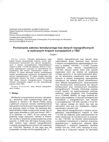 Polski Przegląd Kartograficzny Tom 39, 2007, nr 2, s. 123–136 DARIUSZ DUKACZEWSKI, ELŻBIETA BIELECKA Zakład Systemów Informacji Przestrzennej Instytutu Geodezji i Kartografii Warszawa [email protected]; [email protected] JOANNA BAC-BRONOWICZ Katedra Geodezji i Geoinformatyki Uniwersytetu Przyrodniczego we Wrocławiu [email protected] Porównanie zakresu tematycznego baz danych topograficznych w wybranych krajach europejskich z TBD Część I Z a r y s t r e ś c i. Potrzeby gospodarcze wielu krajów Europy spowodowały znaczny wzrost zain teresowania tworzeniem baz danych topograficz nych o stopniu szczegółowości odpowiadającym mapom w skali 1:10 000 lub większej. Jednym z czyn ników wpływających znacząco na spowolnienie ich wypełniania jest bardzo rozbudowany zakres in formacji. W części pierwszej autorzy przedstawiają krótkie charakterystyki wybranych europejskich baz danych topograficznych. W części drugiej dokonują porównania zakresu ich treści z zakresem polskiej TBD (Bazy Danych Topograficznych). Proponują również rozwiązania mające na celu optymalizację zakresu treści TBD. S ł o w a k l u c z o w e : bazy danych topograficz nych, Polska 1. Wstęp Możliwość przyspieszenia procesu aktualiza cji i skrócenia cyklu wydawniczego stała się, zdaniem A. Nome’a i M. Misulii (1959), jedną z głównych przyczyn wzrostu zainteresowania tworzeniem numerycznych map topograficznych już podczas wojny w Korei. Za pierwszą eks perymentalną mapę numeryczną uznaje się na ogół mapę powstałą w USA pod koniec 1957 r. (C.S. Spooner i in. 1957). W tym samym roku podobną mapę wykonano również w Polsce. Jak wynika z kwerendy przeprowadzonej przez autorów, w 2006 roku 28 krajów Europy posia dało cywilne bazy danych topograficznych o stopniu szczegółowości równym lub większym od 1:500 000. Spośród 75 baz tego typu 69 przypadało na kraje Unii Europejskiej (tab. 1). Wśród topograficznych baz danych dwie najliczniejsze grupy stanowią bazy danych o stopniu szczegółowości odpowiadającym ma pom w skalach 1:50 000 i 1:10 000. Cywilne wektorowe bazy danych topograficznych 1:50 000, których zakres treści oraz sposób organizacji różni się istotnie od wojskowej V-mapy poziomu 2, są wykorzystywane głów nie do aktualizacji urzędowych map topogra ficznych w postaci analogowej, sporządzania cieszących się ostatnio dużym zainteresowa niem atlasów topograficznych, opracowywania map tematycznych, wykonywania baz danych tematycznych oraz numerycznych produktów kartograficznych. Ponadto informacje zawarte w tych bazach są wykorzystywane podczas realizacji wielu projektów Unii Europejskiej (m.in. CORINE, MARS). W ciągu ostatniej de kady liczba projektów, w których wymagane jest korzystanie z topograficznych baz danych o szczegółowości 1:50 000, wzrosła z 12 do 53. Tym samym dostęp do takich baz stał się warunkiem sine qua non współpracy między narodowej w ramach Unii. Bazy danych topograficznych o stopniu szcze gółowości odpowiadającym mapom w skali 1:10 000 lub większej, poza zastosowaniem do celów zbliżonych do wymienionych w przypad ku baz 1:50 000, są również wykorzystywane w projektach narodowych o istotnym znaczeniu gospodarczym i społecznym, niekiedy także związanych z pewnymi aspektami wspólnej polityki Unii (np. LPIS, LFA). Sytuacja ta przy czyniła się w znacznym stopniu do stymulacji 124 Dariusz Dukaczewski, Elżbieta Bielecka, Joanna Bac-Bronowicz Tab. 1. Cywilne bazy danych topograficznych w krajach i terytoriach autonomicznych Europy (stan na 30 grudnia 2006 r.) Civil topographic databases in European countries and autonomic regions (status of 30 December 2006) Austria/Austria Belgia/Belgium Republika Czeska/Czech Republic Chorwacja/Croatia Dania/Denmark Estonia/Estonia Finlandia/Finland Francja/France Grecja/Greece Hiszpania/Spain Holandia/Netherland Irlandia/Ireland Islandia/Island Litwa/Lithuania Luksemburg/Luxembourg Łotwa/Latvia Malta/Malta Norwegia/Norway Portugalia/Portugal Polska/Poland RFN/Federal Republic of Germany Słowenia/Slovenia Słowacja/Slovakia Szwajcaria/Switzerland Szwecja/Sweden Węgry/Hungary Wielka Brytania/Great Britain Irlandia Północna/Northern Ireland Włochy/Italy l ¡ (l) l l l 1: 500 000 1: 450 000 1: 250 000 1: 210 000 1: 200 000 1: 100 000 1: 50 000 1: 25 000 1: 20 000 1: 10 000 1: 5 000 1: 2 500 1: 1 250 1: 1 000 Kraj, terytorium Country, territory 1: 500 Skala; Scale l l l l l l l l l l l l l l l l l l l l l l l (l) (l) (l) l l l l l l l l l l l l l l l l l l l l l l l l l l (l) l l l l l l l l l l l (¡ ) (¡ ) (¡) (¡) l l l l ¡ l ¡ l l l l l baza danych o pełnym pokryciu kraju lub terytorium (zakończonym lub wypełnianym); database covering full area of country or territory (completed, or in preparation) składowa bazy danych; part of the database baza danych o częściowym pokryciu kraju lub terytorium; database covering a part of country or territory prac nad topograficznymi bazami danych 1:10 000. Należy jednak podkreślić, że w Belgii, Chorwacji, Estonii, Litwie, Norwegii, Portugalii, Polsce, Słowacji, Słowenii, Szwajcarii, Szwecji i na Węgrzech prace te nie zostały jeszcze za kończone. Jest to spowodowane wieloma czyn nikami, wśród których należy przede wszystkim wymienić trudności związane z kompletowaniem materiałów źródłowych, kwestie finansowe, jak również czasochłonność wynikającą z bardzo rozbudowanego zakresu wprowadzanej infor macji. Porównanie zakresu tematycznego baz danych topograficznych w wybranych krajach ... 2. Cel i zakres badania Celem przeprowadzonego badania było porównanie zakresu treści baz danych topo graficznych o szczegółowości 1:10 000 w wy branych krajach europejskich z zakresem te matycznym polskiej bazy TBD, rozpoznanie, które spośród typów obiektów TBD mają od powiedniki w badanych bazach, rozważenie, które spośród elementów treści (obiektów) tej bazy mogłyby (w świetle d
