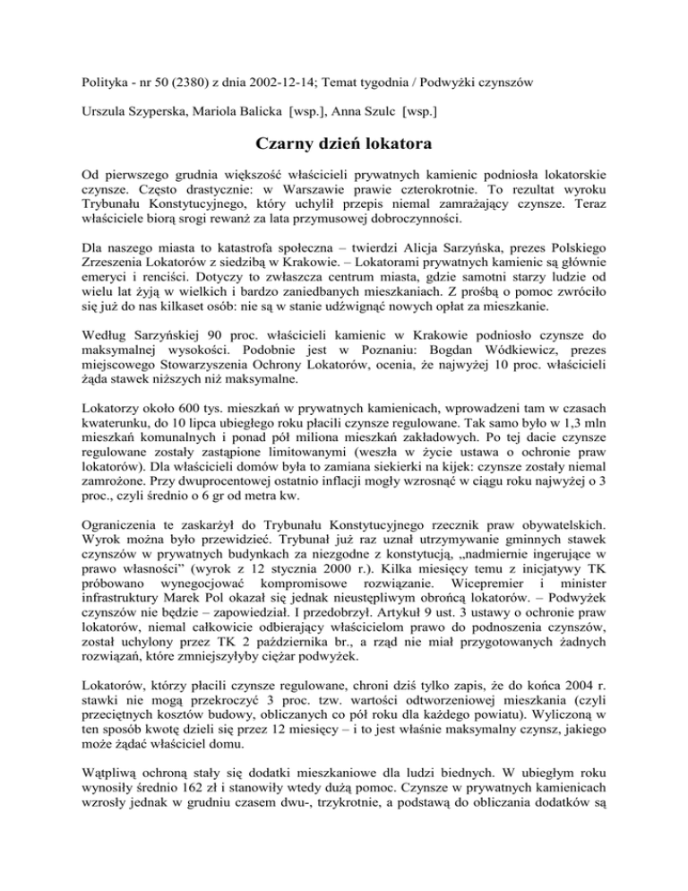 Polityka - nr 50 (2380) z dnia 2002-12-14; Temat tygodnia / Podwyżki czynszów Urszula Szyperska, Mariola Balicka [wsp.], Anna Szulc [wsp.] Czarny dzień lokatora Od pierwszego grudnia większość właścicieli prywatnych kamienic podniosła lokatorskie czynsze. Często drastycznie: w Warszawie prawie czterokrotnie. To rezultat wyroku Trybunału Konstytucyjnego, który uchylił przepis niemal zamrażający czynsze. Teraz właściciele biorą srogi rewanż za lata przymusowej dobroczynności. Dla naszego miasta to katastrofa społeczna – twierdzi Alicja Sarzyńska, prezes Polskiego Zrzeszenia Lokatorów z siedzibą w Krakowie. – Lokatorami prywatnych kamienic są głównie emeryci i renciści. Dotyczy to zwłaszcza centrum miasta, gdzie samotni starzy ludzie od wielu lat żyją w wielkich i bardzo zaniedbanych mieszkaniach. Z prośbą o pomoc zwróciło się już do nas kilkaset osób: nie są w stanie udźwignąć nowych opłat za mieszkanie. Według Sarzyńskiej 90 proc. właścicieli kamienic w Krakowie podniosło czynsze do maksymalnej wysokości. Podobnie jest w Poznaniu: Bogdan Wódkiewicz, prezes miejscowego Stowarzyszenia Ochrony Lokatorów, ocenia, że najwyżej 10 proc. właścicieli żąda stawek niższych niż maksymalne. Lokatorzy około 600 tys. mieszkań w prywatnych kamienicach, wprowadzeni tam w czasach kwaterunku, do 10 lipca ubiegłego roku płacili czynsze regulowane. Tak samo było w 1,3 mln mieszkań komunalnych i ponad pół miliona mieszkań zakładowych. Po tej dacie czynsze regulowane zostały zastąpione limitowanymi (weszła w życie ustawa o ochronie praw lokatorów). Dla właścicieli domów była to zamiana siekierki na kijek: czynsze zostały niemal zamrożone. Przy dwuprocentowej ostatnio inflacji mogły wzrosnąć w ciągu roku najwyżej o 3 proc., czyli średnio o 6 gr od metra kw. Ograniczenia te zaskarżył do Trybunału Konstytucyjnego rzecznik praw obywatelskich. Wyrok można było przewidzieć. Trybunał już raz uznał utrzymywanie gminnych stawek czynszów w prywatnych budynkach za niezgodne z konstytucją, „nadmiernie ingerujące w prawo własności” (wyrok z 12 stycznia 2000 r.). Kilka miesięcy temu z inicjatywy TK próbowano wynegocjować kompromisowe rozwiązanie. Wicepremier i minister infrastruktury Marek Pol okazał się jednak nieustępliwym obrońcą lokatorów. – Podwyżek czynszów nie będzie – zapowiedział. I przedobrzył. Artykuł 9 ust. 3 ustawy o ochronie praw lokatorów, niemal całkowicie odbierający właścicielom prawo do podnoszenia czynszów, został uchylony przez TK 2 października br., a rząd nie miał przygotowanych żadnych rozwiązań, które zmniejszyłyby ciężar podwyżek. Lokatorów, którzy płacili czynsze regulowane, chroni dziś tylko zapis, że do końca 2004 r. stawki nie mogą przekroczyć 3 proc. tzw. wartości odtworzeniowej mieszkania (czyli przeciętnych kosztów budowy, obliczanych co pół roku dla każdego powiatu). Wyliczoną w ten sposób kwotę dzieli się przez 12 miesięcy – i to jest właśnie maksymalny czynsz, jakiego może żądać właściciel domu. Wątpliwą ochroną stały się dodatki mieszkaniowe dla ludzi biednych. W ubiegłym roku wynosiły średnio 162 zł i stanowiły wtedy dużą pomoc. Czynsze w prywatnych kamienicach wzrosły jednak w grudniu czasem dwu-, trzykrotnie, a podstawą do obliczania dodatków są nadal komunalne stawki czynszu. Takie pieniądze niewiele pomogą lokatorom. Zmiana zasad przyznawania pomocy wymaga nowelizacji ustawy o ochronie lokatorów, a przede wszystkim – pieniędzy. Przy obecnym stanie budżetu i kolejnych roszczeniach górników, rolników i innych grup zawodowych niełatwo będzie znaleźć środki na większe dopłaty do czynszów (w ubiegłym roku państwo wydało na dodatki 550 mln zł). Czas rewanżu Najbardziej drastyczne podwyżki wprowadzane są w kamienicach warszawskich. W odróżnieniu od Krakowa i Poznania, stołeczne stawki są jednak bardziej zróżnicowane, często uznaniowe. W tej samej warszawskiej kamienicy jedni płacą od 1 grudnia 5–6 zł za metr, inni prawie 10 zł. Wyjątkowo łaskawie potraktowano lokatorów kamienic zarządzanych przez stołeczne Zrzeszenie Właścicieli Nieruchomości: ci, którzy płacą stawki wynegocjowane przez zarządców (4,30 zł za metr), podwyżki uniknęli. Nie da się ukryć: wielu właścicielom w gruncie rzeczy chodzi o to, żeby pozbyć się wreszcie znienawidzonych lokatorów. – W moim domu dwa mieszkania zajmują lokatorzy wprowadzeni decyzjami administracyjnymi. Czynsz za jedno z nich podniosłam do górnego pułapu – mówi Helena Perlicka, przewodnicząca Ogólnopolskiego Stowarzyszenia Właścicieli Nieruchomości z siedzibą w Gdyni. – Od lat mam z lokatorką tego mieszkania na pieńku: złośliwie hałasuje, robiła na mnie donosy. Czynsz za drugie mieszkanie pozostawiłam bez zmian, nie mam zastrzeżeń do lokatorów. Konflikt z lokatorką sprawił, że Helena Perlicka założyła 12 lat temu stowarzyszenie, które stało się najbardziej waleczną organizacją właścicieli nieruchomości. To ono reprezentowało właścicieli kamienic podczas rozpraw Trybunału Konstytucyjnego, które zakończyły się październikowym wyrokiem. Nowe czynsze nie mają żadnego związku z tym, co decyduje o wartości mieszkania: lokalizacją, standardem, stanem technicznym budynku. Stawka zależy od obecnych przeciętnych kosztów budownictwa, co nijak się ma do reguł rządzących rynkiem nieruchomości. Z czasem rynek zmusi właścicieli ruder do ograniczenia apetytów, ale na razie zaczął się dla nich tłusty rok. Przykładem spór, jaki toczył się między właścicielką i lokatorami kamienicy przy ul. Łaziennej w Toruniu. Lokatorzy domagali się obniżenia czynszu, ponieważ w domu nie ma centralnego ogrzewania i gazu. Sprawa trafiła do sądu, który uznał to żądanie za uzasadnione. Ale zanim wyrok się uprawomocnił, spór stał się bezprzedmiotowy: zamia