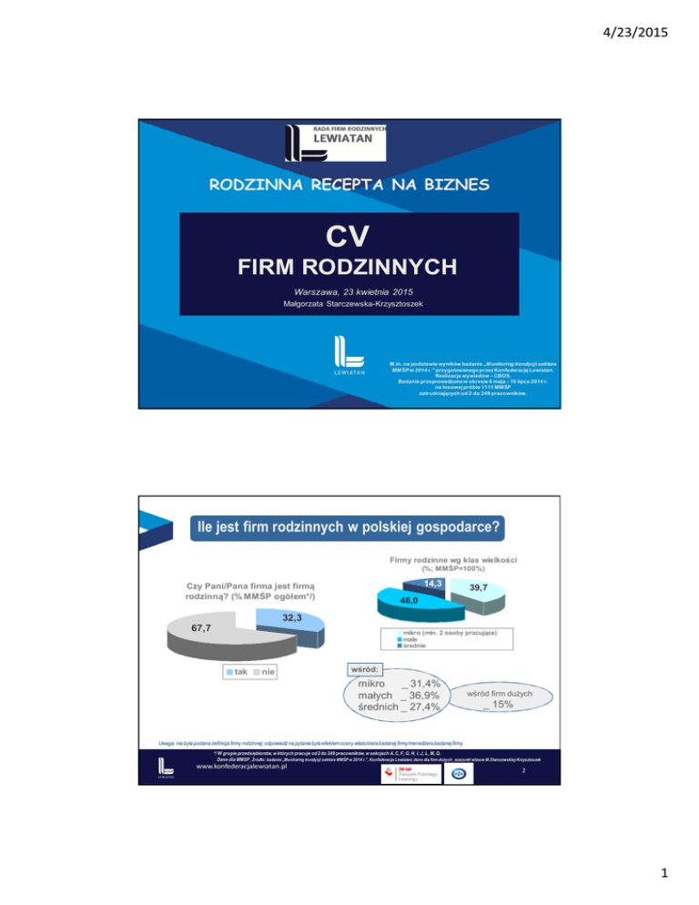 4/23/2015 RODZINNA RECEPTA NA BIZNES CV FIRM RODZINNYCH Warszawa, 23 kwietnia 2015 Małgorzata Starczewska-Krzysztoszek M.in. na podstawie wyników badania „Monitoring kondycji sektora MMŚP w 2014 r.” przygotowanego przez Konfederację Lewiatan. Realizacja wywiadów – CBOS. Badanie przeprowadzone w okresie 6 maja - 18 lipca 2014 r. na losowej próbie 1111 MMŚP zatrudniających od 2 do 249 pracowników. Ile jest firm rodzinnych w polskiej gospodarce? Firmy rodzinne wg klas wielkości (%; MMŚP=100%) 14,3 Czy Pani/Pana firma jest firmą rodzinną? (% MMŚP ogółem*/) 39,7 46,0 32,3 67,7 mikro (min. 2 osoby pracujące) małe średnie tak nie wśród: mikro _ 31,4% małych _ 36,9% średnich _ 27,4% wśród firm dużych _ 15% Uwaga: nie była podana definicja firmy rodzinnej; odpowiedź na pytanie była efektem oceny właściciela badanej firmy/menedżera badanej firmy */ W grupie przedsiębiorstw, w których pracuje od 2 do 249 pracowników, w sekcjach A, C, F, G, H, I, J, L, M, Q. Dane dla MMSP_Źródło: badanie „Monitoring kondycji sektora MMŚP w 2014 r.”, Konfederacja Lewiatan; dane dla firm dużych_szacunki własne M.Starczewskiej-Krzysztoszek www.konfederacjalewiatan.pl 2 1 4/23/2015 Curriculum Vitae (1) Imię i nazwisko: FIRMY RODZINNE Imię i nazwisko: FIRMY NIERODZINNE >18% PKB wytworzonego w gospodarce 1/4 PKB wytworzonego przez sektor przedsiębiorstw Obecna pozycja: 24% zatrudnionych w sektorze przedsiębiorstw 55% PKB wytworzonego w gospodarce Obecna pozycja: >21% nakładów przedsiębiorstw na inwestycje 3/4 PKB wytworzonego przez sektor przedsiębiorstw 76% zatrudnionych w sektorze przedsiębiorstw 79% nakładów przedsiębiorstw na inwestycje www.konfederacjalewiatan.pl 3 Curriculum Vitae (2) Imię i nazwisko: FIRMY RODZINNE Imię i nazwisko: FIRMY NIERODZINNE Liczba lat działania firmy rodzinnej na rynku (% rodzinnych MMŚP) Data urodzenia: 15,3 0,1 37,1 18,8 14,7 powyżej 20 '11-15 lat '1-5 lat 14,0 Liczba lat działania firmy nierodzinnej na rynku (% nierodzinnych MMŚP) Data urodzenia: 16-20 lat '6-10 lat powstała w 2014 r. Miejsce zamieszkania: 17,3 18,9 23,3 19,7 0,2 25,5 16,9 19,6 powyżej 20 '11-15 lat '1-5 lat Lokalizacja firm y rodzinnej (% rodzinnych MMŚP) 20,7 18,1 19,7 16-20 lat '6-10 lat powstała w 2014 r. Lokalizacja firm y nierodzinnej (% nierodzinnych MMŚP) Miejsce zamieszkania: 14,3 8,5 26,8 18,0 32,4 metropolia (co najmniej 500 tys. mieszkańców) metropolia (co najmniej 500 tys. mieszkańców) duże miasto (100-499,5 tys. mieszkańców duże miasto (100-499,5 tys. mieszkańców miasto średniej wielkości (20-99,9 tys. mieszkańców) miasto średniej wielkości (20-99,9 tys. mieszkańców) małe miasto (do 19,9 tys. mieszkańców) małe miasto (do 19,9 tys. mieszkańców) obszar wiejski obszar wiejski www.konfederacjalewiatan.pl 4 2 4/23/2015 Curriculum Vitae (3) Imię i nazwisko: FIRMY RODZINNE 3,1 Zawód: Imię i nazwisko: FIRMY NIERODZINNE Sektor gospodarki w którym działa firma nierodzinna (% nierodzinnych MMŚP) Sektor gospodarki w którym działa firma rodzinna (% rodzinnych MMŚP) 2,5 9,3 9,1 2,1 18,6 11,0 8,8 6,1 12,6 Zawód: 7,3 15,9 6,9 22,6 produkcja p rzemysłowa bu downictwo 15,4 7,1 12,8 rolnictwo 5,3 6,7 16,7 handel rolnictwo bu downictwo produkcja p rzemysłowa handel transport hotele, restauracje transport hotele, restauracje informa cja i komunikacja obsług a nieruchomosci informa cja i komunikacja obsług a nieruchomosci dz ia łalność profesjonalna, nau kowa i te chnicz na opieka zdro wotna i pomoc społecz na dz ia łalność profesjonalna, nau kowa i te chnicz na opieka zdro wotna i pomoc społecz na Płeć właściciela firmy rodzinnej (% rodzinnych MMŚP) Płeć Właściciela firmy: Płeć właściciela firmy nierodzinnej (% nierodzinnych MMŚP) Kobieta 3,3 Płeć Właściciela firmy: 32,2 67,8 Mężczyzna 32,8 63,9 Kobieta Mężczyzna Firma ma rozproszony akcjonariat www.konfederacjalewiatan.pl 5 Curriculum Vitae (4) Imię i nazwisko: FIRMY RODZINNE Imię i nazwisko: FIRMY NIERODZINNE Wykształcenie właściciela firmy rodzinnej (% rodzinnych MMŚP) 5,2 Wykształcenie Właściciela: Wykształcenie właściciela firmy nierodzinnej (% nierodzinnych MMŚP) 4,9 14,1 Wykształcenie Właściciela: 38,7 1,8 10,1 40,7 42,5 41,6 poniżej średniego średnie wyższe wyższe z tytułem naukowym 50,8 15,8 11,4 jakość produktów jakość obsługi klienta cena www.konfederacjalewiatan.pl średnie wyższe wyższe z tytułem naukowym nie dot. - rozproszony akcjonariat Czynniki budujące pozycję konkurencyjną firm rodzinnych na rynku (% rodzinnych MMŚP wskazujących dany czynnik jako kluczowy) Główne źródła pozycji konkurencyjnej firmy na rynku: poniżej średniego Czynniki budujące pozycję konkurencyjną firm rodzinnych na rynku (% rodzinnych MMŚP wskazujących dany czynnik jako kluczowy) Główne źródła pozycji konkurencyjnej firmy na rynku: 43,4 14,8 17,2 jakość produktów jakość obsługi klienta cena 6 3 4/23/2015 O co chodzi w biznesie rodzinnym? Źródło: http://mleczko.interia.pl/galerie/o-mediach,11497 www.konfederacjalewiatan.pl 7 O co chodzi w biznesie rodzinnym? Źródło: http://mleczko.interia.pl/galerie/o-mediach,11497 www.konfederacjalewiatan.pl 8 4