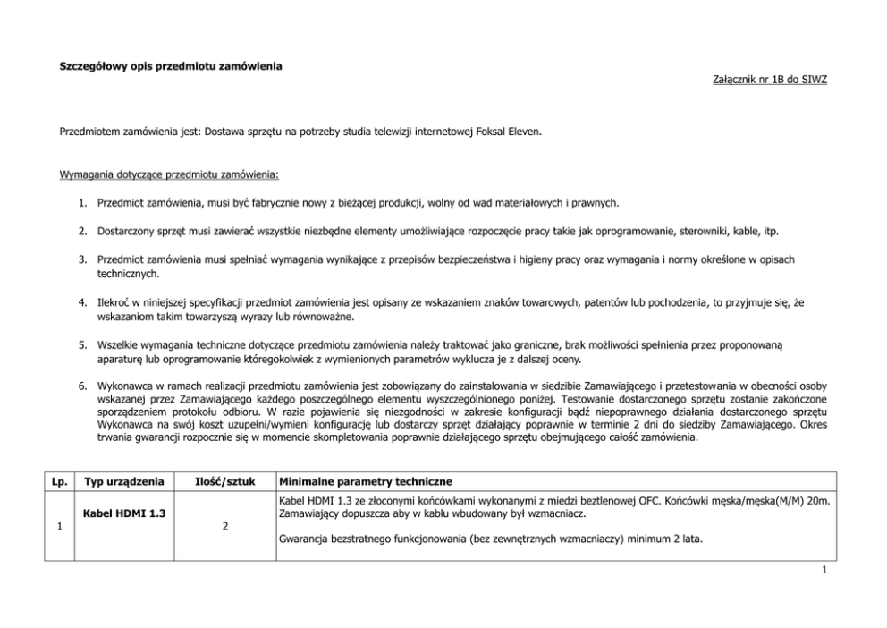 Szczegółowy opis przedmiotu zamówienia Załącznik nr 1B do SIWZ Przedmiotem zamówienia jest: Dostawa sprzętu na potrzeby studia telewizji internetowej Foksal Eleven. Wymagania dotyczące przedmiotu zamówienia: 1. Przedmiot zamówienia, musi być fabrycznie nowy z bieżącej produkcji, wolny od wad materiałowych i prawnych. 2. Dostarczony sprzęt musi zawierać wszystkie niezbędne elementy umożliwiające rozpoczęcie pracy takie jak oprogramowanie, sterowniki, kable, itp. 3. Przedmiot zamówienia musi spełniać wymagania wynikające z przepisów bezpieczeństwa i higieny pracy oraz wymagania i normy określone w opisach technicznych. 4. Ilekroć w niniejszej specyfikacji przedmiot zamówienia jest opisany ze wskazaniem znaków towarowych, patentów lub pochodzenia, to przyjmuje się, że wskazaniom takim towarzyszą wyrazy lub równoważne. 5. Wszelkie wymagania techniczne dotyczące przedmiotu zamówienia należy traktować jako graniczne, brak możliwości spełnienia przez proponowaną aparaturę lub oprogramowanie któregokolwiek z wymienionych parametrów wyklucza je z dalszej oceny. 6. Wykonawca w ramach realizacji przedmiotu zamówienia jest zobowiązany do zainstalowania w siedzibie Zamawiającego i przetestowania w obecności osoby wskazanej przez Zamawiającego każdego poszczególnego elementu wyszczególnionego poniżej. Testowanie dostarczonego sprzętu zostanie zakończone sporządzeniem protokołu odbioru. W razie pojawienia się niezgodności w zakresie konfiguracji bądź niepoprawnego działania dostarczonego sprzętu Wykonawca na swój koszt uzupełni/wymieni konfigurację lub dostarczy sprzęt działający poprawnie w terminie 2 dni do siedziby Zamawiającego. Okres trwania gwarancji rozpocznie się w momencie skompletowania poprawnie działającego sprzętu obejmującego całość zamówienia. Lp. 1 Typ urządzenia Kabel HDMI 1.3 Ilość/sztuk 2 Minimalne parametry techniczne Kabel HDMI 1.3 ze złoconymi końcówkami wykonanymi z miedzi beztlenowej OFC. Końcówki męska/męska(M/M) 20m. Zamawiający dopuszcza aby w kablu wbudowany był wzmacniacz. Gwarancja bezstratnego funkcjonowania (bez zewnętrznych wzmacniaczy) minimum 2 lata. 1 Kompatybilne z urządzeniem z pkt. 2 Urządzenie, które pozwoli na tworzenie telewizji internetowej lub szybką i łatwą produkcję telewizyjnej jakości materiałów filmowych z przeznaczeniem do Internetu lub na urządzenia przenośne. Wyposażone w: - profesjonalne złącza i najważniejsze formaty, które są idealne do streamingu internetowego w pełnym HD, prostej emisji i nie tylko, - produkcja na żywo wprost z ‘pudła’, z pomocą ogólnie dostępnych kamer HD, - emisja, streaming, projektowanie i nagrywanie – w ciągu zaledwie kilku minut. - wirtualne plany studia telewizyjnego, ruchome tła, efekty i grafika, - łatwy do przenoszenia. - opcja dodawania osprzętu kontrolnego na potrzeby obsługi profesjonalnej i intuicyjnej produkcji na żywo. Specyfikacja Techniczna: 2 Urządzenie do produkcji i streamingu video na żywo 1 1. Ilość przełączników kanałów (minimum 14): - 6 zewnętrznych, - 4 wewnętrzne, - 4 wejścia wirtualne. 2. Wejście wideo: - 4 jednoczesne źródła wideo, w dowolnej kombinacji: komponent SD, komponent HD, SD, Y/C, - Każde wejście obejmowane przez zintegrowany synchronizator ramki, - Niezależne kluczowanie, przycinanie i Proc Amp, - Łącza BNC. 3. Źródła sieciowe: - Możliwość wpuszczenia jednocześnie 2 źródeł przez Gigabit Ehternet, - Wybierane z dowolnego komputera sieciowego lub Apple ® AirPlay ® Device, - Niezależne kluczowanie, przycinanie i Proc Amp Media, - 3 biblioteki źródeł cyfrowych multimediów dla wideo i grafiki: DDR i GFX x 2. 4. Warstwy wideo: -minimum 5 warstw na ekranie jednocześnie. 5. Wyjście video: - A/V sygnał wyjściowy przez minimum 5 wyjściowych połączeń, - Minimum 2x analogowe konfigurowalne BNC dla Component lub Y/C + Composite (Program i SD AUX), 2 - Wyjście LAN (RJ45) dla streamingu na żywo. 6. Nagranie: - wsparcie nagrywania w rozdzielczości do 1080i, - kodowanie w QuickTime lub Web jakości H.264. 7. Pojemność zapisu: - umożliwianie zapisu minimum 18 godzin 1080i lub 110 godzin 480i za pośrednictwem wewnętrznego dysku w formacie QuickTime, - pojemność rozszerzalna za pomocą zewnętrznych nośników i napędów. 8. Live Streaming: - HD live streaming poprzez Adobe Flash lub Microsoft Windows Media Push / Pull. 9. Wejścia audio: - 1/4" Mono (Mic) RCA x 2 Stereo L/R (Line). 10. Wyjścia audio: - RCA x 2 Stereo L/R 1/4" Stereo (telefony), - Audio Mixing, - wbudowany multi-kanałowy mikser audio dla wewnętrznych i zewnętrznych źródeł dźwięku, wyjścia i słuchawki. 11. Obsługiwane formaty: - NTSC: 1080i, 720p, 480i (16:9), 480i (4:3), - Multi-Standard: NTSC-J, PAL 1080i, 720p, 576i (16:9), 576i (4:3). 12. Odtwarzane formaty nośników: - AVI, DV, DVCPRO, DVCProHD, FLV, F4V, H.263, H.264, MOV, MKV, MJPEG, - MPEG (1, 2, wszystkie profile, program lub strumienie transportowe), - MP4, WMV, WebM, PSD, PNG , TGA, BMP, JPEG, EXR, RAW, TIF, AIFF, MP3, WAV (w tym Apple ProRes). 13. Przetwarzanie: - Video: 4:4:4:4, 32-bitowe, - Audio: 2 kanały, 96 kHz, 32-bitowe. Gwarancja minimum 12 miesięcy. 3 Sterownik do 1 Kompatybilny z urządzeniem z pkt. 2. Sterownik umożliwiający szybki i pełen dostęp funkcji live-produkcyjnych. 3 urządzenia z pkt. 2 Urządzenie powinno mieć podświetlane przyciski. Gwarancja minimum 1 rok. 4 Konwerter Analog to SDI 1 Konwerter Analog to SDI. Urządzenie służące do liniowej konwersji z sygnału Analog w komponentowym video HD/SD, NTSC i PAL plus zbalansowanym AES/EBU i analogowym audio na SDI. Kompatybilny z urządzeniem z pkt. 2. Gwarancja minimum 2 lata 5 Konwerter SDI to Analog 2 Konwerter SDI to Analog. Urządzenie służące do liniowej konwersji SDI na analog w komponentowym video HD/SD, NTSC i PAL plus zbalansowanym AES/EBU i analogowym audio. Urządzenie powinno mieć także wb
