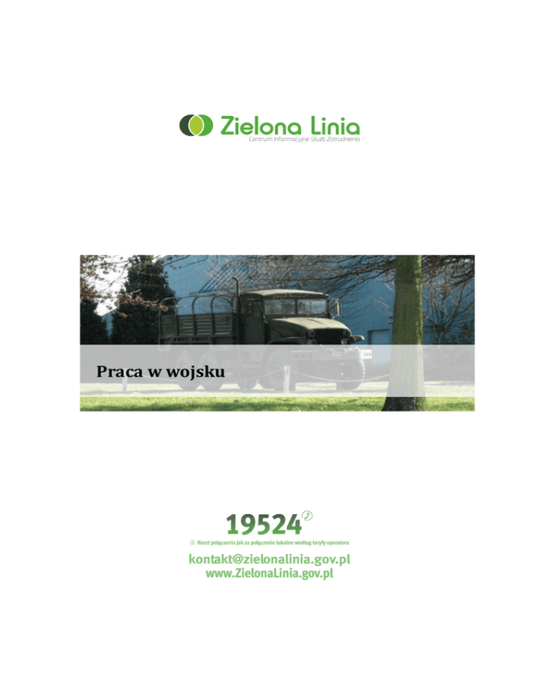 Praca w wojsku Zielona Linia - Praca w wojsku Chcesz pracować w wojsku? Marzysz o pracy w służbie mundurowej, ale nie wiesz, jak się do niej dostać? Przeczytaj nasz poradnik! str. 1 Zielona Linia - Praca w wojsku Charakterystyka Sił Zbrojnych RP Siły Zbrojne Rzeczypospolitej Polskiej służą ochronie niepodległości państwa i niepodzielności jego terytorium oraz zapewnieniu bezpieczeństwa i nienaruszalności jego granic. Najwyższym zwierzchnikiem Sił Zbrojnych RP jest Prezydent Rzeczypospolitej Polskiej. W czasie pokoju sprawuje on zwierzchnictwo nad siłami zbrojnymi za pośrednictwem Ministra Obrony Narodowej. Swoje zadania minister wykonuje przy pomocy Ministerstwa Obrony Narodowej, w którego skład wchodzi Sztab Generalny Wojska Polskiego. Z jakich jednostek składa się wojsko? W skład Sił Zbrojnych RP wchodzą: Wojska Lądowe, Siły Powietrzne, Marynarka Wojenna, Wojska Specjalne, . Wojska Lądowe Stanowią trzon Sił Zbrojnych RP. Wojska Lądowe składają się z następujących rodzajów wojsk: wojsk pancernych i zmechanizowanych, wojsk aeromobilnych, , wojsk rakietowych i artylerii, wojsk obrony przeciwlotniczej, wojsk inżynieryjnych, wojsk chemicznych, wojsk łączności i informatyki, oddziałów i pododdziałów rozpoznania i walki elektronicznej oraz logistycznych. Siły Powietrzne Siły Powietrzne są rodzajem sił zbrojnych przeznaczonym głównie do obrony przestrzeni powietrznej kraju, prowadzenia operacji mających na celu utrzymanie przewagi w powietrzu oraz wspierania innych rodzajów wojsk w operacjach połączonych. Ponadto odpowiadają za polski wkład do zintegrowanego systemu obrony powietrznej NATO - NATINADS. Siły Powietrzne składają się z trzech głównych rodzajów wojsk: Wojsk Lotniczych, Wojsk Obrony Przeciwlotniczej, Wojsk Radiotechnicznych. Marynarka Wojenna Marynarka Wojenna przeznaczona jest do obrony interesów państwa na polskich obszarach morskich, morskiej obrony wybrzeża oraz udziału w lądowej obronie wybrzeża we współdziałaniu z innymi rodzajami sił zbrojnych w ramach strategicznej operacji obronnej. str. 2 Zielona Linia - Praca w wojsku Trzon struktury Marynarki Wojennej tworzą: flotylle okrętów (3 Flotylla Okrętów i 8 Flotylla Obrony Wybrzeża), Brygada Lotnictwa Marynarki Wojennej, brzegowe jednostki wsparcia i zabezpieczenia działań oraz ośrodki szkolne. Wojska Specjalne Wojska Specjalne są przeznaczone do prowadzenia operacji specjalnych zarówno w kraju, jak i poza jego granicami w okresie pokoju, kryzysu i wojny. Prowadzone we współdziałaniu z siłami konwencjonalnymi lub samodzielnie zadania, mogą mieć znaczenie strategiczne lub operacyjne. W strukturze Wojsk Specjalnych funkcjonują: Dowództwo Wojsk Specjalnych (Kraków), Jednostka Wojskowa GROM (Warszawa), Jednostka Wojskowa Komandosów (Lubliniec), Jednostka Wojskowa Formoza (Gdynia), Jednostka Wojskowa Agat (Gliwice), Jednostka Wojskowa Nil (Kraków), 7 Eskadra Działań Specjalnych. Jednostka Wojskowa GROM, 1. Pułk Specjalny Komandosów, Morska Jednostka Działań Specjalnych FORMOZA, Jednostka Wsparcia Dowodzenia i Zabezpieczenia Wojsk Specjalnych. PAMIĘTAJ! Zastanów się, jaka jednostka Cię interesuje! str. 3 Zielona Linia - Praca w wojsku Jakie są zasady zatrudnienia w wojsku? Żołnierze zawodowi pełnią czynną służbę wojskową w postaci służby stałej albo służby kontraktowej. Mogą ją pełnić zarówno mężczyźni, jak i kobiety. Żołnierze zawodowi tworzą trzy korpusy: korpus oficerów zawodowych, korpus podoficerów zawodowych oraz korpus szeregowych zawodowych. Z kolei korpusy osobowe dzielą się na grupy osobowe, w których występuje podział na specjalności wojskowe. Przyjęcie do służby wojskowej odbywa się w drodze powołania, na podstawie dobrowolnego zgłoszenia się do jej pełnienia. Osobę, która wyraziła chęć pełnienia zawodowej służby wojskowej, wojskowy komendant uzupełnień kieruje do pracowni psychologicznej w celu wydania orzeczenia psychologicznego w zakresie braku przeciwwskazań do pełnienia służby. Przyjęcie do służby kontraktowej następuje w korpusie oficerów zawodowych, podoficerów zawodowych i szeregowych zawodowych na podstawie umowy zwanej „kontraktem”. Powołanie do służby kontraktowej może nastąpić jednorazowo na okres od 2 do 6 lat. Do łącznego czasu trwania służby kontraktowej zalicza się okresy odbywania lub pełnienia innych form czynnej służby wojskowej oraz okresy pełnienia służby w formacjach: Policji, Straży Granicznej, Biura Ochrony Rządu, Państwowej Straży Pożarnej, Służby Więziennej, Agencji Bezpieczeństwa Wewnętrznego, Agencji Wywiadu, Służby Wywiadu Wojskowego, Służby Kontrwywiadu Wojskowego lub Urzędu Ochrony Państwa. Najpóźniej na 3 miesiące przed dniem upływu okresu, na jaki zawarty został kontrakt, żołnierz służby kontraktowej może wystąpić z wnioskiem o zawarcie kolejnego kontraktu lub powołanie do służby stałej. Z inicjatywą zawarcia kolejnego kontraktu albo powołania do służby stałej może wystąpić również dowódca jednostki wojskowej, w której żołnierz pełni kontraktową służbę wojskową. Przyjęcie do służby stałej – w korpusach oficerów zawodowych i podoficerów zawodowych – następuje na czas nieokreślony. str. 4 Zielona Linia - Praca w wojsku Jakie wymagania trzeba spełnić, aby pracować w wojsku? Jeżeli chcesz zostać żołnierzem zawodowym, powinieneś: posiadać polskie obywatelstwo, mieć odpowiednie kwalifikacje, mieć nieposzlakowaną opinię, posiadać zdolność fizyczną i psychiczną – sprawdzi to wojskowa komisja lekarska. O szczegóły można pytać w wojskowej komendzie uzupełnień albo w jednostce wojskowej. PAMIĘTAJ! To, jaki stopień wojskowy osiągniesz, zależy od Twojego wykształcenia! str. 5 Zielona Linia - Praca w wojsku Jakie są etapy procedury przyjęcia do zawodowej służby wojskowej? Znalezienie wolnego stanowiska Aby znaleźć wol