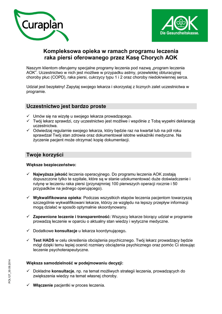 Kompleksowa opieka w ramach programu leczenia raka piersi oferowanego przez Kasę Chorych AOK Naszym klientom oferujemy specjalne programy leczenia pod nazwą „program leczenia AOK”. Uczestnictwo w nich jest możliwe w przypadku astmy, przewlekłej obturacyjnej choroby płuc (COPD), raka piersi, cukrzycy typu 1 i 2 oraz choroby niedokrwiennej serca. Udział jest bezpłatny! Zapytaj swojego lekarza i skorzystaj z licznych zalet uczestnictwa w programie. Uczestnictwo jest bardzo proste Umów się na wizytę u swojego lekarza prowadzącego. Twój lekarz sprawdzi, czy uczestnictwo jest możliwe i wspólnie z Tobą wypełni deklarację uczestnictwa. Odwiedzaj regularnie swojego lekarza, który będzie raz na kwartał lub na pół roku sprawdzał Twój stan zdrowia oraz dokumentował istotne wskaźniki medyczne. Na życzenie pacjent może otrzymać kopię dokumentacji. Twoje korzyści Większe bezpieczeństwo: Najwyższa jakość leczenia operacyjnego. Do programu leczenia AOK zostają dopuszczone tylko te szpitale, które są w stanie udokumentować duże doświadczenie i rutynę w leczeniu raka piersi (przynajmniej 100 pierwszych operacji rocznie i 50 przypadków na jednego operującego). Wykwalifikowana opieka: Podczas wszystkich etapów leczenia pacjentom towarzyszą szczególnie wykwalifikowani lekarze, którzy ze względu na lepszy przepływ informacji mogą działać w sposób optymalnie skoordynowany. Zapewnione leczenie i transparentność: Wszyscy lekarze biorący udział w programie prowadzą leczenie w oparciu o aktualny stan wiedzy i wytyczne medyczne. Dodatkowe konsultacje u lekarza koordynującego. POL127_30.09.2014 Test HADS w celu określenia obciążenia psychicznego. Twój lekarz prowadzący będzie mógł dzięki temu lepiej ocenić rozmiary obciążenia psychicznego oraz pomóc Ci stosując leczenie psychoterapeutyczne. Większa samodzielność w podejmowaniu decyzji: Dokładne konsultacje, np. na temat możliwych strategii leczenia, prowadzących do zwiększenia wiedzy na temat własnej choroby. Włączenie pacjentki w proces leczenia. Lepszy stan wiedzy: Zawsze dobrze poinformowane: Otrzymujesz bezpłatnie „Poradnik AOK dla kobiet z rakiem piersi“ oraz konkretne informacje na temat swojej choroby. Pomoc w podejmowaniu decyzji „zatrzymać czy usunąć pierś?“ oraz „usunięcie piersi – co będzie później?“ pomagają pacjentkom z małym guzem w wyborze wspólnie z lekarzem takiej drogi leczenia, która jest dla nich najlepsza. W tym celu wspomniane broszury przedstawiają w sposób poglądowy szanse i ryzyka różnych możliwości leczenia. Na życzenie 2 x rocznie informacja w formie bezpłatnego newslettera o raku piersi. Lepszy serwis: Udział w programie leczenia AOK jest dobrowolny i bezpłatny. Program premii AOK: Sumienne uczestnictwo w programie leczenia AOK jest premiowane 400 punktami rocznie. Oferty indywidualne: Możliwość udziału w specjalistycznych prelekcjach medycznych, kursach dot. doradztwa żywieniowego lub poświęconych tematyce zdrowotnej. Chętnie wspieramy pacjentów w zakresie ich indywidualnego trybu życia przy pomocy informacji i dedykowanych ofert. Więcej pytań? Dodatkowych informacji na temat programu leczenia AOK udziela każdy oddział AOK. Można również skontaktować się z nami pod numerem infolinii programu leczenia 0800 0336704*. Zapraszamy też do odwiedzenia naszej strony internetowej www.aok.de/bayern/curaplan. W rubryce „Lekarze, szpitale i więcej w programie leczenia AOK“ można wyszukać lekarzy uczestniczących programie leczenia AOK. Chętnie służymy pomocą. POL127_30.09.2014 * połączenie bezpłatne (pn. – śr. 8:00 - 16:30, czw. 8:00 - 17:30, pt. 8:00 - 15:00)