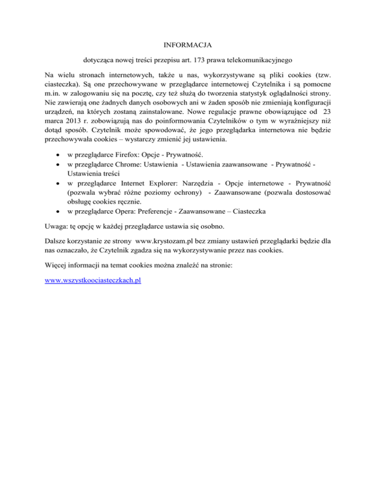 INFORMACJA dotycząca nowej treści przepisu art. 173 prawa telekomunikacyjnego Na wielu stronach internetowych, także u nas, wykorzystywane są pliki cookies (tzw. ciasteczka). Są one przechowywane w przeglądarce internetowej Czytelnika i są pomocne m.in. w zalogowaniu się na pocztę, czy też służą do tworzenia statystyk oglądalności strony. Nie zawierają one żadnych danych osobowych ani w żaden sposób nie zmieniają konfiguracji urządzeń, na których zostaną zainstalowane. Nowe regulacje prawne obowiązujące od 23 marca 2013 r. zobowiązują nas do poinformowania Czytelników o tym w wyraźniejszy niż dotąd sposób. Czytelnik może spowodować, że jego przeglądarka internetowa nie będzie przechowywała cookies – wystarczy zmienić jej ustawienia. w przeglądarce Firefox: Opcje - Prywatność. w przeglądarce Chrome: Ustawienia - Ustawienia zaawansowane - Prywatność Ustawienia treści w przeglądarce Internet Explorer: Narzędzia - Opcje internetowe - Prywatność (pozwala wybrać różne poziomy ochrony) - Zaawansowane (pozwala dostosować obsługę cookies ręcznie. w przeglądarce Opera: Preferencje - Zaawansowane – Ciasteczka Uwaga: tę opcję w każdej przeglądarce ustawia się osobno. Dalsze korzystanie ze strony www.krystozam.pl bez zmiany ustawień przeglądarki będzie dla nas oznaczało, że Czytelnik zgadza się na wykorzystywanie przez nas cookies. Więcej informacji na temat cookies można znaleźć na stronie: www.wszystkoociasteczkach.pl Nowe brzmienie art. 173: Art. 173. 1. Przechowywanie informacji lub uzyskiwanie dostępu do informacji już przechowywanej w telekomunikacyjnym urządzeniu końcowym abonenta lub użytkownika końcowego jest dozwolone, pod warunkiem że: 1) abonent lub użytkownik końcowy zostanie uprzednio bezpośrednio poinformowany w sposób jednoznaczny, łatwy i zrozumiały, o: a) celu przechowywania i uzyskiwania dostępu do tej informacji, b) możliwości określenia przez niego warunków przechowywania lub uzyskiwania dostępu do tej informacji za pomocą ustawień oprogramowania zainstalowanego w wykorzystywanym przez niego telekomunikacyjnym urządzeniu końcowym lub konfiguracji usługi; 2) abonent lub użytkownik końcowy, po otrzymaniu informacji, o których mowa w pkt 1, wyrazi na to zgodę; 3) przechowywana informacja lub uzyskiwanie do niej dostępu nie powoduje zmian konfiguracyjnych w telekomunikacyjnym urządzeniu końcowym abonenta lub użytkownika końcowego i oprogramowaniu zainstalowanym w tym urządzeniu. 2. Abonent lub użytkownik końcowy może wyrazić zgodę, o której mowa w ust. 1 pkt 2, za pomocą ustawień oprogramowania zainstalowanego w wykorzystywanym przez niego telekomunikacyjnym urządzeniu końcowym lub konfiguracji usługi. 3. Warunków, o których mowa w ust. 1, nie stosuje się, jeżeli przechowywanie lub uzyskanie dostępu do informacji, o której mowa w ust. 1, jest konieczne do: 1) wykonania transmisji telekomunikacyjnej; komunikatu za pośrednictwem publicznej sieci 2) dostarczania usługi telekomunikacyjnej lub usługi świadczonej drogą elektroniczną, żądanej przez abonenta lub użytkownika końcowego.