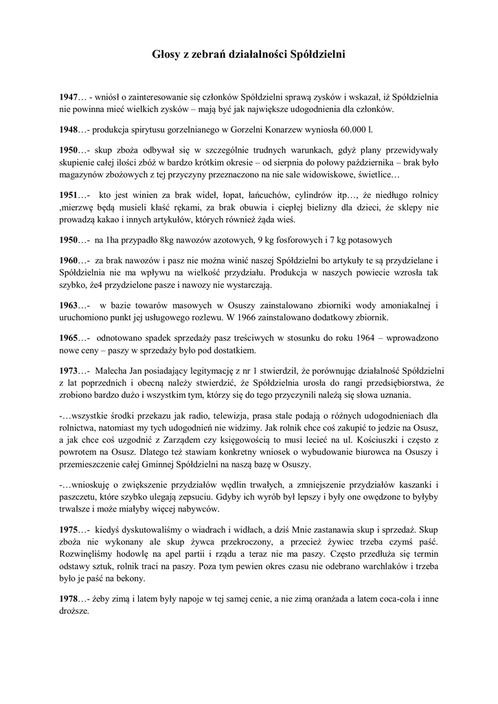Głosy z zebrań działalności Spółdzielni 1947… - wniósł o zainteresowanie się członków Spółdzielni sprawą zysków i wskazał, iż Spółdzielnia nie powinna mieć wielkich zysków – mają być jak największe udogodnienia dla członków. 1948…- produkcja spirytusu gorzelnianego w Gorzelni Konarzew wyniosła 60.000 l. 1950…- skup zboża odbywał się w szczególnie trudnych warunkach, gdyż plany przewidywały skupienie całej ilości zbóż w bardzo krótkim okresie – od sierpnia do połowy października – brak było magazynów zbożowych z tej przyczyny przeznaczono na nie sale widowiskowe, świetlice… 1951…- kto jest winien za brak wideł, łopat, łańcuchów, cylindrów itp…, że niedługo rolnicy ,mierzwę będą musieli kłaść rękami, za brak obuwia i ciepłej bielizny dla dzieci, że sklepy nie prowadzą kakao i innych artykułów, których również żąda wieś. 1950…- na 1ha przypadło 8kg nawozów azotowych, 9 kg fosforowych i 7 kg potasowych 1960…- za brak nawozów i pasz nie można winić naszej Spółdzielni bo artykuły te są przydzielane i Spółdzielnia nie ma wpływu na wielkość przydziału. Produkcja w naszych powiecie wzrosła tak szybko, że4 przydzielone pasze i nawozy nie wystarczają. 1963…- w bazie towarów masowych w Osuszy zainstalowano zbiorniki wody amoniakalnej i uruchomiono punkt jej usługowego rozlewu. W 1966 zainstalowano dodatkowy zbiornik. 1965…- odnotowano spadek sprzedaży pasz treściwych w stosunku do roku 1964 – wprowadzono nowe ceny – paszy w sprzedaży było pod dostatkiem. 1973…- Malecha Jan posiadający legitymację z nr 1 stwierdził, że porównując działalność Spółdzielni z lat poprzednich i obecną należy stwierdzić, że Spółdzielnia urosła do rangi przedsiębiorstwa, że zrobiono bardzo dużo i wszystkim tym, którzy się do tego przyczynili należą się słowa uznania. -…wszystkie środki przekazu jak radio, telewizja, prasa stale podają o różnych udogodnieniach dla rolnictwa, natomiast my tych udogodnień nie widzimy. Jak rolnik chce coś zakupić to jedzie na Osusz, a jak chce coś uzgodnić z Zarządem czy księgowością to musi lecieć na ul. Kościuszki i często z powrotem na Osusz. Dlatego też stawiam konkretny wniosek o wybudowanie biurowca na Osuszy i przemieszczenie całej Gminnej Spółdzielni na naszą bazę w Osuszy. -…wnioskuję o zwiększenie przydziałów wędlin trwałych, a zmniejszenie przydziałów kaszanki i paszczetu, które szybko ulegają zepsuciu. Gdyby ich wyrób był lepszy i były one owędzone to byłyby trwalsze i może miałyby więcej nabywców. 1975…- kiedyś dyskutowaliśmy o wiadrach i widłach, a dziś Mnie zastanawia skup i sprzedaż. Skup zboża nie wykonany ale skup żywca przekroczony, a przecież żywiec trzeba czymś paść. Rozwinęliśmy hodowlę na apel partii i rządu a teraz nie ma paszy. Często przedłuża się termin odstawy sztuk, rolnik traci na paszy. Poza tym pewien okres czasu nie odebrano warchlaków i trzeba było je paść na bekony. 1978…- żeby zimą i latem były napoje w tej samej cenie, a nie zimą oranżada a latem coca-cola i inne droższe. -…rolnikom specjalizującym się należy gwarantować pasze przecież oni muszą wszystko planować na zapas. Dlaczego obecnie produkuje się taką cegłę, że gdy dowiezie się ją do domu to jest sam gruz. Jak będzie z zaopatrzeniem w dni wolne od pracy. -… bezpośredni odbiór żywca obsługują ludzie, którzy czekają aż rolnicy sami załadują zwierzęta na samochód. -… dlaczego brak w sklepach czarnej pasty do obuwia, kakao i innych rzeczy do gospodarstwa domowego, dlaczego brak napoi chłodzących i wody sodowej w sklepie i barze w czasie żniw. -… należałoby zacząć analizować rolników, krórzy rozliczyli się z kontraktacji bo można powiedzieć z stanowczością, że 30% buduje socjalizm a reszta co robi. Dziś można powiedzieć, że przemysł nie nadąża z rolnictwem. Ludzi na wsi ciągle ubywa Anie można kupić zagrabiarki i roztrząsacza. -… ludzie za paszą czekają do wieczora, czy do czekania nie można udostępnić biur 1980… - mówił o zwiększeniu przydziału kawy dla sklepu nr 9 w Biadkach oraz wprowadzeniu piwa do tegoż sklepu.. -… wypowiedziała się na temat kontraktacji rzepaku przez GS. Stwierdziła, że chętnych do kontraktowania tej rosliny oleistej jest bardzo dużo, ale tylko niewielu rolników mogło zawrzeć umowę kontrakcyjną. -… przydział kawy na poszczególne sklepy określany jest wg klucza podziałowego i istnieje jedynie możliwość wewnętrznego skorygowania ilości dostaw między sklepami nr 4 i 9 w Biadkach -… nawozy są dzielone dla terenu miasta i gminy Krotoszyn. Norma przydziału stanowi 295kg NPK. 1989… - wniósł o poprawienie zaopatrzenia w margarynę oraz poinformował zebranych WZP, że w woj. Leszczyńskim jest lepsze zaopatrzenie w margarynę. -… z Ustkowa… zapytała się czy mają prawo do korzystania ze sklepu na równych warunkach z mieszkańcami wsi Wronów. 1990… - brak artykułów szkolnych na sklepach; pretensje o likwidowanie klubo-kawiarni oraz oddawanie sklepów w ajencję. -… zwróciła uwagę na złe zaopatrzenie sklepów oraz złą jakość chleba (stary, drogi) 1991… - w jednym zdaniu powiedział, że żadna dyskusja nie ma sensu, ponieważ doprowadzi do większej kłótni pomiędzy wsią a miastem, do czego już polityka państwa doprowadziła, a dyskusja nic nie zmieni ponieważ wszystkie zarządzenia i tak przychodzą odgórnie. 1994… - poruszył sprawę obsługi klienta, jest to zwłaszcza w dzisiejszej dobie sprawa ważna, bo rolnik raz źle obsłużony już nigdy do tej Spółdzielni nie przyjdzie. Należałoby uczulić pracowników na tą sprawę. W tej chwili rolnik nie ma dużego wpływu na pracę Spółdzielni, skala przedstawicielstwa rolników jest zbyt mała. To dlatego właśnie spadłą sprzedaż nawozów, że rolnik nie jest obsług