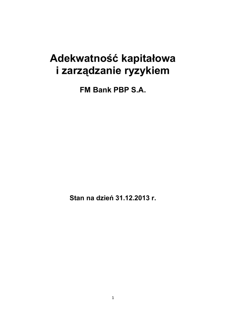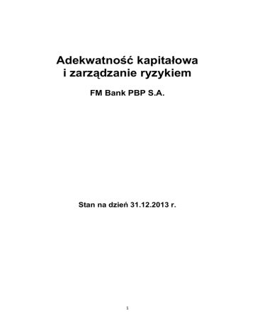 Adekwatność kapitałowa i zarządzanie ryzykiem FM Bank PBP S.A. Stan na dzień 31.12.2013 r. 1 SPIS TREŚCI I. INFORMACJE O BANKU ......................................................................................................................... 4 II. FUNDUSZE WŁASNE ................................................................................................................................ 4 III. ZARZĄDZANIE RYZYKIEM ............................................................................................................... 7 IV. REGULACYJNE WYMOGI KAPITAŁOWE ................................................................................... 17 IV.A. ZEWNĘTRZNE OCENY WIARYGODNOŚCI KREDYTOWEJ ................................................................ 19 KAPITAŁ WEWNĘTRZNY ..................................................................................................................... 22 V. VI. INFORMACJE UZUPEŁNIAJĄCE .................................................................................................... 23 VI.A. VI.B. VI.C. VI.D. RYZYKO KREDYTOWE I RYZYKO ROZMYCIA ................................................................................ 23 RYZYKO KREDYTOWE KONTRAHENTA .......................................................................................... 28 EKSPOZYCJE KAPITAŁOWE NIEUWZGLĘDNIONE W PORTFELU HANDLOWYM ............................. 29 OBLICZANIE WYMOGÓW KAPITAŁOWYCH NA KWOTY EKSPOZYCJI SEKURYTYZACYJNYCH WAŻONE RYZYKIEM ......................................................................................................................................... 29 VII. INFORMACJE DOTYCZĄCE POLITYKI ZMIENNYCH SKŁADNIKÓW WYNAGRODZEŃ OSÓB ZAJMUJĄCYCH STANOWISKA KIEROWNICZE ......................................................................... 30 2 Wstęp Raport „Adekwatność kapitałowa i zarządzanie ryzykiem – FM Bank PBP S.A.” (zwany dalej „Raportem”) został przygotowany zgodnie z wymogami Uchwały nr 385/2008 Komisji Nadzoru Finansowego z dnia 17 grudnia 2008 r. w sprawie szczegółowych zasad i sposobu ogłaszania przez banki informacji o charakterze jakościowym i ilościowym dotyczących adekwatności kapitałowej oraz zakresu informacji podlegających ogłaszaniu z późniejszymi zmianami, a także zasadami wyrażonymi w „Polityce Informacyjnej FM Bank PBP S.A.” Niniejszy Raport przedstawia informacje dotyczące strategii oraz procesów Banku odnośnie zarządzania ryzykiem, struktury kapitałów Banku oraz jego adekwatności kapitałowej. Informacje w raporcie przedstawione są w ujęciu jednostkowym, według stanu na dzień 31 grudnia 2013 r. Słownik: Ekspozycja kredytowa – suma wierzytelności pieniężnych i zobowiązań pozabilansowych Banku wynikająca z tytułu transakcji kredytowych; Kapitał ekonomiczny (EC) – oszacowana przez Bank kwota, niezbędna do pokrycia wszystkich zidentyfikowanych, istotnych rodzajów ryzyka występujących w działalności Banku oraz zmian otoczenia gospodarczego, uwzględniająca przewidywany poziom ryzyka zgodnie z procedurą wewnętrzną „Proces oceny adekwatności kapitału wewnętrznego (ICAAP)”; Kapitał regulacyjny (RC) – kwota całkowitego wymogu kapitałowego ustalona jako suma wymogów kapitałowych z tytułu poszczególnych rodzajów ryzyka oraz wymogów kapitałowych z tytułu przekroczenia limitów i naruszenia innych norm określonych w ustawie Prawo bankowe, obliczonych zgodnie z procedurą wewnętrzną „Zasady wyznaczania wymogów kapitałowych z tytułu poszczególnych rodzajów ryzyka”; Uchwała 76/2010 KNF z późn. zm. – Uchwała Nr 76/2010 Komisji Nadzoru Finansowego z dnia 10 marca 2010 r. w sprawie zakresu i szczegółowych zasad wyznaczania wymogów kapitałowych z tytułu poszczególnych rodzajów ryzyka oraz Uchwały: 369/2010 KNF z dnia 12 października 2010r., 206/2011 z dnia 22 sierpnia 2011r. i 324/2011 z dnia 20 grudnia 2011r.; Uchwała 325/2011 KNF – Uchwała Nr 325/2011 Komisji Nadzoru Finansowego z dnia 20 grudnia 2011r. w sprawie innych pomniejszeń funduszy podstawowych, ich wysokości, zakresu i warunków pomniejszania o nie funduszy podstawowych banku, innych pozycji bilansu banku zaliczanych do funduszy uzupełniających, ich wysokości, zakresu i warunków ich zaliczania do funduszy uzupełniających banku, pomniejszeń funduszy uzupełniających, ich wysokości, zakresu i warunków pomniejszania o nie funduszy uzupełniających banku oraz zakresu i sposobu uwzględniania działania banków w holdingach w obliczaniu funduszy własnych; Uchwała 386/2008 KNF z późn. zm. – Uchwała Nr 386/2008 KNF z dnia 17 grudnia 2008r. w sprawie ustalenia wiążących banki norm płynności oraz Uchwała 324/2011 z dnia 20 grudnia 2011 r. Jeśli nie zaznaczono inaczej, wszelkie dane prezentowane są wg stanu na 31 grudnia 2013 roku w tys. zł. Ewentualne różnice w sumach i udziałach wynikają z zaokrągleń kwot do pełnych tysięcy złotych oraz zaokrągleń udziałów procentowych do jednego miejsca dziesiętnego. 3 I. Informacje o Banku Nazwa Banku: FM Bank PBP S.A. (do dnia 1 lipca 2013 roku: Polski Bank Przedsiębiorczości Spółka Akcyjna) dalej „Bank” Siedziba: ul. Domaniewska 39A 02 – 672 Warszawa Bank jest wpisany do KRS prowadzonego przez Sąd Rejonowy dla m. st. Warszawy w Warszawie, XIII Wydział Gospodarczy Krajowego Rejestru Sądowego pod numerem 0000030330. W dniu 1 lipca 2013 roku nastąpiła rejestracja w rejestrze przedsiębiorców Krajowego Rejestru Sądowego połączenia Polskiego Banku Przedsiębiorczości S.A. (dalej „PBP”) z FM Bank S.A., w wyniku którego powstał FM Bank PBP S.A. Na dzień 31 grudnia 2013 roku jednostką dominującą wobec Banku jest spółka PL Holdnigs S.a.r.l (99,59% akcji), która jest podmiotem zależnym od Abris-EMP Capital Partners Limited (dalej: „ABRIS”), przez co spółka ABRIS jest ostatecznym podmiotem dominującym wobec Banku. Zgodnie ze