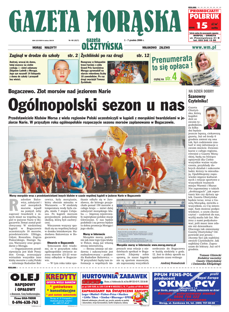 REKLAMA PROMOCJA!!! POLBRUK cena: 15 z∏/m2 netto *oferta wa˝na do wyczerpania zapasów MIRPOL - ORNETA ul. Przemys∏owa 21 B ISSN 1233-9369 Nr indeksu 350176 1 - 7 grudnia 2006 r. Nr 46 (617) tel. 055 242 15 00 220005razr-U -W Zaginà∏ w drodze do szko∏y www.wm.pl MI¸AKOWO ZALEWO MORÑG MA¸DYTY str. 2 ˚ychliƒski po raz drugi Andrzej, wracaj do domu, tutaj wszyscy na ciebie czekajà — mówi za∏amany Zbigniew Ludwik z Moràga. Jego syn wyszed∏ 14 listopada z domu do szko∏y i przepad∏ bez wieÊci. str. 12 Rozegrany w listopadzie trzeci turniej z cyklu Grand Prix burmistrza Moràga zgromadzi∏ na starcie rekordowà liczb´ 18 zawodników. Po raz drugi zwyci´˝y∏ Tomasz ˚ychliƒski. 44406otbp-a Bogaczewo. Zlot morsów nad jeziorem Narie NA DZIE¡ DOBRY Ogólnopolski sezon u nas Przedstawiciele Klubów Morsa z wielu regionów Polski uczestniczyli w kàpieli z moràskimi twardzielami w jeziorze Narie. W przysz∏ym roku ogólnopolskie rozpocz´cie sezonu morsów zaplanowano w Bogaczewie. Morsy moràskie wraz z przedstawicielami innych klubów w czasie wspólnej kàpieli w jeziorze Narie w Bogaczewie ados∏aw Balcewicz, za∏o˝yciel i szef moràskich morsów, wpad∏ na pomys∏, ˝eby zaprosiç twardzieli z innych miast na wspólnà kàpiel w jeziorze Narie w Bogaczewie.Temat zosta∏ podchwycony. W niedzielnej kàpieli w Bogaczewie uczestniczy∏o 18 morsów, przedstawiciele: Elblàga, Gdyni, Koszalina, Zegrza Pomorskiego, Starego Sàcza, Warszawy oraz gospodarze z Moràga. — Organizatorem przedsi´wzi´cia jest klub Posejdon Group, zrzeszajàcy wirtualnie wszystkie inne kluby morsów z ca∏ej Polski — informuje Rados∏aw Bal- R cewicz, by∏y morà˝anin, który obecnie mieszka w Warszawie. — W niedziel´ temperatura wody by∏a ciep∏a, mia∏a 7 stopni Celsjusza. Po kàpieli morsom przyjezdnym pokazaliÊmy okolic´, którà byli zachwyceni. Wieczorem wszyscy spotkali si´ na wspólnej kolacji w domku letniskowym Rados∏awa Balcewicza w Bogaczewie. Otwarcie w Bogaczewie Tymczasem dziÊ wiadomo, ˝e w przysz∏ym roku ogólnopolskie otwarcie sezonu morsów (21-23 wrzeÊnia) odb´dzie w Bogaczewie. — W tym roku takie spo- tkanie odby∏o si´ w Jaros∏awcu, do którego przyjecha∏o ponad 150 morsów z ca∏ego kraju — mówi dalej za∏o˝yciel moràskiego klubu. — Imprez´ rejestrowa∏y najwi´ksze polskie stacje telewizyjne. U nas b´dzie podobnie i na pewno b´dzie to dobra promocja Moràga i jego okolic. Morsy w Internecie Moràskie morsy, podobnie jak inne tego typu kluby w Polsce, majà ju˝ w∏asnà stron´ internetowà. — Strona istnieje od niedawna i sukcesywnie jest rozbudowywana — podkreÊla Rados∏aw Balcewicz. — W przysz∏oÊci b´dà tam informacje o wspólnych im- Moràskie morsy w Internecie: www.morag.morsy.pl prezach oraz relacje z niedzielnych spotkaƒ w Bogaczewie. Zdajemy sobie sprawà, ˝e nasze kàpiele nie sà sportem masowym, ale zapraszamy wszystkich serdecznie do Bogaczewa w ka˝dà niedziel´ o godz. 12. Jest to dobry sposób na sp´dzenie czasu wolnego Andrzej Romaƒczuk Szanowny Czytelniku! Gazeta Olsztyƒska, którà kupi∏eÊ dziÊ ze swoim tygodnikiem, za kilka dni b´dzie jeszcze lepszà, ciekawszà gazetà. Ju˝ od Êrody 6 grudnia zmieni si´ ona tak, byÊ codziennie znalaz∏ w niej informacje o swoim mieÊcie. Dziennikarze z ca∏ego regionu, równie˝ z Gazety Moràskiej, b´dà na bie˝àco opisywali dla Ciebie wszystkie wa˝ne wydarzenia, przyk∏ady dobrych dzia∏aƒ i sukcesów ludzi, którzy tu mieszkajà. Opublikujemy zapowiedzi imprez kulturalnych i relacje sportowe z wszystkich wa˝nych miejsc Warmii i Mazur. Nie zapomnimy o takich „drobiazgach”, jak repertuary kin czy dy˝ury aptek. Gazeta Olsztyƒska b´dzie teraz, wraz z Gazetà Moràskà, mówi∏a o wszystkim, co Ci´ interesuje. Sam mo˝esz podpowiedzieç, o czym chcesz czytaç – zadzwoƒ do nas, wyÊlij maila lub list. Mo˝esz z nami podyskutowaç, jeÊli masz inne zdanie ni˝ dziennikarz. Dlaczego tak zmieniamy Gazet´ Olsztyƒskà? Odpowiedê jest prosta – chcemy byç jak najbli˝ej swoich Czytelników. Jak najbli˝ej Ciebie. Zapraszam do lektury. Ju˝ od 6 grudnia. Tomasz Gliniecki Redaktor naczelny Gazety Olsztyƒskiej i Dziennika Elblàskiego REKLAMA – OLEJ NAP¢DOWY i OPA¸OWY HURTOWNIA ZABAWEK OFERTA WIELU BANKÓW Olsztyn, ul. Ko∏obrzeska 36, tel./fax 089 533-42-91, 533-36-00 * gotówkowe * konsolidacyjne pn.-pt. 8.00-18.00, sb. 8.00-15.00 ● W NIEDZIELE 3, 10, 17 grudnia od 9.00 do 15.00 z dowozem. Ceny konkurencyjne. * pod zastaw samochodu Firma GIGA-THERM Moràg, ul. 11 Listopada 2 (budynek poczty, I pi´tro) tel. (089)757-48-47 0-696-638-763 132806mozm-a -M 149106mozm-a -M ZAPRASZAMY NA ÂWIÑTECZNE ZAKUPY Lego•Mattel•Fisher-Price•Hasbro •Little Tikes •Simba•Bburago•EPEE Zabawki edukacyjne, pluszaki, gry, puzzle, pojazdy na peda∏y i akumulator, stroje karnawa∏owe, kartki Êwiàteczne, balony PPUH FENS-POL producent profil Royal Europa OKNA PCV standard K 1.0 drzwi Gerda, parapety, ˝aluzje i rolety, zadaszenia na drzwi Kominki - autoryzowany monta˝ 0600 766 322 Akcesoria kominkowe Moràg, ul. Zamkowa 34, tel. (089) 757-60-88 506706otbr-a-M 125705mozm-b -S