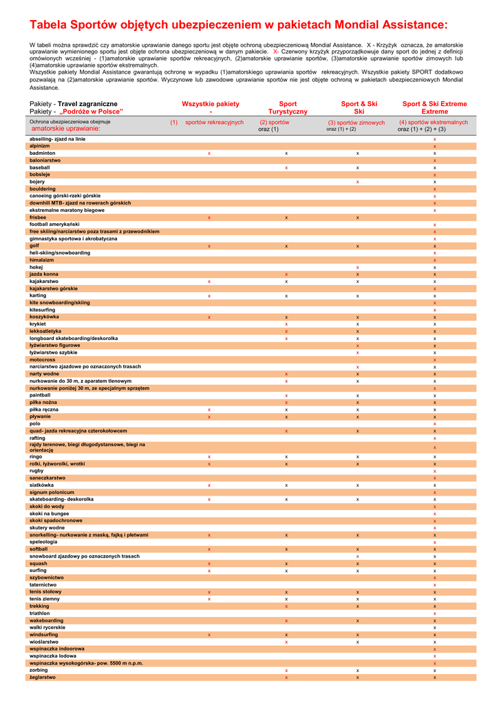 Tabela Sportów objętych ubezpieczeniem w pakietach Mondial Assistance: W tabeli można sprawdzić czy amatorskie uprawianie danego sportu jest objęte ochroną ubezpieczeniową Mondial Assistance. X - Krzyżyk oznacza, że amatorskie uprawianie wymienionego sportu jest objęte ochrona ubezpieczeniową w danym pakiecie. X- Czerwony krzyżyk przyporządkowuje dany sport do jednej z definicji omówionych wcześniej - (1)amatorskie uprawianie sportów rekreacyjnych, (2)amatorskie uprawianie sportów, (3)amatorskie uprawianie sportów zimowych lub (4)amatorskie uprawianie sportów ekstremalnych. Wszystkie pakiety Mondial Assistance gwarantują ochronę w wypadku (1)amatorskiego uprawiania sportów rekreacyjnych. Wszystkie pakiety SPORT dodatkowo pozwalają na (2)amatorskie uprawianie sportów. Wyczynowe lub zawodowe uprawianie sportów nie jest objęte ochroną w pakietach ubezpieczeniowych Mondial Assistance. Pakiety - Travel zagraniczne Pakiety - „Podróże w Polsce” Ochrona ubezpieczeniowa obejmuje Wszystkie pakiety (1) sportów rekreacyjnych amatorskie uprawianie: abseiling- zjazd na linie alpinizm badminton baloniarstwo baseball bobsleje bojery bouldering canoeing górski-rzeki górskie downhill MTB- zjazd na rowerach górskich ekstremalne maratony biegowe frisbee football amerykański free skiiing/narciarstwo poza trasami z przewodnikiem gimnastyka sportowa i akrobatyczna golf heli-skiing/snowboarding himalaizm hokej jazda konna kajakarstwo kajakarstwo górskie karting kite snowboarding/skiing kitesurfing koszykówka krykiet lekkoatletyka longboard skateboarding/deskorolka łyżwiarstwo figurowe łyżwiarstwo szybkie motocross narciarstwo zjazdowe po oznaczonych trasach narty wodne nurkowanie do 30 m, z aparatem tlenowym nurkowanie poniżej 30 m, ze specjalnym sprzętem paintball piłka nożna piłka ręczna pływanie polo quad- jazda rekreacyjna czterokołowcem rafting rajdy terenowe, biegi długodystansowe, biegi na orientację ringo rolki, łyżworolki, wrotki rugby saneczkarstwo siatkówka signum polonicum skateboarding- deskorolka skoki do wody skoki na bungee skoki spadochronowe skutery wodne snorkelling- nurkowanie z maską, fajką i płetwami speleologia softball snowboard zjazdowy po oznaczonych trasach squash surfing szybownictwo taternictwo tenis stołowy tenis ziemny trekking triathlon wakeboarding walki rycerskie windsurfing wioślarstwo wspinaczka indoorowa wspinaczka lodowa wspinaczka wysokogórska- pow. 5500 m n.p.m. zorbing żeglarstwo x Sport Turystyczny (2) sportów oraz (1) Sport & Ski Ski (3) sportów zimowych oraz (1) + (2) x x x x x x x (4) sportów ekstremalnych oraz (1) + (2) + (3) x x x x x x x x x x x x x x x x x x x x x x x x x x x x x x x x x x x x x x x x x x x x x x x x x x x x x x x x x x x x x x x x x x x x x x x x x x x x x x x x x x x x x x x x x x x x x x x Sport & Ski Extreme Extreme x x x x x x x x x x x x x x x x x x x x x x x x x x x x x x x x x x x x x x x x x x x x x x x x x x x x x x x x x x x x x x x x x