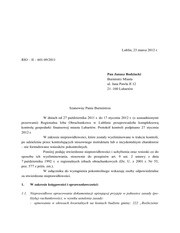 Lublin, 23 marca 2012 r. RIO – II – 601/49/2011 Pan Janusz Bodziacki Burmistrz Miasta ul. Jana Pawła II 12 21–100 Lubartów Szanowny Panie Burmistrzu W dniach od 27 października 2011 r. do 17 stycznia 2012 r. (z uzasadnionymi przerwami) Regionalna Izba Obrachunkowa w Lublinie przeprowadziła kompleksową kontrolę gospodarki finansowej miasta Lubartów. Protokół kontroli podpisano 27 stycznia 2012 r. W zakresie nieprawidłowości, które zostały wyeliminowane w trakcie kontroli, po udzieleniu przez kontrolujących stosownego instruktażu lub o incydentalnym charakterze – nie formułowano wniosków pokontrolnych. Poniżej podaję stwierdzone nieprawidłowości i uchybienia oraz wnioski co do sposobu ich wyeliminowania, stosownie do przepisów art. 9 ust. 2 ustawy z dnia 7 października 1992 r. o regionalnych izbach obrachunkowych (Dz. U. z 2001 r. Nr 55, poz. 577 z późn. zm.). W załączniku do wystąpienia pokontrolnego wskazuję osoby odpowiedzialne za stwierdzone nieprawidłowości. 1. W zakresie księgowości i sprawozdawczości: 1.1. Nieprawidłowe opracowanie dokumentacji opisującej przyjęte w jednostce zasady (politykę) rachunkowości, w wyniku ustalenia zasady: - ujmowania w okresach kwartalnych na kontach budżetu gminy: 222 „Rozliczenie 2 dochodów budżetowych” i 223 „Rozliczenie wydatków budżetowych” rozliczeń z jednostkami budżetowymi, a na kontach: 901 „Dochody budżetu” i 902 „Wydatki budżetu” jednorazowo na koniec roku, - dokonywania przypisu należności na koncie 221 "Należności z tytułu dochodów budżetowych" w okresach kwartalnych, a w konsekwencji prowadzenie w ten sposób ewidencji księgowej w zakresie należności z tytułu podatków oraz opłat za zajęcie pasa drogowego, - nieujmowania na koncie 201 „Rozrachunki z odbiorcami i dostawcami” rozrachunków z kontrahentami uregulowanych w miesiącu powstania zobowiązania oraz ustalenia zasady ujmowania na tym koncie należności z tytułu dochodów budżetowych (opłaty adiacenckiej oraz jednorazowej opłaty z tytułu wzrostu wartości nieruchomości - w związku ze zmianą planu miejscowego), a konsekwencji prowadzenie w ten sposób ewidencji księgowej – str. 5 – 7, 12 - 13 protokołu. Dokonać zmian w dokumentacji opisującej przyjęte zasady (politykę) rachunkowości przez ustalenie zasady ujmowania w księgach rachunkowych danego okresu sprawozdawczego operacji gospodarczych dotyczących tego okresu, w tym: - na kontach budżetu miasta (222, 223, 901, 902,), wskazując, że na tych kontach ujmuje się dochody budżetowe zrealizowane przez jednostki budżetowe oraz wydatki dokonane przez te jednostki w wysokości wynikającej z okresowych (miesięcznych) sprawozdań tych jednostek, - na koncie Urzędu Miasta 221 „Należności z tytułu dochodów budżetowych” wprowadzając obowiązek dokonywania w każdym okresie sprawozdawczym przypisów i odpisów należności miasta z tytułu dochodów budżetowych, - na koncie 201 „Rozrachunki z odbiorcami i dostawcami” ustalając obowiązek ujmowania na bieżąco wszystkich rozrachunków z kontrahentami, Stosownie do przepisów art. 10 ust. 1 pkt 3 lit. a oraz art. 20 ust. 1 ustawy z dnia 29 września 1994 r. o rachunkowości (Dz. U. z 2009 r. Nr 152, poz. 1223 z późn. zm.) w związku z przepisami § 18 ust. 2 rozporządzenia Ministra Finansów z dnia 5 lipca 2010 r. w sprawie szczególnych zasad rachunkowości oraz planów kont dla budżetu państwa, budżetów jednostek samorządu terytorialnego, jednostek budżetowych, samorządowych zakładów budżetowych, państwowych funduszy celowych oraz państwowych jednostek budżetowych mających siedzibę poza granicami Rzeczypospolitej Polskiej (Dz. U. Nr 128, poz. 861 z późn.zm.), zwanego w dalszej części tego wystąpienia „rozporządzeniem Ministra Finansów z 5 lipca 2010 r.”, mając na uwadze przepisy art. 40 ust. 2 pkt 2 ustawy z dnia 27 sierpnia 2009 r. o finansach publicznych (Dz. U. Nr 157, poz. 1240 z późn. zm.) Ustalenie i bieżąca aktualizacja dokumentacji opisującej przyjęte przez 3 jednostkę zasady rachunkowości należy do obowiązków kierownika jednostki, stosownie do przepisów art. 10 ust. 2 ustawy o rachunkowości. 1.2. Prowadzenie ewidencji analitycznej do kont 013 "Pozostałe środki trwałe" oraz 020 "Wartości niematerialne i prawne" niezgodnie ze sposobem określonym w dokumentacji opisującej przyjęte zasady prowadzenia rachunkowości (ręcznie zamiast komputerowo) – str. 9 protokołu. Konta ksiąg pomocniczych prowadzić w sposób określony w dokumentacji opisującej przyjęte zasady rachunkowości, przy pomocy programów w niej wskazanych, zgodnie z przepisami art. 10 ust. 1 pkt 3 ustawy o rachunkowości lub rozważyć dostosowanie postanowień przepisów wewnętrznych do faktycznych potrzeb jednostki. 1.3. Niesporządzanie w 2010 r. oraz w okresie styczeń – wrzesień 2011 r. zestawień obrotów dzienników częściowych. Nieprawidłowe sporządzanie w okresie styczeń - czerwiec 2011 r. zestawień obrotów i sald kont księgi głównej, w wyniku niewykazywania w nich obrotów za okres sprawozdawczy oraz sumy obrotów za okres sprawozdawczy. Niesporządzenie na koniec 2010 r. zestawień sald kont ksiąg pomocniczych prowadzonych do konta 020 "Wartości niematerialne i prawne" oraz 013 „Pozostałe środki trwałe” – str. 9 - 10 protokołu. Przy prowadzeniu dzienników częściowych, grupujących zdarzenia według ich rodzajów, sporządzać zestawienia obrotów tych dzienników za dany okres sprawozdawczy, stosownie do przepisów art. 14 ust. 3 ustawy o rachunkowości. Na koniec każdego okresu sprawozdawczego, nie rzadziej niż na koniec miesiąca, sporządzać kompletne zestawienie obrotów i sald kont księgi głównej, zawierające m.in. obroty za okres sprawozdawczy oraz sumę obrotów za okres sprawozdawczy, a co najmniej na dzień zamknięcia ksiąg rachunkowych sporządzać zestawienia sald wszystkich kont 