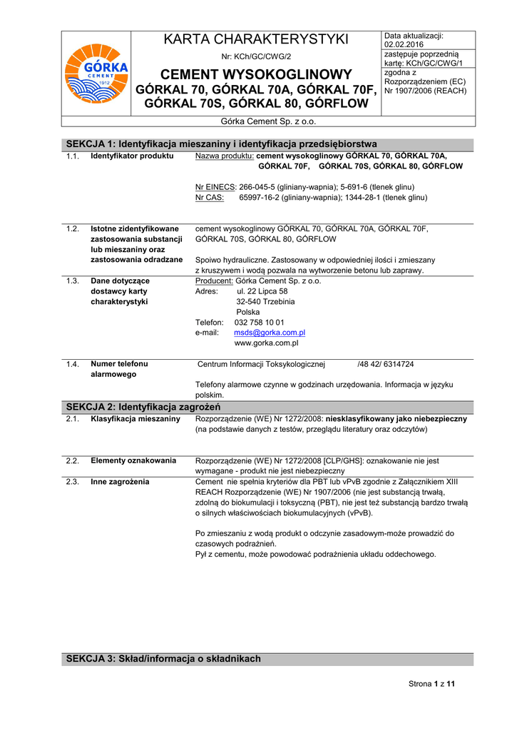 KARTA CHARAKTERYSTYKI Nr: KCh/GC/CWG/2 CEMENT WYSOKOGLINOWY GÓRKAL 70, GÓRKAL 70A, GÓRKAL 70F, GÓRKAL 70S, GÓRKAL 80, GÓRFLOW Data aktualizacji: 02.02.2016 zastępuje poprzednią kartę: KCh/GC/CWG/1 zgodna z Rozporządzeniem (EC) Nr 1907/2006 (REACH) Górka Cement Sp. z o.o. SEKCJA 1: Identyfikacja mieszaniny i identyfikacja przedsiębiorstwa 1.1. Identyfikator produktu Nazwa produktu: cement wysokoglinowy GÓRKAL 70, GÓRKAL 70A, GÓRKAL 70F, GÓRKAL 70S, GÓRKAL 80, GÓRFLOW Nr EINECS: 266-045-5 (gliniany-wapnia); 5-691-6 (tlenek glinu) Nr CAS: 65997-16-2 (gliniany-wapnia); 1344-28-1 (tlenek glinu) 1.2. Istotne zidentyfikowane zastosowania substancji lub mieszaniny oraz zastosowania odradzane 1.3. Dane dotyczące dostawcy karty charakterystyki 1.4. Numer telefonu alarmowego cement wysokoglinowy GÓRKAL 70, GÓRKAL 70A, GÓRKAL 70F, GÓRKAL 70S, GÓRKAL 80, GÓRFLOW Spoiwo hydrauliczne. Zastosowany w odpowiedniej ilości i zmieszany z kruszywem i wodą pozwala na wytworzenie betonu lub zaprawy. Producent: Górka Cement Sp. z o.o. Adres: ul. 22 Lipca 58 32-540 Trzebinia Polska Telefon: 032 758 10 01 e-mail: [email protected] www.gorka.com.pl Centrum Informacji Toksykologicznej /48 42/ 6314724 Telefony alarmowe czynne w godzinach urzędowania. Informacja w języku polskim. SEKCJA 2: Identyfikacja zagrożeń 2.1. Klasyfikacja mieszaniny Rozporządzenie (WE) Nr 1272/2008: niesklasyfikowany jako niebezpieczny (na podstawie danych z testów, przeglądu literatury oraz odczytów) 2.2. Elementy oznakowania 2.3. Inne zagrożenia Rozporządzenie (WE) Nr 1272/2008 [CLP/GHS]: oznakowanie nie jest wymagane - produkt nie jest niebezpieczny Cement nie spełnia kryteriów dla PBT lub vPvB zgodnie z Załącznikiem XIII REACH Rozporządzenie (WE) Nr 1907/2006 (nie jest substancją trwałą, zdolną do biokumulacji i toksyczną (PBT), nie jest też substancją bardzo trwałą o silnych właściwościach biokumulacyjnych (vPvB). Po zmieszaniu z wodą produkt o odczynie zasadowym-może prowadzić do czasowych podrażnień. Pył z cementu, może powodować podrażnienia układu oddechowego. SEKCJA 3: Skład/informacja o składnikach Strona 1 z 11 KARTA CHARAKTERYSTYKI Nr: KCh/GC/CWG/2 CEMENT WYSOKOGLINOWY GÓRKAL 70, GÓRKAL 70A, GÓRKAL 70F, GÓRKAL 70S, GÓRKAL 80, GÓRFLOW Data aktualizacji: 02.02.2016 zastępuje poprzednią kartę: KCh/GC/CWG/1 zgodna z Rozporządzeniem (EC) Nr 1907/2006 (REACH) Górka Cement Sp. z o.o. 3.1. Substancje Nr REACH 1344-28-1 Udział [%] 0-30 65997-16-2 70-100 wyłączony Nazwa EINECS CAS Tlenek glinu 215-691-6 Gliniany wapnia 266-045-5 01-2119529248-35-0012 01-2119529248-35-0114 01-2119529248-35-0095 01-2119529248-35-0000 01-2119529248-35 Nie zawiera: - rozpuszczalnego chromu VI – zawartość chromu VI kontrolowana zgodnie z PN EN 196-10 poniżej 2 ppm. Nie są stosowne reduktory chromu - respirabilnej krzemionki krystalicznej. SEKCJA 4: Środki pierwszej pomocy 4.1. Opis środków pierwszej pomocy Uwagi ogólne Osoby udzielające pierwszej pomocy nie muszą zakładać odzieży i sprzętu ochronnego. Pracownicy pierwszej pomocy powinni unikać kontaktu z mokrym cementem. W następstwie kontaktu z oczami Nie pocierać oczu w celu uniknięcia możliwego uszkodzenia rogówki poprzez nacisk. Zdjąć soczewki kontaktowe. Przechylić głowę na stronę uszkodzonego oka, szeroko rozewrzeć powieki i niezwłocznie rozpocząć płukanie oka (oczu) dużą ilością czystej wody. Spłukiwanie powinno trwać przynajmniej 20 minut tak, aby usunąć wszystkie cząsteczki. Podczas spłukiwania unikać przedostania się cząsteczek do nieuszkodzonego oka. Jeśli to możliwe, użyć wody izotonicznej (0,9% NaCl). Skontaktować się ze specjalistą z zakresu medycyny pracy lub okulistą. W następstwie kontaktu ze skórą W przypadku suchego cementu, usunąć cement i spłukać obficie wodą. W przypadku mokrego/wilgotnego cementu, skórę spłukać obficie wodą. Usunąć zanieczyszczoną odzież, obuwie, zegarki, itp. i dokładnie wyczyścić przed ponownym użyciem. Zasięgnąć pomocy lekarza w przypadku wszelkich podrażnień lub oparzeń. W następstwie wdychania Wyjść na świeże powietrze. Pył w gardle i przewodzie nosowym powinien usunąć się spontanicznie. Skontaktować się z lekarzem, jeśli podrażnienie utrzymuje się lub rozwinie się w późniejszym czasie lub gdy dyskomfort, kaszel lub inne symptomy się utrzymują. W następstwie spożycia Nie wywoływać wymiotów. Jeśli osoba jest przytomna, wypłukać usta wodą oraz podać dużą ilość wody do picia. Niezwłocznie skontaktować się z lekarzem lub z zakładem toksykologii. 4.2. Najważniejsze ostre i Oczy: Strona 2 z 11 KARTA CHARAKTERYSTYKI Nr: KCh/GC/CWG/2 CEMENT WYSOKOGLINOWY GÓRKAL 70, GÓRKAL 70A, GÓRKAL 70F, GÓRKAL 70S, GÓRKAL 80, GÓRFLOW Data aktualizacji: 02.02.2016 zastępuje poprzednią kartę: KCh/GC/CWG/1 zgodna z Rozporządzeniem (EC) Nr 1907/2006 (REACH) Górka Cement Sp. z o.o. opóźnione objawy oraz skutki narażenia kontakt cementu (suchego lub mokrego) z oczami może spowodować podrażnienia mechaniczne. Skóra: brak konkretnych skutków. Wdychanie: powtarzające się wdychanie pyłu z cementu glinowego przez dłuższy czas, jak w przypadku każdego innego pyłu, może zwiększać ryzyko chorób płuc. 4.3. Wskazania dotyczące wszelkiej natychmiastowej pomocy lekarskiej i szczególnego postępowania z poszkodowanym Nie wymaga się specjalnych środków pierwszej pomocy. Podczas wizyty u lekarza zaleca się okazanie Karty charakterystyki. SEKCJA 5: Postępowanie w przypadku pożaru 5.1. 5.2. 5.3. Środki gaśnicze Szczególne zagrożenia związane z substancją lub mieszaniną Informacje dla straży pożarnej Środki gaśnicze nie są wymagane –produkt jest niepalny Cement jest niepalny i niewybuchowy, nie przyspiesza i nie utrzymuje spalania się innych materiałów. Cement nie stwarza żadnego zagrożenia związanego z pożarem. Strażacy nie muszą korzystać ze specjalnego 