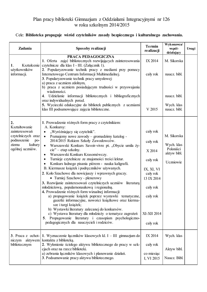 Plan pracy biblioteki Gimnazjum z Oddziałami Integracyjnymi nr 126