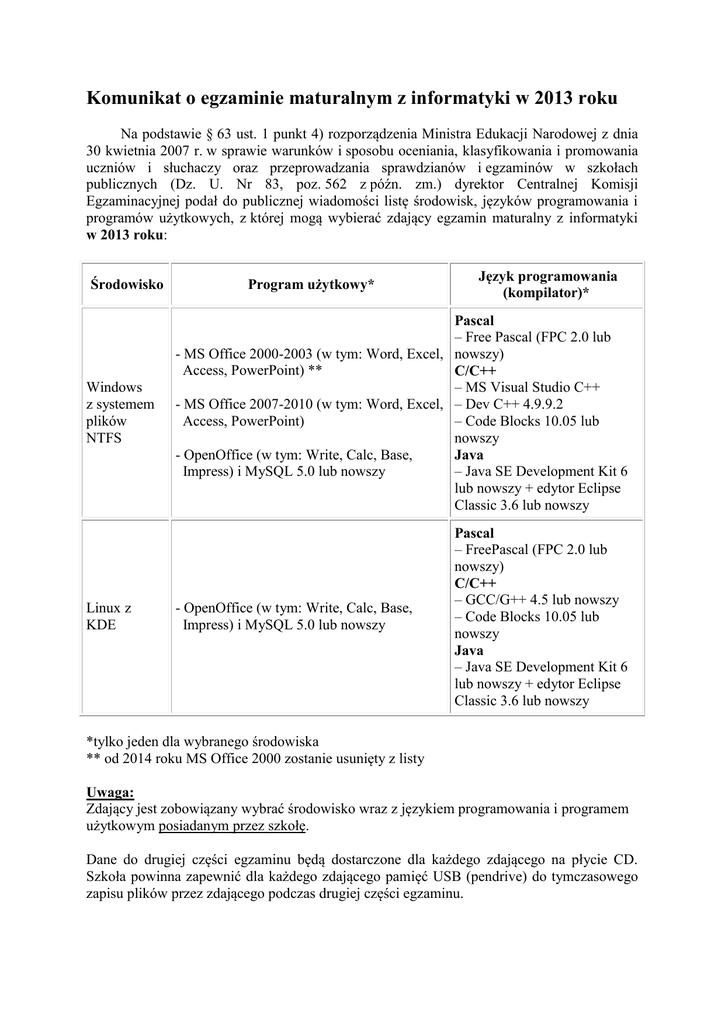 Komunikat o egzaminie maturalnym z informatyki w 2013 roku Na podstawie § 63 ust. 1 punkt 4) rozporządzenia Ministra Edukacji Narodowej z dnia 30 kwietnia 2007 r. w sprawie warunków i sposobu oceniania, klasyfikowania i promowania uczniów i słuchaczy oraz przeprowadzania sprawdzianów i egzaminów w szkołach publicznych (Dz. U. Nr 83, poz. 562 z późn. zm.) dyrektor Centralnej Komisji Egzaminacyjnej podał do publicznej wiadomości listę środowisk, języków programowania i programów użytkowych, z której mogą wybierać zdający egzamin maturalny z informatyki w 2013 roku: Środowisko Windows z systemem plików NTFS Linux z KDE Program użytkowy* Język programowania (kompilator)* Pascal – Free Pascal (FPC 2.0 lub - MS Office 2000-2003 (w tym: Word, Excel, nowszy) Access, PowerPoint) ** C/C++ – MS Visual Studio C++ - MS Office 2007-2010 (w tym: Word, Excel, – Dev C++ 4.9.9.2 Access, PowerPoint) – Code Blocks 10.05 lub nowszy - OpenOffice (w tym: Write, Calc, Base, Java – Java SE Development Kit 6 Impress) i MySQL 5.0 lub nowszy lub nowszy + edytor Eclipse Classic 3.6 lub nowszy - OpenOffice (w tym: Write, Calc, Base, Impress) i MySQL 5.0 lub nowszy Pascal – FreePascal (FPC 2.0 lub nowszy) C/C++ – GCC/G++ 4.5 lub nowszy – Code Blocks 10.05 lub nowszy Java – Java SE Development Kit 6 lub nowszy + edytor Eclipse Classic 3.6 lub nowszy *tylko jeden dla wybranego środowiska ** od 2014 roku MS Office 2000 zostanie usunięty z listy Uwaga: Zdający jest zobowiązany wybrać środowisko wraz z językiem programowania i programem użytkowym posiadanym przez szkołę. Dane do drugiej części egzaminu będą dostarczone dla każdego zdającego na płycie CD. Szkoła powinna zapewnić dla każdego zdającego pamięć USB (pendrive) do tymczasowego zapisu plików przez zdającego podczas drugiej części egzaminu.
