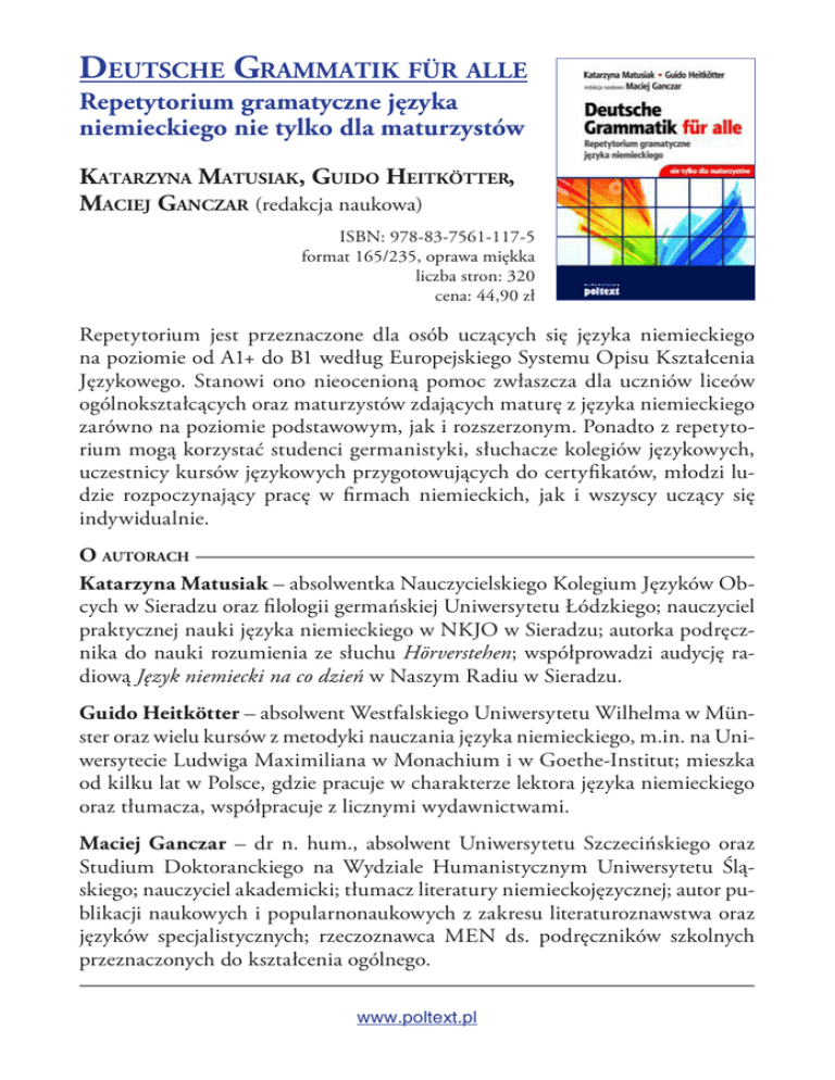 Deutsche Grammatik für alle Repetytorium gramatyczne języka niemieckiego nie tylko dla maturzystów Katarzyna Matusiak, Guido Heitkötter, Maciej Ganczar (redakcja naukowa) ISBN: 978-83-7561-117-5 format 165/235, oprawa miękka liczba stron: 320 cena: 44,90 zł Repetytorium jest przeznaczone dla osób uczących się języka niemieckiego na poziomie od A1+ do B1 według Europejskiego Systemu Opisu Kształcenia Językowego. Stanowi ono nieocenioną pomoc zwłaszcza dla uczniów liceów ogólnokształcących oraz maturzystów zdających maturę z języka niemieckiego zarówno na poziomie podstawowym, jak i rozszerzonym. Ponadto z repetytorium mogą korzystać studenci germanistyki, słuchacze kolegiów językowych, uczestnicy kursów językowych przygotowujących do certyfikatów, młodzi ludzie rozpoczynający pracę w firmach niemieckich, jak i wszyscy uczący się indywidualnie. O autorach Katarzyna Matusiak – absolwentka Nauczycielskiego Kolegium Języków Obcych w Sieradzu oraz filologii germańskiej Uniwersytetu Łódzkiego; nauczyciel praktycznej nauki języka niemieckiego w NKJO w Sieradzu; autorka podręcznika do nauki rozumienia ze słuchu Hörverstehen; współprowadzi audycję radiową Język niemiecki na co dzień w Naszym Radiu w Sieradzu. Guido Heitkötter – absolwent Westfalskiego Uniwersytetu Wilhelma w Münster oraz wielu kursów z metodyki nauczania języka niemieckiego, m.in. na Uniwersytecie Ludwiga Maximiliana w Monachium i w Goethe-Institut; mieszka od kilku lat w Polsce, gdzie pracuje w charakterze lektora języka niemieckiego oraz tłumacza, współpracuje z licznymi wydawnictwami. Maciej Ganczar – dr n. hum., absolwent Uniwersytetu Szczecińskiego oraz Studium Doktoranckiego na Wydziale Humanistycznym Uniwersytetu Śląskiego; nauczyciel akademicki; tłumacz literatury niemieckojęzycznej; autor publikacji naukowych i popularnonaukowych z zakresu literaturoznawstwa oraz języków specjalistycznych; rzeczoznawca MEN ds. podręczników szkolnych przeznaczonych do kształcenia ogólnego. www.poltext.pl Deutsche Grammatik für alle Spis treĈci Säowo wstöpne ................................................................................. 7 Lista skrótów ................................................................................... 8 1. 2. 3. 4. 5. 6. 7. 8. 9. 10. 11. 12. 13. 14. 15. 16. 17. 18. 19. 20. 21. 22. 23. 24. 25. 26. 27. 28. 29. 30. 31. Odmiana czasowników ............................................................... 9 Czasowniki haben, sein i werden .............................................. 15 Czasowniki modalne ................................................................ 17 Znaczenia czasowników modalnych ........................................... 21 Czasowniki zwrotne .................................................................. 26 Czasowniki zäoĔone .................................................................. 34 Czas teraĒniejszy Präsens ........................................................ 39 Czas przeszäy Perfekt ............................................................... 41 Perfekt z haben i sein .............................................................. 50 Czas przeszäy Präteritum .......................................................... 54 Czas zaprzeszäy Plusquamperfekt .............................................. 61 Czas przyszäy Futur I ................................................................. 63 Tryb rozkazujñcy ....................................................................... 65 Tryb przypuszczajñcy Konjunktiv II .............................................. 71 Strona bierna Vorgangspassiv ................................................... 79 Bezokolicznik z zu i bez zu ........................................................ 84 Imiesäowy Partizip Präsens oraz Partizip Perfekt ......................... 88 Rekcja czasowników ................................................................ 92 Rodzaj rzeczownika .................................................................. 95 Deklinacja rzeczowników w liczbie pojedynczej ............................ 99 Deklinacja rzeczowników w liczbie mnogiej ............................... 103 Deklinacja nazw wäasnych ....................................................... 108 Deklinacja rzeczowników odprzymiotnikowych i odimiesäowowych ... 111 Rekcja rzeczowników .............................................................. 113 Deklinacja przymiotników ........................................................ 116 Stopniowanie przymiotników ................................................... 121 Rekcja przymiotników ............................................................. 125 Liczebniki .............................................................................. 127 OkreĈlenia czasu ................................................................... 131 Przysäówki ............................................................................. 134 Rodzajniki ............................................................................. 139 www.poltext.pl 5 Deutsche Grammatik für alle 32. 33. 34. 35. 36. 37. 38. 39. 40. 41. 42. 43. 44. 45. 46. 47. 48. 49. 50. 51. 52. 53. 54. 55. 56. 57. 58. Zaimki osobowe .................................................................... Zaimki dzierĔawcze ................................................................ Zaimki wskazujñce ................................................................. Zaimki nieokreĈlone .............................................................. Zaimki pytajne ....................................................................... Zaimki wzglödne .................................................................... Zaimek es ............................................................................. Przyimki z biernikiem .............................................................. Przyimki z celownikiem .........................