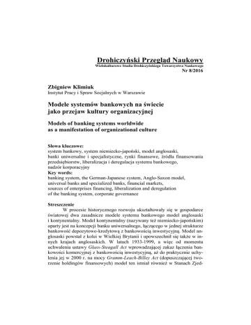 Drohiczyński Przegląd Naukowy Wielokulturowe Studia Drohiczyńskiego Towarzystwa Naukowego Nr 8/2016 Zbigniew Klimiuk Instytut Pracy i Spraw Socjalnych w Warszawie Modele systemów bankowych na świecie jako przejaw kultury organizacyjnej Models of banking systems worldwide as a manifestation of organizational culture Słowa kluczowe: system bankowy, system niemiecko-japoński, model anglosaski, banki uniwersalne i specjalistyczne, rynki finansowe, źródła finansowania przedsiębiorstw, liberalizacja i deregulacja systemu bankowego, nadzór korporacyjny Key words: banking system, the German-Japanese system, Anglo-Saxon model, universal banks and specialized banks, financial markets, sources of enterprises financing, liberalization and deregulation of the banking system, corporate governance Streszczenie W procesie historycznego rozwoju ukształtowały się w gospodarce światowej dwa zasadnicze modele systemu bankowego model anglosaski i kontynentalny. Model kontynentalny (nazywany też niemiecko-japońskim) oparty jest na koncepcji banku uniwersalnego, łączącego w jednej strukturze bankowość depozytowo-kredytową z bankowością inwestycyjną. Model anglosaski powstał z kolei w Wielkiej Brytanii i upowszechnił się także w innych krajach anglosaskich. W latach 1933-1999, a więc od momentu uchwalenia ustawy Glass-Steagall Act wprowadzającej zakaz łączenia bankowości komercyjnej z bankowością inwestycyjną, aż do praktycznie uchylenia jej w 2000 r. na mocy Gramm-Leach-Billey Act (dopuszczającej tworzenie holdingów finansowych) model ten istniał również w Stanach Zjed- 162 Zbigniew Klimiuk noczonych. Odseparowanie w USA banków depozytowo-kredytowych od działalności na rynku kapitałowym (transakcje w dziedzinie emisji i obrotu papierami wartościowymi) było reakcją na Wielki Kryzys (1929-32), którego przyczyn upatrywano m.in. w spekulacji giełdowej prowadzonej przez banki bez zachowania należytej ostrożności i troski o wkłady oszczędnościowe powierzone im przez deponentów. Relacja finanse – gospodarka w różnych państwach jest różnorodna w zależności od natury systemu finansowego, w szczególności od odpowiedniej roli długu oraz aktywów. Zależy również od modelu regulacji korporacyjnej. Niemiecki oraz brytyjski system finansowy są często przeciwstawiane jako „bankowy” oraz „rynkowy”. Abstract In the process of historical development two basic models of the banking system were established – Anglo-Saxon model and the continental one. Continental model (known also as German-Japanese model) is based on the concept of a universal bank, which combines in a single structure both deposit banking and lending-investment banking. Anglo-Saxon model was, on the other hand, formed in the UK and became widespread in other Anglo-Saxon countries. In the period 1933-1999, that is since the enactment of Glass-Steagall Act which banned combining of commercial banking with investment banking until the said acts has been repealed in 2000 under the Gramm-Leach-Billey Act (which allowed to create financial holding companies), this model existed also in the United States. Separation in the US of deposit and loan banking operations from the capital market activities (transactions in the field of issuing and trading securities) was introduced as a reaction to the Great Depression (1929-32), whose causes were ascribed i.a. to the speculative trading conducted by banks without due diligence and due concern for savings entrusted by depositors. Relations between the spheres of finance and economy in various countries differ depending on the nature of the financial system, in particular on the respective roles of debt and assets. They also depend on the model of corporate regulations. German and British financial systems are often contrasted as “bank-based” and “market-based” ones. Modele systemów bankowych na świecie jako przejaw kultury organizacyjnej 163 Wstęp W ciągu ostatnich kilkudziesięciu lat systemy finansowe różnych krajów podlegały przekształceniom i ewoluowały. Nie można jednak stwierdzić, iż w każdym państwie jednakowo, bowiem o kształcie, jaki dany system przybrał w danym kraju, decydował dominujący tam rodzaj związków między przedsiębiorstwami a instytucjami finansowymi (przede wszystkim bankami) oraz uwarunkowania historyczno-kulturowe1. Śledząc te procesy można wyróżnić trzy podstawowe fazy2. 1. Kapitalizm właścicielski – dominującymi instytucjami finansowymi tej fazy były banki depozytowe, tj. banki, których główną funkcją było przyjmowanie oszczędności różnych podmiotów (osób fizycznych oraz przedsiębiorstw). Następnie środki te w przeważającej większości wykorzystywane były na zabezpieczone pożyczki. Ta faza rozwoju systemu finansowego nazwana jest właścicielską, ponieważ podmioty gospodarcze w niej występujące były zazwyczaj firmami rodzinnymi, których właścicielem i zarządzającym była jedna osoba bądź rodzina. Etap ten obejmuje gospodarkę typu rolniczego, gdzie większość dochodów pochodziła właśnie z tego sektora oraz początkowe stadium uprzemysłowienia. Finansowanie potrzeb rozwojowych małych podmiotów gospodarczych było możliwe dzięki własnym zyskom i oszczędnościom. 2. Kapitalizm menedżerski – głównymi instytucjami finansowymi, obok banków komercyjnych, były tam banki inwestycyjne zajmujące się emisją i obrotem papierami wartościowymi, doradztwem finansowym oraz zarządzaniem różnego rodzaju funduszami. Powstały także pozabankowe instytucje finansowe umożliwiające alternatywne sposoby alokacji oszczędności takie jak towarzystwa ubezpieczeniowe czy fundusze powiernicze. Coraz większego znaczenia nabierały rynki finansowe, które umożliwiały indywidualnym osobom i instytucjom gromadzącym oszczędności ulokowanie tych środków w papiery wartościowe będące w obrocie giełdowym – pożyczki państwowe, pożyczki