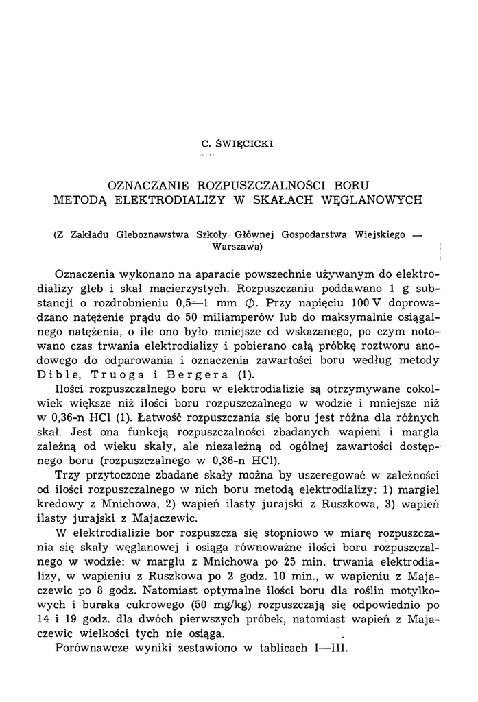 с. Ś w i ę c i c k i OZNACZANIE ROZPUSZCZALNOŚCI BORU METODĄ ELEKTRODIALIZY W SKAŁACH WĘGLANOWYCH (Z Z akładu G leb o zn a w stw a S zk o ły G łów n ej W arszaw a) G ospodarstw a W iejsk iego — Oznaczenia wykonano na aparacie powszechnie używanym do elektrodializy gleb i skał macierzystych. Rozpuszczaniu poddawano 1 g sub stancji o rozdrobnieniu 0,5— 1 mm 0 . Przy napięciu 100 V doprowa dzano natężenie prądu do 50 m iliamperów lub do maksymalnie osiągal nego natężenia, o ile ono było mniejsze od wskazanego, po czym noto wano czas trwania elektrodializy i pobierano całą próbkę roztworu ano dowego do odparowania i oznaczenia zawartości boru według m etody D i b l e , T r u o g a i B e r g e r a (1). Ilości rozpuszczalnego boru w elektrodializie są otrzym ywane cokol wiek większe niż ilości boru rozpuszczalnego w wodzie i m niejsze niż w 0,36-n HCl (1). Łatwość rozpuszczania się boru jest różna dla różnych skał. Jest ona funkcją rozpuszczalności zbadanych wapieni i margla zależną od wieku skały, ale niezależną od ogólnej zawartości dostęp nego boru (rozpuszczalnego w 0,36-n HC1). Trzy przytoczone zbadane skały można by uszeregować w zależności od ilości rozpuszczalnego w nich boru metodą elektrodializy: 1) margiel kredowy z Mnich owa, 2) wapień ilasty jurajski z Ruszkowa, 3) wapień ilasty jurajski z Majaczewic. W elektrodializie bor rozpuszcza się stopniowo w miarę rozpuszcza nia się skały węglanowej i osiąga równoważne ilości boru rozpuszczal nego w wodzie: w marglu z Mnichowa po 25 min. trwania elektrodia lizy, w wapieniu z Ruszkowa po 2 godz. 10 min., w wapieniu z Maja czewic po 8 godz. Natomiast optymalne ilości boru dla roślin m otylko wych i buraka cukrowego (50 mg/kg) rozpuszczają się odpowiednio po 14 i 19 godz. dla dwóch pierwszych próbek, natomiast wapień z Maja czewic wielkości tych nie osiąga. Porównawcze wyniki zestawiono w tablicach I— III. 192 С. Ś w ięcicki Tablica I C harak terystyk a badanych w a p ien i i m argla Bor rozpuszczalny Lp. M iejscow ość C aC 03 N azw a h 2o % po 30 godz. elektrodializy 0,36-n HC1 m g na 1 kg 1 2 3 M nichów R uszków M ajaczew ice m argiel kredow y w ap ień ila sty jurajski w ap ień ila sty jurajski 58.8 85,6 88.9 0,14 0,20 0,14 3.0 3.0 3,6 0,790 0,655 0,240 T a b l i c a II P orów n anie rozpuszczalności boru w w od zie w 0,36-n HC1 i w elek trod ializie M iejscow ość Lp. 1 2 3 Bor rozpuszczalny w H 20 w % rozpuszcz. w 0,36-n HC1 Bor rozpuszczalny w elektrod ializie po 30 godz. w % rozpuszcz. w 0,36-n HC1 4,7 6,9 3,9 26,4 21,8 6,7 M nichów R uszków M ajaczew ice Tablica Bor rozpuszczalny w elek trod ializie w m g/kg w a p ien ia lub m argla Czas trw ania elek trod ializy w godz. W apień z M ajaczew ic W apień z R uszkow a M argiel z M nichow a 2 4 6 8 10 12 14 16 18 20 22 24 26 28 30 0,050 0,080 0,110 0,140 0,160 0,180 0,185 0,190 0,200 0,205 0,215 0,220 0,230 0,235 0,240 0,140 0,220 0,245 0,260 0,270 0,380 0,450 0,470 0,485 0,500 0,600 0,645 0,650 0,650 0,655 0,220 0,260 0,290 0,330 0,385 0,440 0,500 0,550 0,605 0,640 0,650 0,695 0,725 0,750 0,790 rozpuszcza się w d alszym ciągu III Oznaczanie rozpuszczalności boru m etodą elek tro d ia lizy 193 L IT ER A TU R A 1. D i b 1 e W. T., T г u o g E. and B e r g e r K. C., B oron d eterm in ation in so ils and p lan ts, A n al, ch em istry, 26, 2, 418— 421 (1954). 2. M a k s i m ó w A., E lek tro filtra cja gleb. W arszaw a. Ч. С ВЕ Н Ц И Ц К И О П Р Е Д Е Л Е Н И Е Р А С Т В О РИ М О С Т И Б О Р А М ЕТОДОМ Э Л Е К Т Р О Д И А Л И З А В И ЗВ Е С Т К О В Ы Х П О Р О Д А Х (К аф едра П очвоведения Главной сельскохозяйственной школы, Варш ава) Ре з юме И сследовалась скорость растворения бора в различных известковы х породах при помощ и электродиализа. Установлено, что скорость растворения бора по степенна и зависит от растворимости и возраста породы, но не зависит от общ его содерж ания доступного растениям бора (растворимого в 0,36-n НС1). с, Ś w ię c ic k i THE DETERMINATION OF BORON IN CARBONATE ROCKS BY THE ELECTRODIALYSIS METHOD (The C hair of S o il S cien ce of th e M ain C ollege of R ural E conom ics — W arszaw a) Summar y The velocity of boron dissolution in various carbonate rocks was investigated by means of electrodialysis. The velocity of dissolution proved to proceed gradually and was shown to depend upon the age of the rock and its solubility, but it does not depend upon the general content of boron available to plants (soluble in 0,36-n HC1). 13 Rocznik gleboznawczy