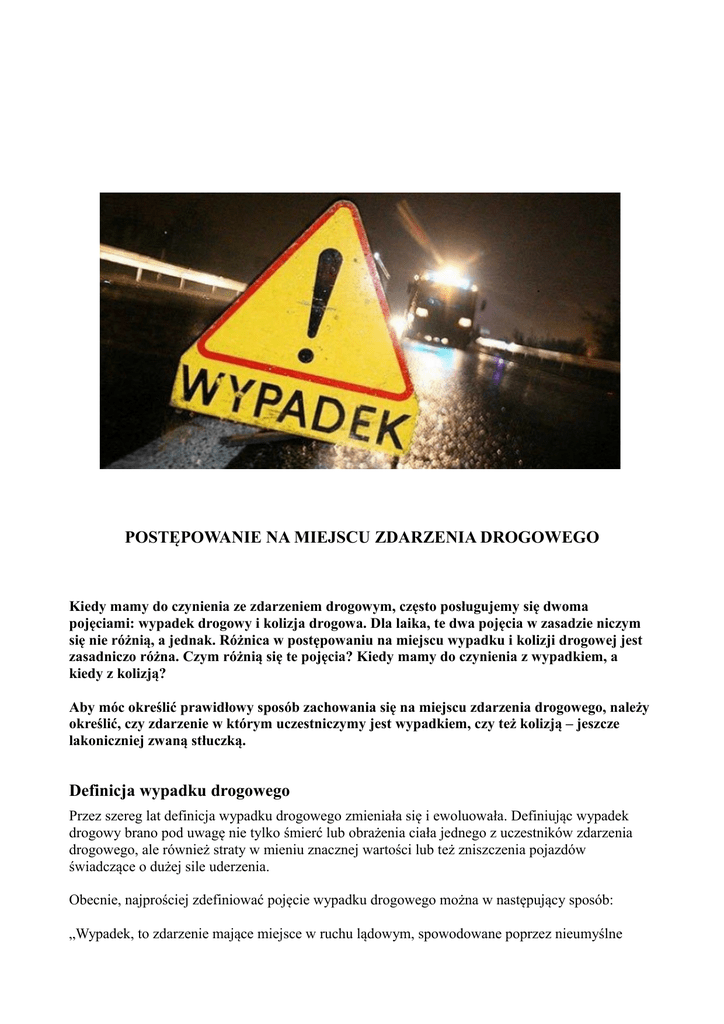 POSTĘPOWANIE NA MIEJSCU ZDARZENIA DROGOWEGO Kiedy mamy do czynienia ze zdarzeniem drogowym, często posługujemy się dwoma pojęciami: wypadek drogowy i kolizja drogowa. Dla laika, te dwa pojęcia w zasadzie niczym się nie różnią, a jednak. Różnica w postępowaniu na miejscu wypadku i kolizji drogowej jest zasadniczo różna. Czym różnią się te pojęcia? Kiedy mamy do czynienia z wypadkiem, a kiedy z kolizją? Aby móc określić prawidłowy sposób zachowania się na miejscu zdarzenia drogowego, należy określić, czy zdarzenie w którym uczestniczymy jest wypadkiem, czy też kolizją – jeszcze lakoniczniej zwaną stłuczką. Definicja wypadku drogowego Przez szereg lat definicja wypadku drogowego zmieniała się i ewoluowała. Definiując wypadek drogowy brano pod uwagę nie tylko śmierć lub obrażenia ciała jednego z uczestników zdarzenia drogowego, ale również straty w mieniu znacznej wartości lub też zniszczenia pojazdów świadczące o dużej sile uderzenia. Obecnie, najprościej zdefiniować pojęcie wypadku drogowego można w następujący sposób: „Wypadek, to zdarzenie mające miejsce w ruchu lądowym, spowodowane poprzez nieumyślne naruszenie zasad bezpieczeństwa obowiązujących w tym ruchu, którego skutkiem jest śmierć jednego z uczestników lub obrażenia ciała powodujące naruszenie czynności narządu ciała lub rozstrój zdrowia trwające dłużej niż 7 dni”. Warto w tym miejscu zaznaczyć, że naruszenie czynności narządu ciała lub rozstrój zdrowia trwające dłużej niż 7 dni określa lekarz i nie jest to jednoznaczne ze zwolnieniem lekarskim wystawionym w związku z uczestniczeniem w zdarzeniu drogowym. Przestępstwo wypadku komunikacyjnego zostało spenalizowane w art. 177 kodeksu karnego, którego to przedmiotem ochrony jest z jednej strony bezpieczeństwo w ruchu, a z drugiej stronyzdrowie i życie ludzkie. Odpowiedzialność karna za spowodowanie wypadku komunikacyjnego możliwa jest w przypadku ustalenia, że w wyniku naruszenia obowiązujących sprawcę w konkretnych okolicznościach zasad bezpieczeństwa w ruchu, doszło do powstania wskazanych w ustawie skutków. Definicja kolizji drogowej. „Kolizja, to zdarzenie mające miejsce w ruchu lądowym, spowodowane poprzez nieumyślne naruszenie zasad bezpieczeństwa obowiązujących w tym ruchu, którego skutkiem są straty materialne (uszkodzenie pojazdu, płotu, urządzenia drogowego, bagażu, itp.) lub też jeden z uczestników doznał obrażeń ciała powodujących naruszenie czynności narządu ciała lub rozstrój zdrowia trwające poniżej 7 dni”. Określenia kolizji drogowej nie znajdziemy ani w Ustawie Prawo o ruchu drogowym, ani też w kodeksie wykroczeń. To określenie potoczne, które przyjęło się i jest stosowane, zarówno przez policjantów, organy sądownicze i ubezpieczeniowe, jak i przez wszystkich uczestników ruchu drogowego. Łatwiej takie zdarzenie określić mianem „kolizji” niż „wypadku, w którym nie ma ofiar”. Sposób postępowania świadka wypadku drogowego. Zabezpiecz miejsce zdarzenia: - zaparkuj swój pojazd tak, aby osłonić miejsce wypadku i zabezpieczyć przed najechaniem przez inne pojazdy, - nałóż kamizelkę odblaskową, - włącz światła awaryjne, wystaw trójkąt (y) ostrzegawczy (e) – własny i z pojazdów uczestniczących w wypadku; w miarę możliwości zabezpiecz miejsce wypadku z obu stron najazdu, Oceń liczbę rannych i ich obrażenia (będzie to ważne w momencie wzywania służb ratowniczych – np. ilość karetek pogotowia ratunkowego), Oceń środki techniczne niezbędne do udzielenia pomocy poszkodowanym (będzie to ważne w momencie wzywania służb ratowniczych – np. czy zachodzi konieczność skierowania na miejsce wypadku pojazdu ratownictwa drogowego Państwowej Straży Pożarnej), Wezwij służby ratownicze - wystarczy połączenie telefoniczne z jednym z podanych numerów alarmowych: 112, 997,998,999; Twój komunikat winien zawierać następujące informacje: dane zgłaszającego i numer telefonu kontaktowego, miejsce zdarzenia – możliwa trasa dojazdu, liczba rannych i obrażenia, potrzeby dot. środków technicznych, itp. - jeżeli nie możesz spełnić powyższego warunku, spróbuj zatrzymać inne pojazdy bo sam możesz nie być skuteczny wdziałaniu, Udziel pierwszej pomocy poszkodowanym Zbliżając się do pojazdów, które uległy wypadkowi : - zachowaj szczególną ostrożność, - spróbuj zatrzymać inne pojazdy – zapewnij sobie pomoc - weź ze swojego pojazdu gaśnicę, - weź ze swojego pojazdu apteczkę, - weź ze swojego pojazdu narzędzia, którymi będziesz mógł zbić szybę lub pomogą Ci w dotarciu do uwięzionych we wrakach ofiar, - weź ze swojego pojazdu nóż do cięcia pasów bezpieczeństwa lub inne ostre narzędzie, które może go zastąpić ( scyzoryk, nóż myśliwski, itp.) -oceń, czy pojazd nie ulegnie niekontrolowanemu niebezpiecznemu ruchowi lub przemieszczeniu, -sprawdź czy z pojazdu (-ów) nie wycieka lub nie ulatnia się medium napędowe, Jak zachować się uczestnicząc w zdarzeniu drogowym ? WYPADEK DROGOWY KOLIZJA DROGOWA Jest (są) zabity (ci) lub ranny (i) Zabezpiecz miejsce zdarzenia Nie usuwaj żadnego z pojazdów z miejsca zdarzenia, nie przemieszczaj ich Nie ma zabitych lub rannych Zabezpiecz miejsce zdarzenia Usuń pojazd (y) z miejsca zdarzenia, jeśli stoi w takim miejscu, że mogą zagrażać bezpieczeństwu w ruchu lub ruch ten utrudniać. W przypadku nieusunięcia pojazdów można narazić się na mandat karny za tamowanie lub utrudnianie ruchu na drodze publicznej lub w strefie zamieszkania. Oceń liczbę rannych i ich obrażenia; oceń środki techniczne niezbędne do udzielenia pomocy poszkodowanym Wezwij służby ratownicze i Policję Udziel pierwszej pomocy poszkodowanym Pozostań na miejscu wypadku do przyjazdu Policji Zabezpiecz ślady przed ich zniszczeniem lub przemieszczeniem; nie podejmuj żadnych czynności, które mogłyby utru