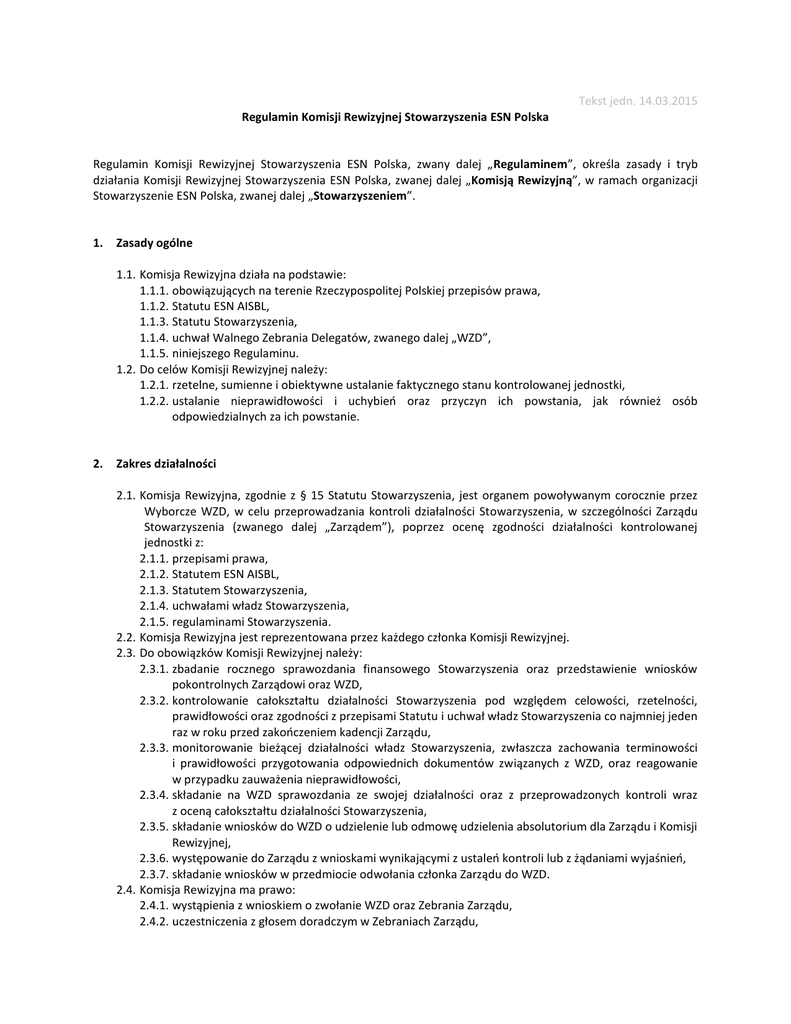 Tekst jedn. 14.03.2015 Regulamin Komisji Rewizyjnej Stowarzyszenia ESN Polska Regulamin Komisji Rewizyjnej Stowarzyszenia ESN Polska, zwany dalej „Regulaminem”, określa zasady i tryb działania Komisji Rewizyjnej Stowarzyszenia ESN Polska, zwanej dalej „Komisją Rewizyjną”, w ramach organizacji Stowarzyszenie ESN Polska, zwanej dalej „Stowarzyszeniem”. 1. Zasady ogólne 1.1. Komisja Rewizyjna działa na podstawie: 1.1.1. obowiązujących na terenie Rzeczypospolitej Polskiej przepisów prawa, 1.1.2. Statutu ESN AISBL, 1.1.3. Statutu Stowarzyszenia, 1.1.4. uchwał Walnego Zebrania Delegatów, zwanego dalej „WZD”, 1.1.5. niniejszego Regulaminu. 1.2. Do celów Komisji Rewizyjnej należy: 1.2.1. rzetelne, sumienne i obiektywne ustalanie faktycznego stanu kontrolowanej jednostki, 1.2.2. ustalanie nieprawidłowości i uchybieo oraz przyczyn ich powstania, jak również osób odpowiedzialnych za ich powstanie. 2. Zakres działalności 2.1. Komisja Rewizyjna, zgodnie z § 15 Statutu Stowarzyszenia, jest organem powoływanym corocznie przez Wyborcze WZD, w celu przeprowadzania kontroli działalności Stowarzyszenia, w szczególności Zarządu Stowarzyszenia (zwanego dalej „Zarządem”), poprzez ocenę zgodności działalności kontrolowanej jednostki z: 2.1.1. przepisami prawa, 2.1.2. Statutem ESN AISBL, 2.1.3. Statutem Stowarzyszenia, 2.1.4. uchwałami władz Stowarzyszenia, 2.1.5. regulaminami Stowarzyszenia. 2.2. Komisja Rewizyjna jest reprezentowana przez każdego członka Komisji Rewizyjnej. 2.3. Do obowiązków Komisji Rewizyjnej należy: 2.3.1. zbadanie rocznego sprawozdania finansowego Stowarzyszenia oraz przedstawienie wniosków pokontrolnych Zarządowi oraz WZD, 2.3.2. kontrolowanie całokształtu działalności Stowarzyszenia pod względem celowości, rzetelności, prawidłowości oraz zgodności z przepisami Statutu i uchwał władz Stowarzyszenia co najmniej jeden raz w roku przed zakooczeniem kadencji Zarządu, 2.3.3. monitorowanie bieżącej działalności władz Stowarzyszenia, zwłaszcza zachowania terminowości i prawidłowości przygotowania odpowiednich dokumentów związanych z WZD, oraz reagowanie w przypadku zauważenia nieprawidłowości, 2.3.4. składanie na WZD sprawozdania ze swojej działalności oraz z przeprowadzonych kontroli wraz z oceną całokształtu działalności Stowarzyszenia, 2.3.5. składanie wniosków do WZD o udzielenie lub odmowę udzielenia absolutorium dla Zarządu i Komisji Rewizyjnej, 2.3.6. występowanie do Zarządu z wnioskami wynikającymi z ustaleo kontroli lub z żądaniami wyjaśnieo, 2.3.7. składanie wniosków w przedmiocie odwołania członka Zarządu do WZD. 2.4. Komisja Rewizyjna ma prawo: 2.4.1. wystąpienia z wnioskiem o zwołanie WZD oraz Zebrania Zarządu, 2.4.2. uczestniczenia z głosem doradczym w Zebraniach Zarządu, 2.4.3. zwracania się do Zarządu, innych jednostek Stowarzyszenia oraz członków z żądaniem wyjaśnieo w bieżących sprawach Stowarzyszenia, 2.4.4. opiniowania umów zawieranych przez Stowarzyszenie przed ich podpisaniem przez Zarząd. 2.5. Komisja Rewizyjna wszczyna czynności kontrolne: 2.5.1. z własnej inicjatywy, 2.5.2. na pisemny wniosek co najmniej 1/4 Delegatów lub na pisemny wniosek co najmniej 1/4 członków Stowarzyszenia, 2.5.3. na wniosek Zarządu. 2.6. Komisja Rewizyjna wydaje opinie oraz zalecenia w przypadkach i na zasadach określonych w ustawach i niniejszym Regulaminie. 3. Wybory do Komisji Rewizyjnej 3.1. Informację dotyczącą wyborów przesyła Zarząd, minimum 30 dni przed Wyborczym WZD, określa w niej obowiązki i wymagania na odpowiednich stanowiskach. 3.2. Głosowanie przebiega w następujący sposób: 3.2.1. Delegat podczas głosowania oddaje głos na 3 kandydatów do Komisji Rewizyjnej, 3.2.2. Delegat ma prawo wstrzymania się od głosu, 3.2.3. członkowie Komisji Rewizyjnej zostają wybierani w głosowaniu tajnym, w drodze uchwały, bezwzględną większością głosów, 3.2.4. w przypadku, gdy 3 osoby nie uzyskają bezwzględnej większości, przeprowadza się kolejne głosowanie, 3.2.5. wyniki wyborów ogłasza Przewodniczący Prezydium. 3.3. Osoba wybrana na członka Komisji Rewizyjnej nie może równocześnie pełnid funkcji Delegata sekcji ani byd członkiem Zarządu. W przypadku, gdy w trakcie Wyborczego WZD kandydat równocześnie pełni funkcję Delegata sekcji, po wyborze na członka Komisji Rewizyjnej musi złożyd rezygnację z funkcji Delegata w terminie 7 dni od daty wyboru. 3.4. W skład Komisji Rewizyjnej nie powinny również wchodzid osoby, będące członkami Zarządu kadencji bezpośrednio poprzedzającej wybory do Komisji Rewizyjnej. 3.5. W przypadku nieudzielenia przez WZD absolutorium danemu członkowi Komisji Rewizyjnej, nie może on ponownie kandydowad do Zarządu, Komisji Rewizyjnej, jak również nie może zostad wybrany Delegatem sekcji. 4. Skład Komisji Rewizyjnej 4.1. W skład Komisji Rewizyjnej wchodzi 3 członków zwyczajnych Stowarzyszenia. 4.2. Podczas pierwszego zebrania Komisji Rewizyjnej po Wyborczym WZD członkowie Komisji Rewizyjnej wybierają spośród siebie Przewodniczącego Komisji Rewizyjnej w drodze uchwały, w głosowaniu tajnym, zwykłą większością głosów. 4.3. Przewodniczący Komisji Rewizyjnej kieruje jej pracami. 5. Tryb kontroli 5.1. Komisja Rewizyjna do dokonania czynności kontrolnych (dalej: kontrola) powołuje w drodze uchwały Zespół Kontrolny, w skład którego wchodzi co najmniej 2 członków Komisji Rewizyjnej oraz, jeżeli zaistnieje taka potrzeba, osoba albo osoby, których udział w czynnościach kontrolnych uzasadniony jest szczególnymi względami. 5.2. Komisja Rewizyjna przy wykonywaniu swoich obowiązków może korzystad z usług profesjonalistów z dziedziny związanej z przedmiotem kontroli. 5.3. Członkowie Zespołu Kontrolnego w trakcie kontroli mają prawo: 5.3.1. domagania się ustnych i pisemnych wyjaśnieo od osób kontrolowanych lub nadzorujących prace kontrolowanej jednostki w pr