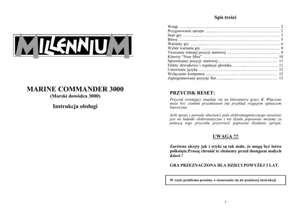 Spis treści Wstęp ……..........……………………………………………………… 2 Przygotowanie sprzętu ........…………………………………………… 2 Start gry ….…..........…………………………………………………… 3 Bitwa ……...........……………………………………………………… 5 Warianty gry …….......………………………………………………… 6 Wybór wariantu gry …................……………………………………… 8 Tworzenie własnej pozycji startowej ……..…………………………… 8 Klawisz “Near Miss” ………………………………………………… 10 Sprawdzanie pozycji startowej...…………………..………………… 11 Efekty dźwiękowe i regulacja głośnika………...…………………… 11 Ustawienie języka …………………………………………………… 12 Wyłączenie komputera .........………………………………………… 12 Zaprogramowane pozycje flot…...............…………………………… 13 MARINE COMMANDER 3000 (Morski dowódca 3000) Instrukcja obsługi PRZYCISK RESET: Przycisk resetujący znajduje się na klawiaturze gracz B. Włączony może być cienkim przedmiotem (na przykład rozgiętym spinaczem biurowym). Jeśli sprzęt z powodu obecności pola elektromagnetycznego narażony jest na ładunki elektrostatyczne i nie działa poprawnie możemy za pomocą tego przycisku przywrócić poprawne działanie sprzętu. UWAGA !!! Zarówno okręty jak i wtyki są tak małe, że mogą być łatwo połknięte.Proszę chronić te elementy przed dostępem małych dzieci ! GRA PRZEZNACZONA DLA DZIECI POWYŻEJ 3 LAT. W razie problemu prosimy o stosowanie się do poniższej instrukcji. 1 Wstęp Marine Commander 3000 posiada 6 różnych gier, bazujących na znanej “Bitwie morskiej”, w którą z pewnością grałeś już na papierze w kratkę. Tutaj możesz opcjonalnie grać przeciwko komputerowi lub przyjacielowi. Każdy gracz ma flotę złożoną z 5 okrętów różnych wielkości. Te umieszczane są na „oceanie“, powierzchni o wymiarze 10 x 10 pól. Ważne jest, że nie widzi się, gdzie znajdują się okręty przeciwnika. Gracze na przemian mają swój ruch; każdy odpala swoją rakietę na określone pole znajdujące się na ocenia przeciwnika. Okręt przeciwnika zostaje zatopiony, jeśli trafione zostaną wszystkie pola, na których był umieszczony. Kto jako pierwszy zatopi wszystkie okręty przeciwnika wygrywa grę. Przygotowanie sprzętu Włóż cztery baterie typu “AA”(LR6). Zwróć koniecznie uwagę na prawidłową biegunowość! (Znak + na baterii musi odpowiadać znakowi + na sprzęcie ) Następnie powinniśmy usłyszeć odgłosy bitwy i komputer mówi „Sea battle”, później „enter ships”. Podnieść teraz obydwie górne klapy ostrożnie jak pokazuje rysunek i ustaw je. Jeśli grasz przeciwko przyjacielowi ustaw komputer pomiędzy Wami, tak żebyście nie widzieli nawzajem swoich oceanów. Nad każdym oceanem znajduje się klawiatura dowolnego gracza. Klawiatura jednej ze stron posiada 5 dodatkowych klawiszy: NEW GAME, START, NEAR MISS, VOLUME i ON/SAVE. Gracz po tej stronie to gracz A, jego przeciwnik to gracz B. Jeśli grasz przeciwko komputerowi jesteś zawsze graczem A. Jeśli komputer nie reaguje na żaden klawisz, sprawdź czy jest włączony i czy wszystkie baterie funkcjonują prawidłowo. Jeśli wszystko jest w porządku naciśnij przycisk RESET znajdujący się po stronie gracza B. Wraz z komputerem otrzymujesz: – po woreczku z białymi i czerwonymi wtykami do zaznaczania już ostrzelanych i trafionych pól – dwie floty okrętów, gdzie każdy z graczy posiada: jeden lotniskowiec (zajmuje 5 pól) jeden krążownik (4 pola) dwie fregaty (3 pola) jedną kanonierkę (2 pola) Lotniskowiec Krążownik Fregata Fregata Kanonierka Jeśli nie włożyłeś nowych baterii, włącz teraz komputer klawiszem ON/SAVE. Teraz każdy ma przed sobą dwa obszary o rozmiarach 10 x 10 pól. Dolny obszar to Twój własny ocean, na którym ustawiasz Twoją flotę. Górny obszar odpowiada oceanowi Twojego przeciwnika, to arena na której planujesz Twoje ataki i zaznaczasz już ostrzelane pola. Obszary oznaczone są na brzegach liczbami 1-10 u góry i literami A-J z boku. Każde pojedyncze pole identyfikowane jest dokładnie poprzez jedną liczbę i jedną literę. Pole u góry po prawej to A10; pole na dole po lewej to J1 itd. 2 Start gry Zaczynamy teraz najprostszą z 6 gier, bitwę morską. – naciśnij klawisz NEW GAME.Komputer mówi “sea battle“ – naciśnij teraz ENTER/FIRE na klawiaturze gracza A. Teraz słyszymy odgłosy bitwy i komputer mówi jeszcze raz “sea battle”. Teraz słyszymy “wysoki-niski” dźwięk, i komputer mówi „enter ships- ustaw okręty”. Teraz musi być ustawiona flota gracza A. Najprościej będzie jeśli wybierzemy jedną ze 120 zaprogramowanych pozycji. Ustawienia znajdziesz na stronach 13-15. Alternatywą jest zaprogramowanie własnej pozycji jak opisano na stronie 8. 3 Załóżmy, wybrałeś pozycję nr 29. Tabela pokazuje następujące dane: Pozycja 29 Kanonierka B1-B2 Fregata D7-F7 Fregata J3-J5 Krążownik F1-I1 Lotniskowiec C4-G4 Umocuj teraz Twoją kanonierkę w polach B1 i B2. Pierwsza fregata umocowana jest w polach D7 do F7 itd. Jeśli już wszystkie okręty Twojej floty zostały prawidłowo umocowane na oceanie ustawienie powinno wyglądać jak na rysunku obok. Bitwa Teraz komputer mówi: „enter target“. Jeśli grasz przeciwko komputerowi powinieneś zacząć. Jeśli grasz przeciwko przyjacielowi grę może rozpocząć każdy z Was. Podaj teraz na Twojej klawiaturze współrzędne pola, na które chcesz strzelić w oceanie Twojego przeciwnika. Naciśnij potem ENTER/FIRE. Teraz słyszysz jak rakieta jest odpalana. Przykład: chcesz strzelić na pole D8. Naciśnij najpierw klawisz dla litery D. Potem naciśnij kla