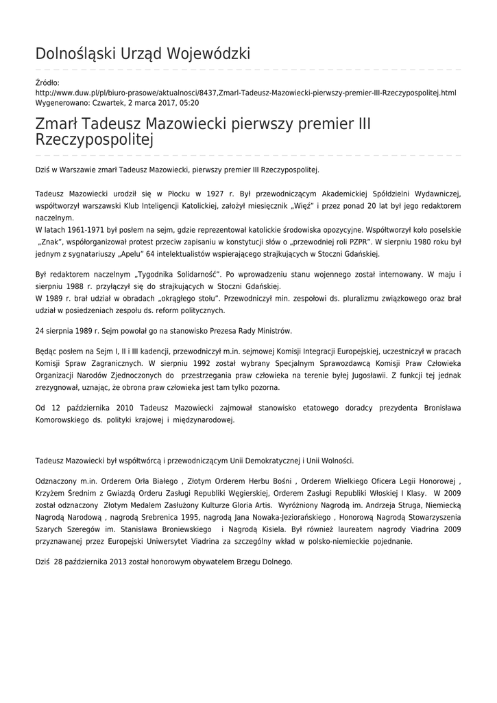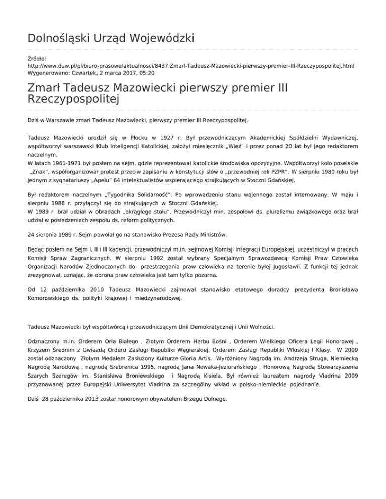 Dolnośląski Urząd Wojewódzki Źródło: http://www.duw.pl/pl/biuro-prasowe/aktualnosci/8437,Zmarl-Tadeusz-Mazowiecki-pierwszy-premier-III-Rzeczypospolitej.html Wygenerowano: Czwartek, 2 marca 2017, 05:20 Zmarł Tadeusz Mazowiecki pierwszy premier III Rzeczypospolitej Dziś w Warszawie zmarł Tadeusz Mazowiecki, pierwszy premier III Rzeczypospolitej. Tadeusz Mazowiecki urodził się w Płocku w 1927 r. Był przewodniczącym Akademickiej Spółdzielni Wydawniczej, współtworzył warszawski Klub Inteligencji Katolickiej, założył miesięcznik „Więź” i przez ponad 20 lat był jego redaktorem naczelnym. W latach 1961-1971 był posłem na sejm, gdzie reprezentował katolickie środowiska opozycyjne. Współtworzył koło poselskie „Znak”, współorganizował protest przeciw zapisaniu w konstytucji słów o „przewodniej roli PZPR”. W sierpniu 1980 roku był jednym z sygnatariuszy „Apelu” 64 intelektualistów wspierającego strajkujących w Stoczni Gdańskiej. Był redaktorem naczelnym „Tygodnika Solidarność”. Po wprowadzeniu stanu wojennego został internowany. W maju i sierpniu 1988 r. przyłączył się do strajkujących w Stoczni Gdańskiej. W 1989 r. brał udział w obradach „okrągłego stołu”. Przewodniczył min. zespołowi ds. pluralizmu związkowego oraz brał udział w posiedzeniach zespołu ds. reform politycznych. 24 sierpnia 1989 r. Sejm powołał go na stanowisko Prezesa Rady Ministrów. Będąc posłem na Sejm I, II i III kadencji, przewodniczył m.in. sejmowej Komisji Integracji Europejskiej, uczestniczył w pracach Komisji Spraw Zagranicznych. W sierpniu 1992 został wybrany Specjalnym Sprawozdawcą Komisji Praw Człowieka Organizacji Narodów Zjednoczonych do przestrzegania praw człowieka na terenie byłej Jugosławii. Z funkcji tej jednak zrezygnował, uznając, że obrona praw człowieka jest tam tylko pozorna. Od 12 października 2010 Tadeusz Mazowiecki zajmował stanowisko etatowego doradcy prezydenta Bronisława Komorowskiego ds. polityki krajowej i międzynarodowej. Tadeusz Mazowiecki był współtwórcą i przewodniczącym Unii Demokratycznej i Unii Wolności. Odznaczony m.in. Orderem Orła Białego , Złotym Orderem Herbu Bośni , Orderem Wielkiego Oficera Legii Honorowej , Krzyżem Średnim z Gwiazdą Orderu Zasługi Republiki Węgierskiej, Orderem Zasługi Republiki Włoskiej I Klasy. W 2009 został odznaczony Złotym Medalem Zasłużony Kulturze Gloria Artis. Wyróżniony Nagrodą im. Andrzeja Struga, Niemiecką Nagrodą Narodową , nagrodą Srebrenica 1995, nagrodą Jana Nowaka-Jeziorańskiego , Honorową Nagrodą Stowarzyszenia Szarych Szeregów im. Stanisława Broniewskiego i Nagrodą Kisiela. Był również laureatem nagrody Viadrina 2009 przyznawanej przez Europejski Uniwersytet Viadrina za szczególny wkład w polsko-niemieckie pojednanie. Dziś 28 października 2013 został honorowym obywatelem Brzegu Dolnego. Fot. DUW Drukuj Generuj PDF Powiadom znajomego Wstecz liczba wejść: 965