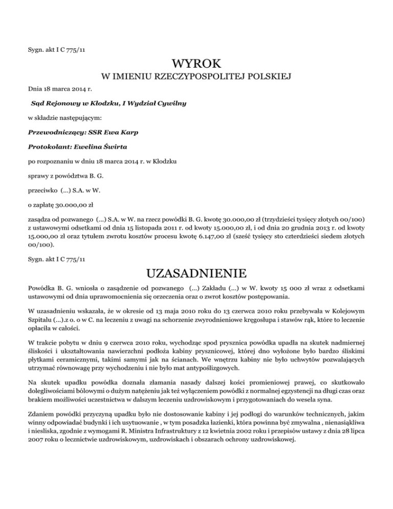 Sygn. akt I C 775/11 WYROK W IMIENIU RZECZYPOSPOLITEJ POLSKIEJ Dnia 18 marca 2014 r. Sąd Rejonowy w Kłodzku, I Wydział Cywilny w składzie następującym: Przewodniczący: SSR Ewa Karp Protokolant: Ewelina Świrta po rozpoznaniu w dniu 18 marca 2014 r. w Kłodzku sprawy z powództwa B. G. przeciwko (...) S.A. w W. o zapłatę 30.000,00 zł zasądza od pozwanego (...) S.A. w W. na rzecz powódki B. G. kwotę 30.000,00 zł (trzydzieści tysięcy złotych 00/100) z ustawowymi odsetkami od dnia 15 listopada 2011 r. od kwoty 15.000,00 zł, i od dnia 20 grudnia 2013 r. od kwoty 15.000,00 zł oraz tytułem zwrotu kosztów procesu kwotę 6.147,00 zł (sześć tysięcy sto czterdzieści siedem złotych 00/100). Sygn. akt I C 775/11 UZASADNIENIE Powódka B. G. wniosła o zasądzenie od pozwanego (...) Zakładu (...) w W. kwoty 15 000 zł wraz z odsetkami ustawowymi od dnia uprawomocnienia się orzeczenia oraz o zwrot kosztów postępowania. W uzasadnieniu wskazała, że w okresie od 13 maja 2010 roku do 13 czerwca 2010 roku przebywała w Kolejowym Szpitalu (...).z o. o w C. na leczeniu z uwagi na schorzenie zwyrodnieniowe kręgosłupa i stawów rąk, które to leczenie opłaciła w całości. W trakcie pobytu w dniu 9 czerwca 2010 roku, wychodząc spod prysznica powódka upadła na skutek nadmiernej śliskości i ukształtowania nawierzchni podłoża kabiny prysznicowej, której dno wyłożone było bardzo śliskimi płytkami ceramicznymi, takimi samymi jak na ścianach. We wnętrzu kabiny nie było uchwytów pozwalających utrzymać równowagę przy wychodzeniu i nie było mat antypoślizgowych. Na skutek upadku powódka doznała złamania nasady dalszej kości promieniowej prawej, co skutkowało dolegliwościami bólowymi o dużym natężeniu jak też wyłączeniem powódki z normalnej egzystencji na długi czas oraz brakiem możliwości uczestnictwa w dalszym leczeniu uzdrowiskowym i przygotowaniach do wesela syna. Zdaniem powódki przyczyną upadku było nie dostosowanie kabiny i jej podłogi do warunków technicznych, jakim winny odpowiadać budynki i ich usytuowanie , w tym posadzka łazienki, która powinna być zmywalna , nienasiąkliwa i niesliska, zgodnie z wymogami R. Ministra Infrastruktury z 12 kwietnia 2002 roku i przepisów ustawy z dnia 28 lipca 2007 roku o lecznictwie uzdrowiskowym, uzdrowiskach i obszarach ochrony uzdrowiskowej. Powódka wskazała, że nietypowo śliska powierzchnia podłogi kabiny i łazienki Szpitala (...) nie spełniała wskazanych wymogów co było przyczyna upadku powódki, która nie mogła zachować większej ostrożności ani zapobiec upadkowi i jegio skutkom. Strona pozwana (...) S.A. w odpowiedzi na pozew wniosła o oddalenie powództwa w całości i podniosła, że wprawdzie potwierdza, że udzielała w dniu zdarzenia ochrony ubezpieczeniowej Kolejowemu szpitalowi uzdrowiskowemu z tytułu umowy obowiązkowego ubezpieczenia odpowiedzialności cywilnej zakładów opieki zdrowotnej, ale kwestionuje powództwo zarówno co do zasady jak i wysokości. Pozwany wskazał, że szkoda na ciele powódki nie jest następstwem czynu niedozwolonego, bo nie udowodnione zostały czyn niedozwolony oraz związek przyczynowy ze szkoda na ciele powódki w postaci urazu kończyny górnej. Strona pozwana sprzeciwiła się żądaniu pozwu w zakresie zadośćuczynienia, bowiem jest nadmiernie wygórowane i nieadekwatne do rozmiaru krzywdy jakiej doznała powódka. (...) wskazał także na krótkotrwały charakter leczenia powódki, nie przekraczający kilku tygodni i zarzuciła, że zdarzenie, w którym poszkodowana brała udział mkiało charakter nieszczęśliwego wypadku , a powódka nie udowodniła zawinienia ubezpieczonego oraz związku przyczynowego między zachowaniem się ubezpieczonego a wtstapieniem szkody, która uzasadniałaby zasądzenie na jej rzecz zadośćuczynienia. Po sporządzeniu opinii przez powołanego biegłego powódka rozszerzyła powództwo do kwoty 30 000 złotych, a strona pozwana wniosła o jego oddalenie. Sąd ustalił następujący stan faktyczny: B. G. przebywała w okresie od 13 maja 2010 roku do 13 czerwca 2010 roku w Kolejowym Szpitalu (...).z o. o w C. na leczeniu z uwagi na schorzenie zwyrodnieniowe kręgosłupa i stawów rąk, które to leczenie opłaciła w całości, dopłacając za podwyższony standard pokoju. W trakcie pobytu w dniu 9 czerwca 2010 roku, wychodząc spod prysznica, powódka upadła na skutek nadmiernej śliskości i ukształtowania nawierzchni podłoża kabiny prysznicowej, której dno wyłożone było bardzo śliskimi płytkami ceramicznymi, takimi samymi jak na ścianach. We wnętrzu kabiny nie było uchwytów pozwalających utrzymać równowagę przy wychodzeniu i nie było mat antypoślizgowych. Kuracjuszka J. M. przebywająca w pokoju z powódką też ślizgała się na płytkach podłogi kabiny wychodząc spod prysznica. Płytki w kabinie były śliskie i błyszczące tak jak podłoga łazienki. Zarząd Szpitala przed zdarzeniem zlecił remont budynku D, w którym przebywała powódka i po remoncie budynek został dopuszczony do eksploatacji. Parametry antypoślizgowe płytek przez szpital nie były badane. Płytki kupował wykonawca. Dowód: - karta informacyjna K- 12 - zdjęcia podłoża kabiny K- 17 - zaświadczenie lekarskie K- 18 - płyta k- 105 , wydruki K- 123-124 - przesłuchanie świadka W. K. przed Sądem Rejonowym w Aleksandrowie Kujawskim K- 125 - przesłuchanie świadka J. M. przed Sądem w Lubinie K- 140 Po upadku powódki J. markowska wezwała pielęgniarkę i wraz z nia odprowadziła powódkę do lekarza. Na pogotowie czekali wspólnie 2 godziny. Złamanie było skomplikowane z przemieszczeniem i żle się zrosło powodując wykrzywienie ręki powódki i jej niesprawność. Po wypadku współlokatorka pomagała powódce , czesała ją , karmiła . Powódka skarzyła się na ból ręki i głowy, w która upadając uderzyła się. Przed wypadkiem powódka nie miała ograniczeń ruchowych . Na skut
