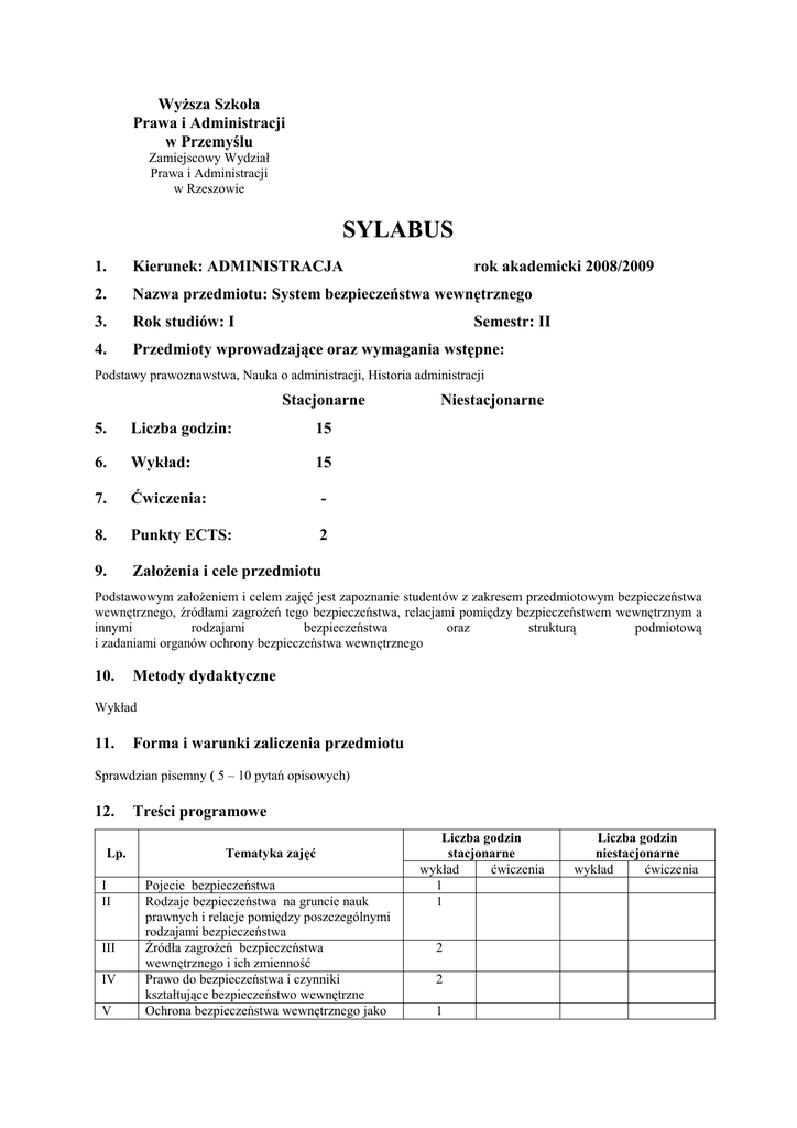 WyŜsza Szkoła Prawa i Administracji w Przemyślu Zamiejscowy Wydział Prawa i Administracji w Rzeszowie SYLABUS 1. Kierunek: ADMINISTRACJA rok akademicki 2008/2009 2. Nazwa przedmiotu: System bezpieczeństwa wewnętrznego 3. Rok studiów: I 4. Przedmioty wprowadzające oraz wymagania wstępne: Semestr: II Podstawy prawoznawstwa, Nauka o administracji, Historia administracji Stacjonarne 5. Liczba godzin: 15 6. Wykład: 15 7. Ćwiczenia: - 8. Punkty ECTS: 2 9. ZałoŜenia i cele przedmiotu Niestacjonarne Podstawowym załoŜeniem i celem zajęć jest zapoznanie studentów z zakresem przedmiotowym bezpieczeństwa wewnętrznego, źródłami zagroŜeń tego bezpieczeństwa, relacjami pomiędzy bezpieczeństwem wewnętrznym a innymi rodzajami bezpieczeństwa oraz strukturą podmiotową i zadaniami organów ochrony bezpieczeństwa wewnętrznego 10. Metody dydaktyczne Wykład 11. Forma i warunki zaliczenia przedmiotu Sprawdzian pisemny ( 5 – 10 pytań opisowych) 12. Lp. I II III IV V Treści programowe Tematyka zajęć Pojecie bezpieczeństwa Rodzaje bezpieczeństwa na gruncie nauk prawnych i relacje pomiędzy poszczególnymi rodzajami bezpieczeństwa Źródła zagroŜeń bezpieczeństwa wewnętrznego i ich zmienność Prawo do bezpieczeństwa i czynniki kształtujące bezpieczeństwo wewnętrzne Ochrona bezpieczeństwa wewnętrznego jako Liczba godzin stacjonarne wykład ćwiczenia 1 1 2 2 1 Liczba godzin niestacjonarne wykład ćwiczenia VI VII VIII IX X 13. zadanie państwa Integracja europejska a bezpieczeństwo wewnętrzne Klasyfikacja podmiotów odpowiedzialnych za ochronę bezpieczeństwa wewnętrznego Organy administracji rządowej w systemie bezpieczeństwa wewnętrznego Modele administracji bezpieczeństwa wewnętrznego w wybranych państwach Obywatel a bezpieczeństwo wewnętrzne 1 1 3 2 1 Literatura podstawowa Pieprzny S., Ochrona bezpieczeństwa i porządku publicznego w prawie administracyjnym, Rzeszów 2007. Pieprzny S., Administracja bezpieczeństwa i porządku publicznego, Rzeszów 2008. Ura E., Rajchel K., Pomykała M., Pieprzny S., Bezpieczeństwo wewnętrzne we współczesnym państwie, Rzeszów 2008. 14. Literatura uzupełniająca Jakubczak R., Obrona narodowa w tworzeniu bezpieczeństwa III RP, Wyd. Bellona, 2003. Misiuk A., Administracja spraw wewnętrznych w Polsce, Wyd. UWM Olsztyn 2005. 15. Nazwisko osoby prowadzącej zajęcia na studiach stacjonarnych - wykład: dr hab. Stanisław Pieprzny prof. nadzw.