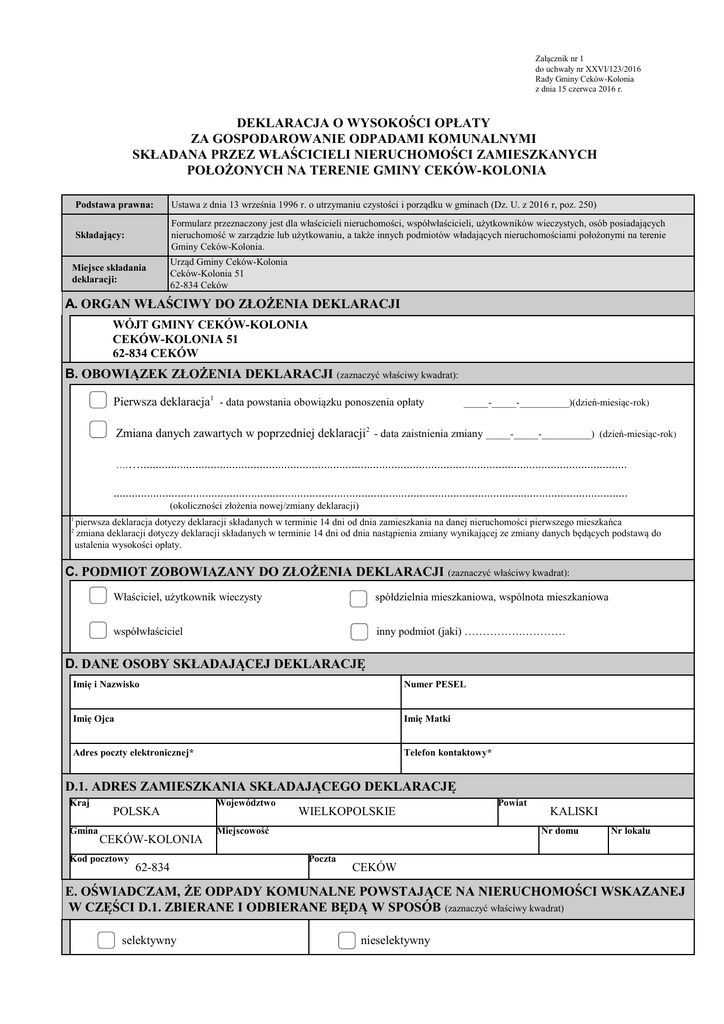 Załącznik nr 1 do uchwały nr XXVI/123/2016 Rady Gminy Ceków-Kolonia z dnia 15 czerwca 2016 r. DEKLARACJA O WYSOKOŚCI OPŁATY ZA GOSPODAROWANIE ODPADAMI KOMUNALNYMI SKŁADANA PRZEZ WŁAŚCICIELI NIERUCHOMOŚCI ZAMIESZKANYCH POŁOŻONYCH NA TERENIE GMINY CEKÓW-KOLONIA Podstawa prawna: Ustawa z dnia 13 września 1996 r. o utrzymaniu czystości i porządku w gminach (Dz. U. z 2016 r, poz. 250) Składający: Formularz przeznaczony jest dla właścicieli nieruchomości, współwłaścicieli, użytkowników wieczystych, osób posiadających nieruchomość w zarządzie lub użytkowaniu, a także innych podmiotów władających nieruchomościami położonymi na terenie Gminy Ceków-Kolonia. Miejsce składania deklaracji: Urząd Gminy Ceków-Kolonia Ceków-Kolonia 51 62-834 Ceków A. ORGAN WŁAŚCIWY DO ZŁOŻENIA DEKLARACJI WÓJT GMINY CEKÓW-KOLONIA CEKÓW-KOLONIA 51 62-834 CEKÓW B. OBOWIĄZEK ZŁOŻENIA DEKLARACJI (zaznaczyć właściwy kwadrat): Pierwsza deklaracja1 - data powstania obowiązku ponoszenia opłaty _____-_____-__________)(dzień-miesiąc-rok) Zmiana danych zawartych w poprzedniej deklaracji2 - data zaistnienia zmiany _____-_____-__________) (dzień-miesiąc-rok) ….…............................................................................................................................................................... ........................................................................................................................................................................ (okoliczności złożenia nowej/zmiany deklaracji) 1 2 pierwsza deklaracja dotyczy deklaracji składanych w terminie 14 dni od dnia zamieszkania na danej nieruchomości pierwszego mieszkańca zmiana deklaracji dotyczy deklaracji składanych w terminie 14 dni od dnia nastąpienia zmiany wynikającej ze zmiany danych będących podstawą do ustalenia wysokości opłaty. C. PODMIOT ZOBOWIĄZANY DO ZŁOŻENIA DEKLARACJI (zaznaczyć właściwy kwadrat): Właściciel, użytkownik wieczysty spółdzielnia mieszkaniowa, wspólnota mieszkaniowa współwłaściciel inny podmiot (jaki) …………….………… D. DANE OSOBY SKŁADAJĄCEJ DEKLARACJĘ Imię i Nazwisko Numer PESEL Imię Ojca Imię Matki Adres poczty elektronicznej* Telefon kontaktowy* D.1. ADRES ZAMIESZKANIA SKŁADAJĄCEGO DEKLARACJĘ Kraj Gmina POLSKA CEKÓW-KOLONIA Kod pocztowy 62-834 Województwo WIELKOPOLSKIE Miejscowość Powiat KALISKI Nr domu Poczta Nr lokalu CEKÓW E. OŚWIADCZAM, ŻE ODPADY KOMUNALNE POWSTAJĄCE NA NIERUCHOMOŚCI WSKAZANEJ W CZĘŚCI D.1. ZBIERANE I ODBIERANE BĘDĄ W SPOSÓB (zaznaczyć właściwy kwadrat) selektywny nieselektywny F. OBLICZENIE WYSOKOŚCI OPŁATY ZA GOSPODAROWANIE ODPADAMI KOMUNALNYMI 1. Oświadczam, że na terenie nieruchomości wskazanej w części D.1. zamieszkuje ….................. (podać liczbę mieszkańców) 2.Stawka opłaty okreslona w uchwale Rady Gminy Ceków-Kolonia w sprawie metody ustalenia opłaty za gospodarowanie odpadami komunalnymi oraz ustalenia tej opłaty …...........................zł/osobę 3. Wysokość miesięcznej opłaty za gospodarowanie odpadami komunalnymi wynosi: ..……………………… stawka opłaty zgodnie z uchwałą X ………………………….. ilość osób zamieszkujących nieruchomość = ……………………………. miesięczna opłata G. OŚWIADCZENIE I PODPIS ….......................................................... (miejscowość i data) ........................................................................... (czytelny podpis) I. ADNOTACJE URZĘDOWE Pouczenie: Niniejsza deklaracja stanowi podstawę do wystawienia tytułu wykonawczego, zgodnie z przepisami ustawy z dnia 17 czerwca 1966 r. o postępowaniu egzekucyjnym w administracji. ( t.j. Dz. U. z 2016 r. poz. 599 ze zm.). Objaśnienia: 1. 2. 3. 4. 5. 6. 7. 8. 9. 10. Właściciel nieruchomości jest obowiązany złożyć deklarację o wysokości opłaty za gospodarowanie odpadami komunalnymi do siedziby Urzędu Gminy Ceków-Kolonia: w terminie 14 dni od dnia zamieszkania na danej nieruchomości pierwszego mieszkańca lub powstania na danej nieruchomości odpadów komunalnych. w ciagu 14 dni od dnia zaistnienia zmiany danych będących podstawą ustalenia wysokości naleznej opłaty za gospodarownie odpadami komunalnymi, w szczególności zmiany ilości zamieszkałych osób na terenie nieruchomosci lub przystapienia bądź odstąpienia od zbierania odpadów w sposób selektywny. Opłatę za gospodarowanie odpadami komunalnymi w zmienionej wysokości uiszcza się za miesiąc, w którym nastapiła zmiana. Wysokość zobowiązania określonego w deklaracji o wysokości opłaty za gospodarowanie odpadami komunalnymi obowiązuje za kolejne miesiące do czasu korekty deklaracji lub zmiany stawki opłat za gospodarowanie odpadami komunalnymi. W przypadku uchwalenia nowej stawki opłaty za gospodarowanie odpadami komunalnymi wójt gminy zawiadamia właściciela nieruchomości o wysokości opłaty za gospodarowanie odpadami komunalnymi wyliczonej jako iloczyn nowej stawki opłaty i danych podanych w deklaracji. W takim przypadku właściciel nieruchomości nie jest obowiązany do złożenia nowej deklaracji i uiszcza opłatę za gospodarowanie odpadami komunalnymi w wysokości podanej w zawiadomieniu. Sposób zbierania odpadów komunalnych będzie podlegał bieżącej kontroli. W przypadku nie wywiązania się z obowiązku selektywnego zbierania odpadów komunalnych właściwy organ w drodze decyzji naliczy opłatę za odprowadzanie odpadów zmieszanych wraz z zaległymi odsetkami. Obowiązek ponoszenia opłaty za gospodarowanie odpadami komunalnymi powstaje w przypadku nieruchomości zamieszkałych za każdy miesiąc, w którym na danej nieruchomości zamieszkuje mieszkaniec. W przypadku niezłożenia deklaracji w terminie określonym w deklaracji lub uzasadnionych wątpliwości co do danych zawartych w deklaracji, Wójt Gminy Ceków-Kolonia określi w drodze decyzji, w