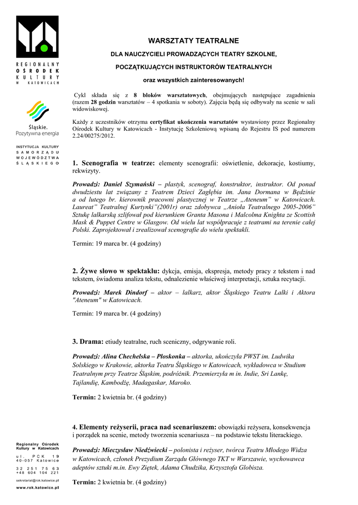WARSZTATY TEATRALNE DLA NAUCZYCIELI PROWADZĄCYCH TEATRY SZKOLNE, POCZĄTKUJĄCYCH INSTRUKTORÓW TEATRALNYCH oraz wszystkich zainteresowanych! Cykl składa się z 8 bloków warsztatowych, obejmujących następujące zagadnienia (razem 28 godzin warsztatów – 4 spotkania w soboty). Zajęcia będą się odbywały na scenie w sali widowiskowej. Każdy z uczestników otrzyma certyfikat ukończenia warsztatów wystawiony przez Regionalny Ośrodek Kultury w Katowicach - Instytucję Szkoleniową wpisaną do Rejestru IS pod numerem 2.24/00275/2012. 1. Scenografia w teatrze: elementy scenografii: oświetlenie, dekoracje, kostiumy, rekwizyty. Prowadzi: Daniel Szymański – plastyk, scenograf, konstruktor, instruktor. Od ponad dwudziestu lat związany z Teatrem Dzieci Zagłębia im. Jana Dormana w Będzinie a od lutego br. kierownik pracowni plastycznej w Teatrze „Ateneum” w Katowicach. Laureat” Teatralnej Kurtynki”(2001r) oraz zdobywca „Anioła Teatralnego 2005-2006” Sztukę lalkarską szlifował pod kierunkiem Granta Masona i Malcolma Knighta ze Scottish Mask & Puppet Centre w Glasgow. Od wielu lat współpracuje z teatrami na terenie całej Polski. Zaprojektował i zrealizował scenografie do wielu spektakli. Termin: 19 marca br. (4 godziny) 2. Żywe słowo w spektaklu: dykcja, emisja, ekspresja, metody pracy z tekstem i nad tekstem, świadoma analiza tekstu, odnalezienie właściwej interpretacji, sztuka recytacji. Prowadzi: Marek Dindorf – aktor – lalkarz, aktor Śląskiego Teatru Lalki i Aktora "Ateneum" w Katowicach. Termin: 19 marca br. (4 godziny) 3. Drama: etiudy teatralne, ruch sceniczny, odgrywanie roli. Prowadzi: Alina Chechelska – Płoskonka – aktorka, ukończyła PWST im. Ludwika Solskiego w Krakowie, aktorka Teatru Śląskiego w Katowicach, wykładowca w Studium Teatralnym przy Teatrze Śląskim, podróżnik. Przemierzyła m in. Indie, Sri Lankę, Tajlandię, Kambodżę, Madagaskar, Maroko. Termin: 2 kwietnia br. (4 godziny) 4. Elementy reżyserii, praca nad scenariuszem: obowiązki reżysera, konsekwencja i porządek na scenie, metody tworzenia scenariusza – na podstawie tekstu literackiego. Prowadzi: Mieczysław Niedźwiecki – polonista i reżyser, twórca Teatru Młodego Widza w Katowicach, członek Prezydium Zarządu Głównego TKT w Warszawie, wychowawca adeptów sztuki m.in. Ewy Ziętek, Adama Chudzika, Krzysztofa Globisza. Termin: 2 kwietnia br. (4 godziny) 5. Elementy teatru lalkowego: rodzaje lalek używanych w teatrze i ich konstrukcja, podstawy techniki animacji lalek, zasady obowiązujące w dobrym teatrze lalkowym i najczęściej popełniane błędy, maska i jej animacja. Prowadzi: Danuta Wyszogrodzka – Dindorf - aktorka – lalkarka związana była w przeszłości ze Śląskim Teatrem Lalki i Aktora „Ateneum” oraz z krakowskim Teatrem Lalki i Maski ”Groteska”. Prowadzi zajęcia teatralne z najmłodszymi przygotowując przedstawienia. Zasiada w jury konkursów recytatorskich i festiwali oraz przeglądów teatralnych. Termin: 16 kwietnia br. (4 godziny) 6. Elementy teatru ruchu: warsztat plastyki ciała i jego możliwości, elementy pantomimy, czystość wymowność gestu, twarz i spojrzenie. Prowadzi: Michał Sabat – instruktor teatralny, mim związany z wrocławskim Teatrem „Forma” Józefa Markockiego, aktor i założyciel Teatru „Imaginarium” Termin: 16 kwietnia br. (4 godziny) 7. Elementy teatru tańca: podstawy choreografii w teatrze, jak unikać błędów i jak uatrakcyjnić spektakl o elementy tańca, tańce wykorzystywane w przedstawieniach. Prowadzi: Monika Wachowicz – aktorka i tancerka, instruktor teatralny i pedagog, organizatorka imprez teatralnych, wcześniej związana m. in. z katowickim Teatrem Cogitatur, współpracuje także m.in. z duńskim teatrem Cantabile 2,wiceprezes Stowarzyszenia Teatralnego A PART. Termin: 30 kwietnia br. (4 godziny) 8. Zajęcia podsumowujące warsztaty teatralne Prowadzi: Mieczysław Niedźwiecki – polonista i reżyser, twórca Teatru Młodego Widza w Katowicach, członek Prezydium Zarządu Głównego TKT w Warszawie, wychowawca adeptów sztuki m.in. Ewy Ziętek, Adama Chudzika, Krzysztofa Globisza. Termin: 30 kwietnia br. (4 godziny) Partner: Miejski Dom Kultury „Koszutka” w Katowicach Szczegółowa informacja o warsztatach (patrz niżej) Szczegółowa informacja o warsztatach: Rozpoczęcie warsztatów 19 marca 2016 r. o godzinie 9.00 Zajęcia będą się odbywały w Miejskim Domu Kultury „Koszutka” w Katowicach przy ul. Grażyńskiego 47. (sala widowiskowa ze sceną) 4 spotkania (w soboty): 19.03.2016, 02.04.2016, 16.04.2016, 30.04.2016 (od 9.00 do 16.00) podzielone na 8 bloków tematycznych. Każdy z uczestników otrzyma certyfikat ukończenia warsztatów wystawiony przez Regionalny Ośrodek Kultury w Katowicach - Instytucję Szkoleniową wpisaną do Rejestru IS pod numerem 2.24/00275/2012. Koszt warsztatów od jednej osoby wynosi 350 złotych brutto i obejmuje: udział w warsztatach, materiały dydaktyczne oraz serwis kawowy i kanapki. UWAGA! Fakturę wystawimy dopiero po zakończeniu warsztatów na podstawie karty zgłoszenia. Termin zgłoszenia na warsztaty upływa w dniu 11 marca 2016 r. Przesłanie karty uczestnika faxem (32-251-75-63 wew. 112) lub e-mailem na adres: [email protected] lub [email protected] w postaci skanu karty z podpisem uczestnika. Zapisy i informacje: Regionalny Ośrodek Kultury w Katowicach ul. PCK 19, 40-057 Katowice www.rok.katowice.pl tel. 32/251-75-63 lub 32/201-77-80 [email protected] [email protected] UWAGA! Liczba miejsc ograniczona. Decyduje kolejność zgłoszeń.